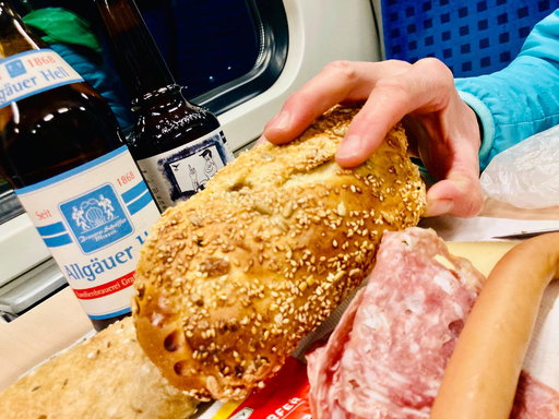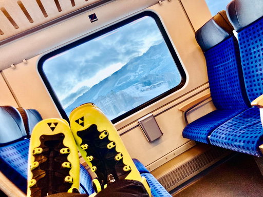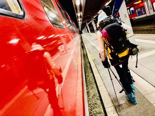 Der rote Bergsteigerzug nach Oberstdorf. Ohne Umsteigen stressfrei und klimafreundlich ins Tourenparadies. Herrliche Aussichten auf dem Flatscreen. Die Fahrt vergeht wie im Flug. Direkt neben dem Gleis ist der nagelneue Busbahnhof. Ideal verknüpft mit der Bahn. Hier die Linie 1 nach Baad nehmen. Fotos Michael Vitzthum