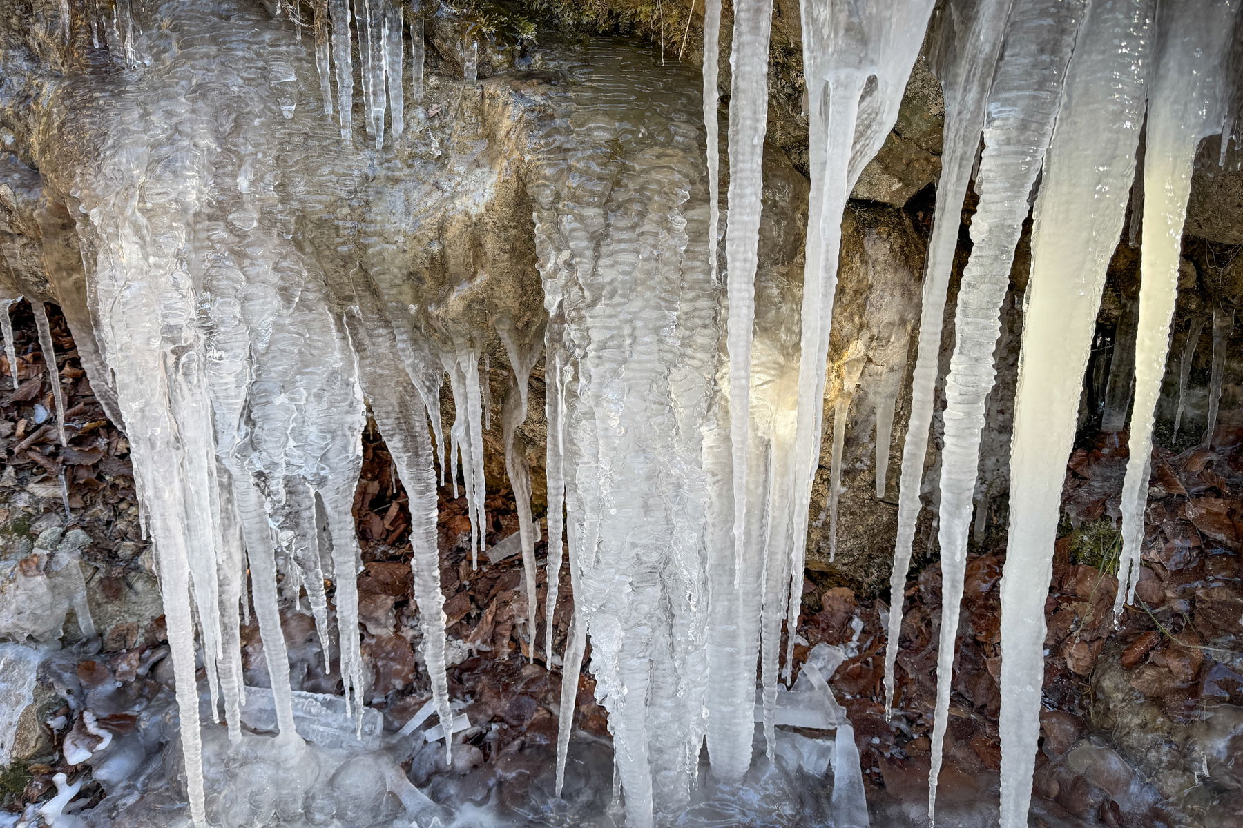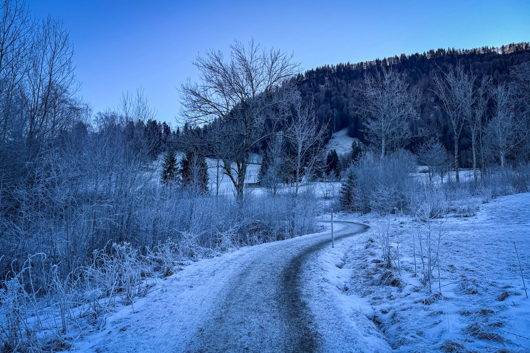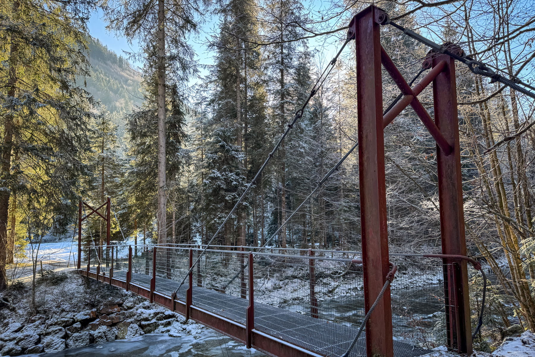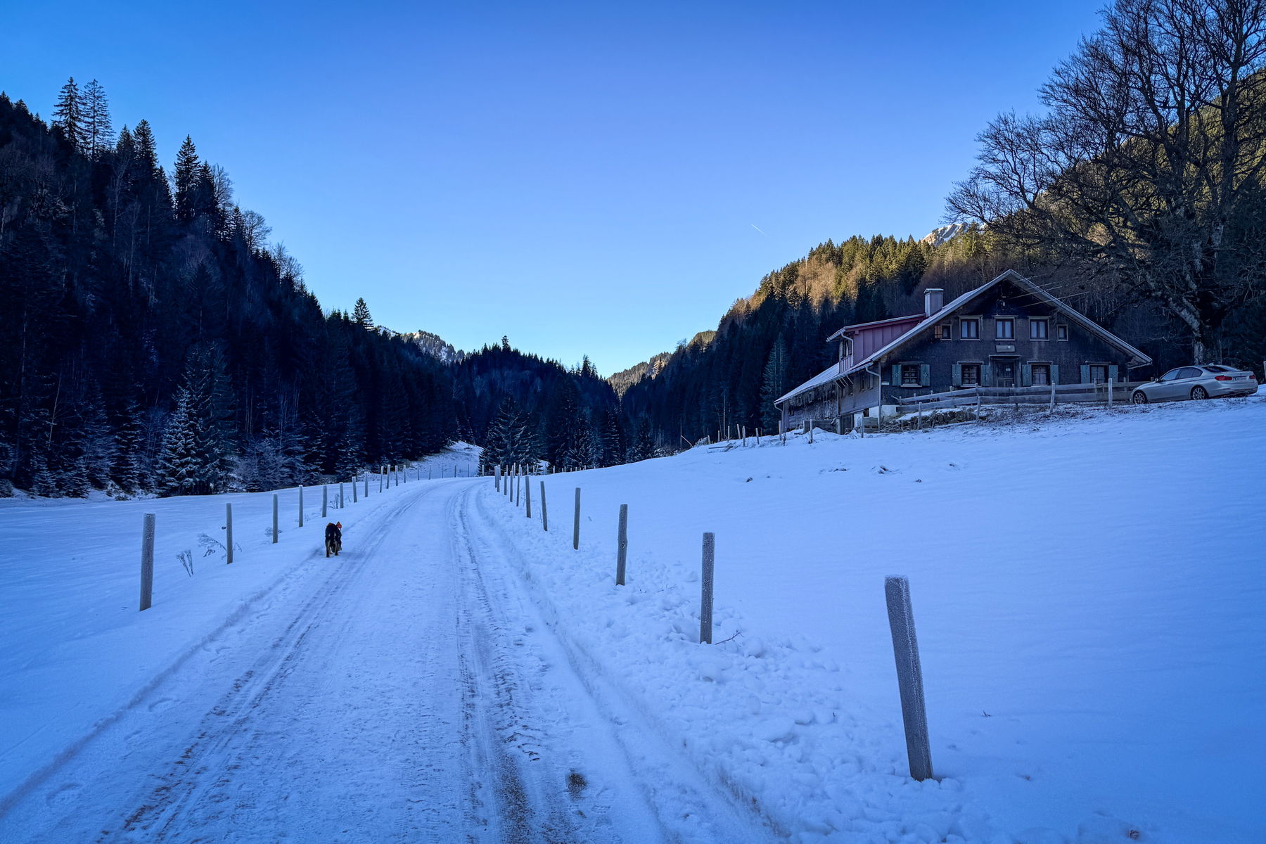 Ich muss zum Glück nicht auf den Bus warten (verkehrt stündlich, Fahrplan hängt auch an der Bergstation) sondern überquere hinterm Gebäude die Weißach. Dort geht es dann durch den Wald, teilweise mit Schnee, teilweise – wo die Sonne hinkam, es hatte ja vier Wochen nicht geschneit – schneefrei.