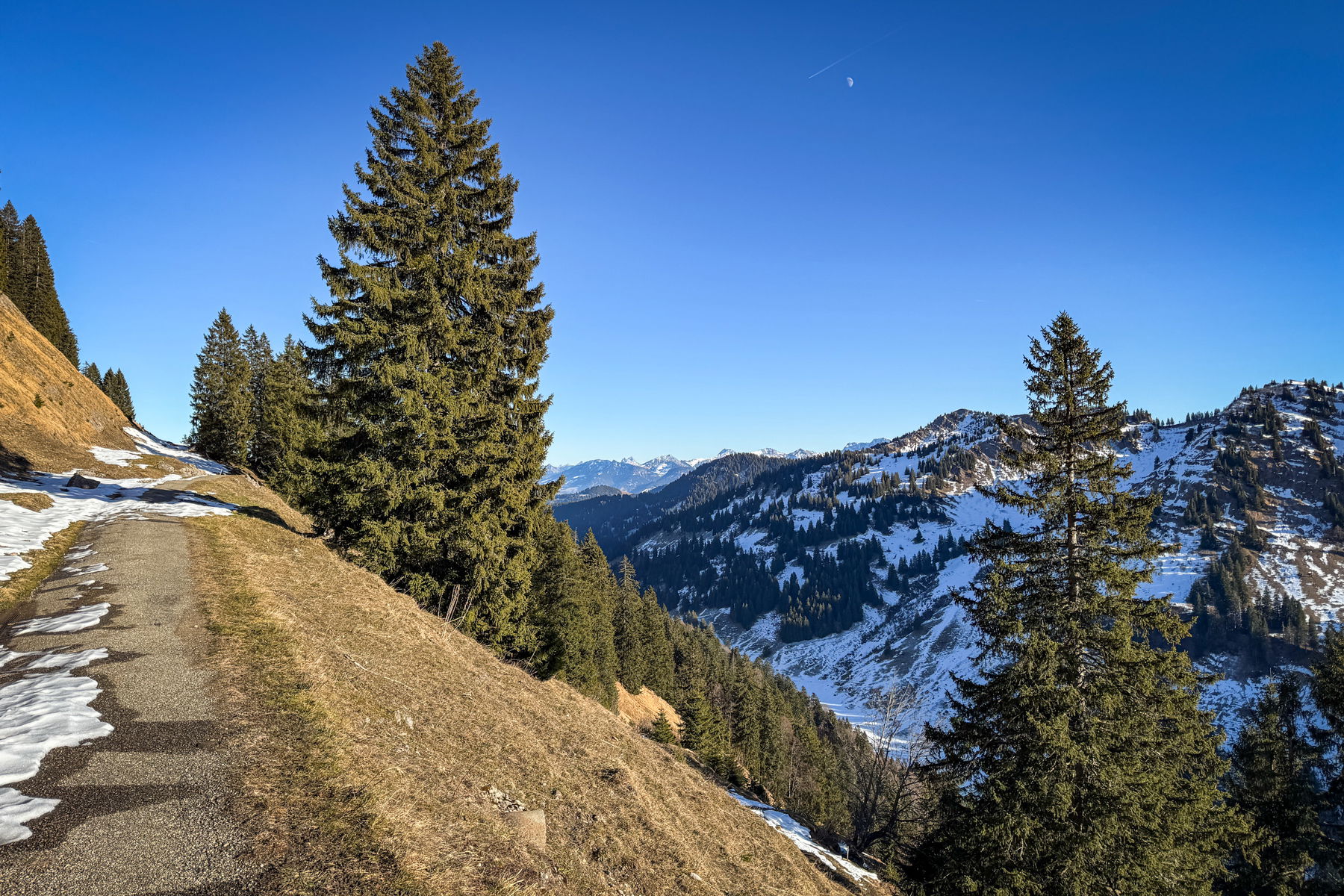 Nach 7 Kilometern ist man dann am Ende dieser Straße angelangt. Ab und zu gab es sonnige Abschnitte, das meiste aber lag im Schatten. Teilweise lag gar kein Schnee mehr auf der Straße und manche Wiesen waren auch grün. Der Weg ging nur leicht aufwärts. Ab jetzt beginnt dann der eigentliche Aufstieg.