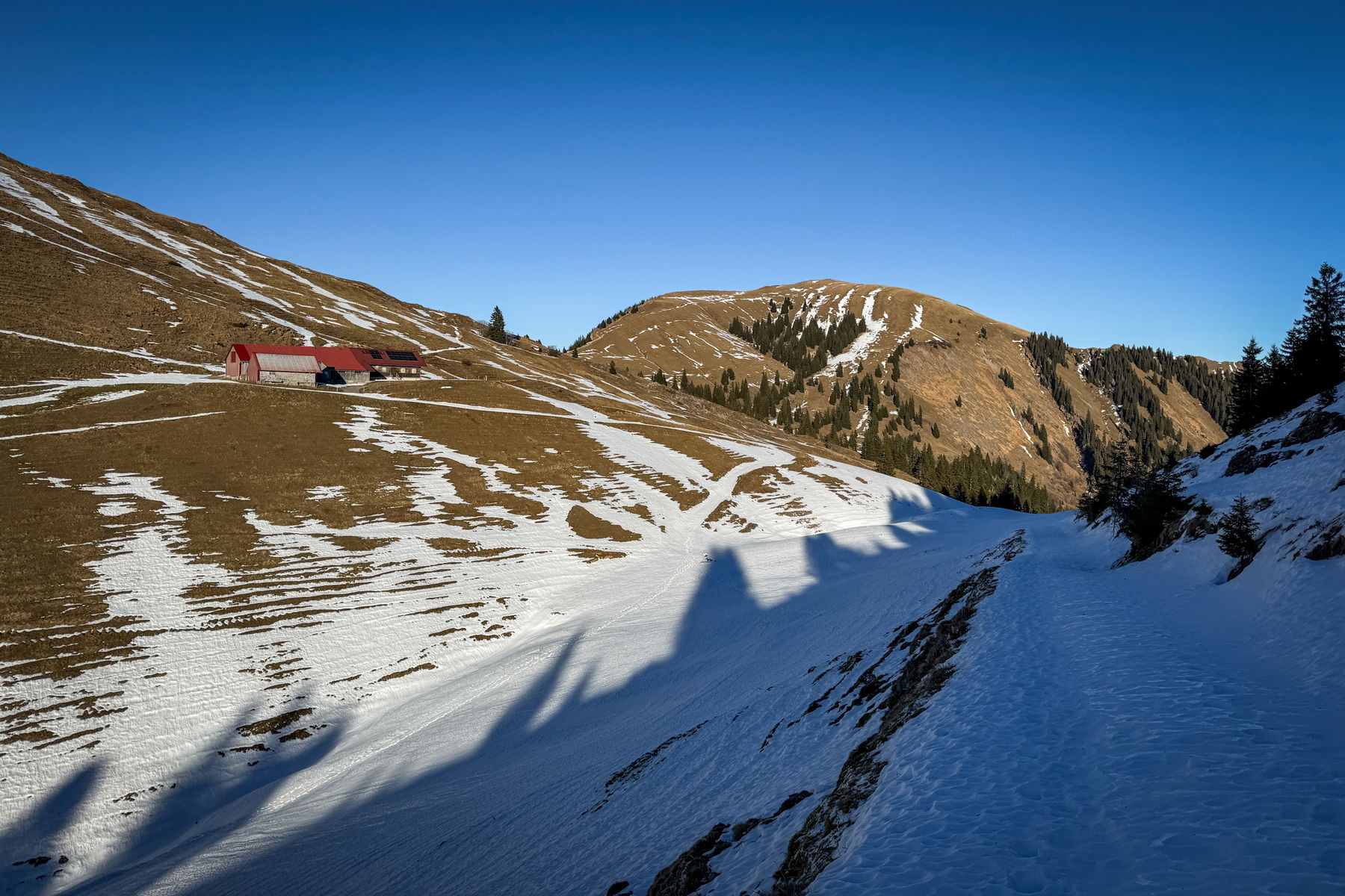 Dem Weg zu folgen ist nicht besonders schwer: der Hochgrat bzw. das Staufner Haus sind schon beschildert. Nach einer „Kurve“ kommt man vorbei an der Oberen Gelchenwang-Alpe. Während am schattigen Weg relativ tiefer Schnee liegt, ist der Südhang praktisch grün. Der Kontrast gefällt mir.