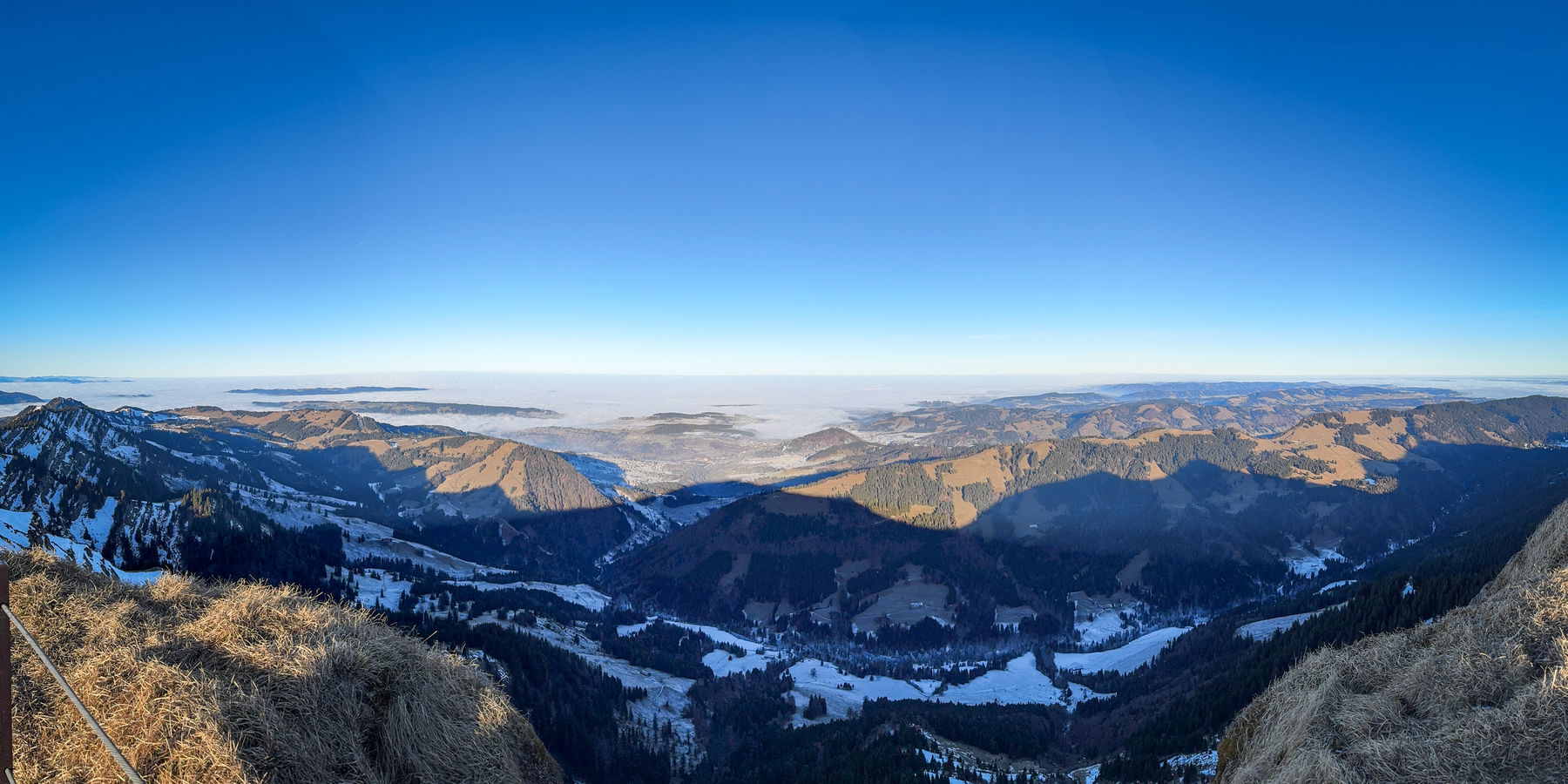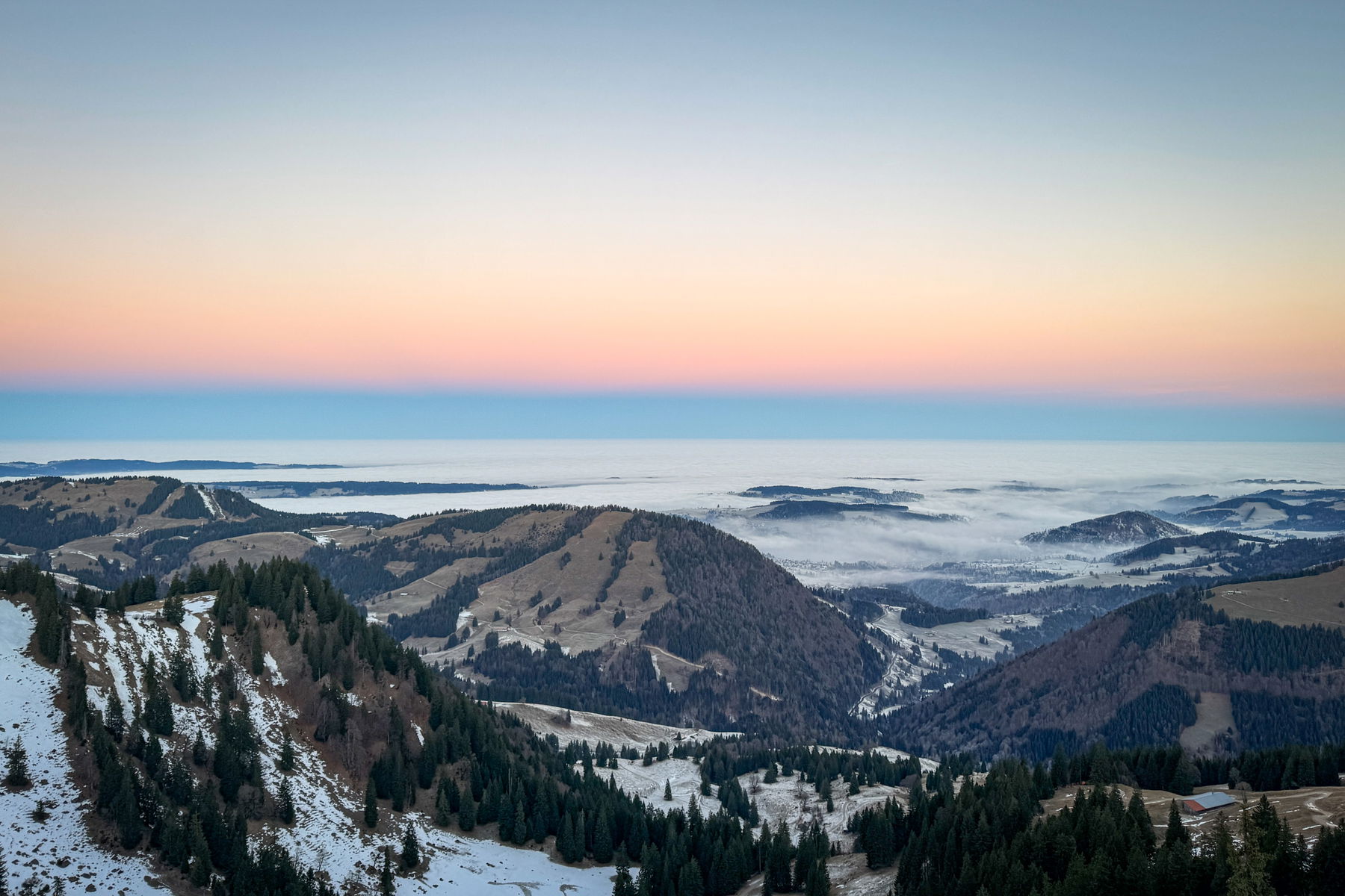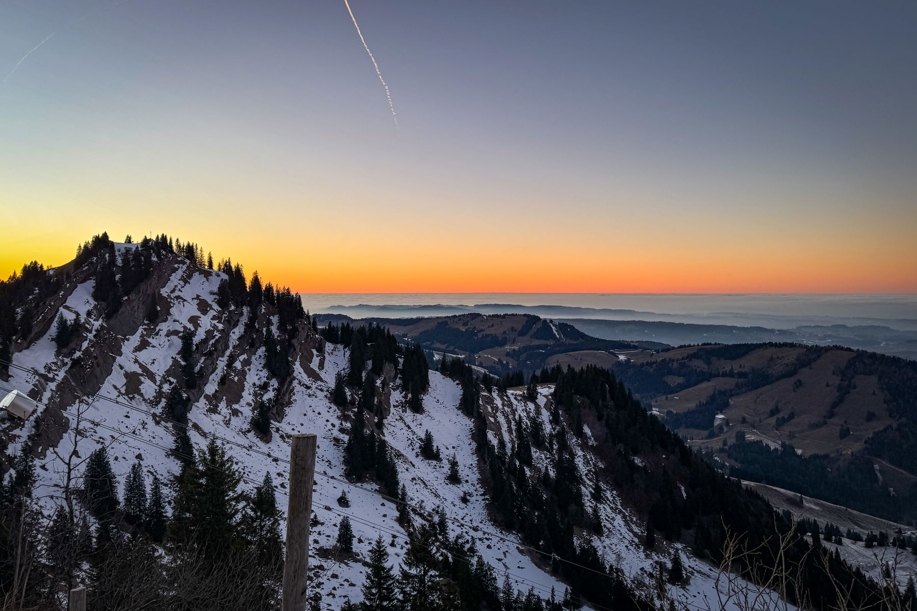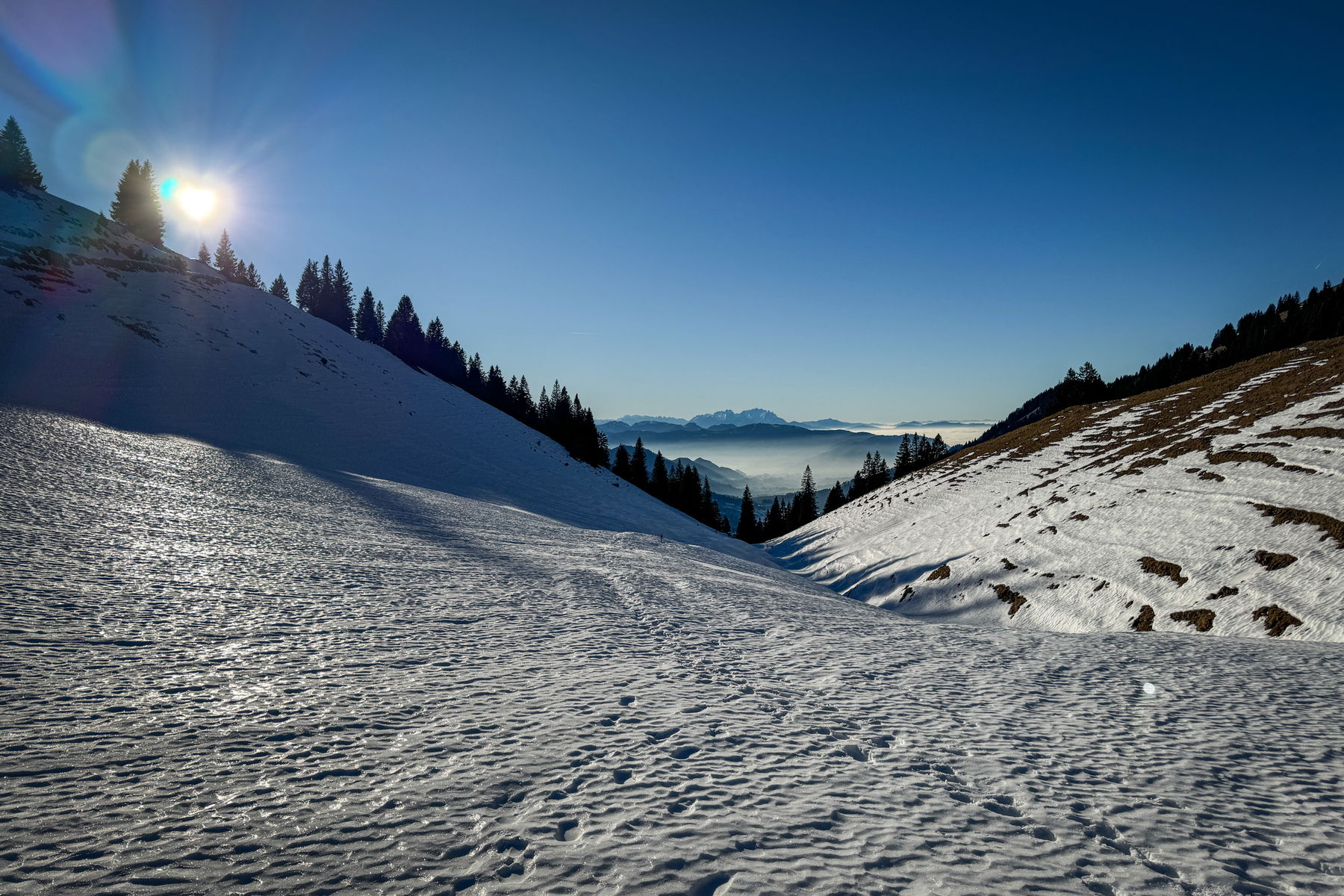 Der Nachteil, dass die Sonne so früh untergeht ist gleichzeitig der Vorteil: man muss für den Sonnenaufgang nicht früh aufstehen. Das Wetter war wieder perfekt und die Farben sind einfach mega. Wie man auf dem Bild aber auch sieht: es liegt kaum Schnee unten.