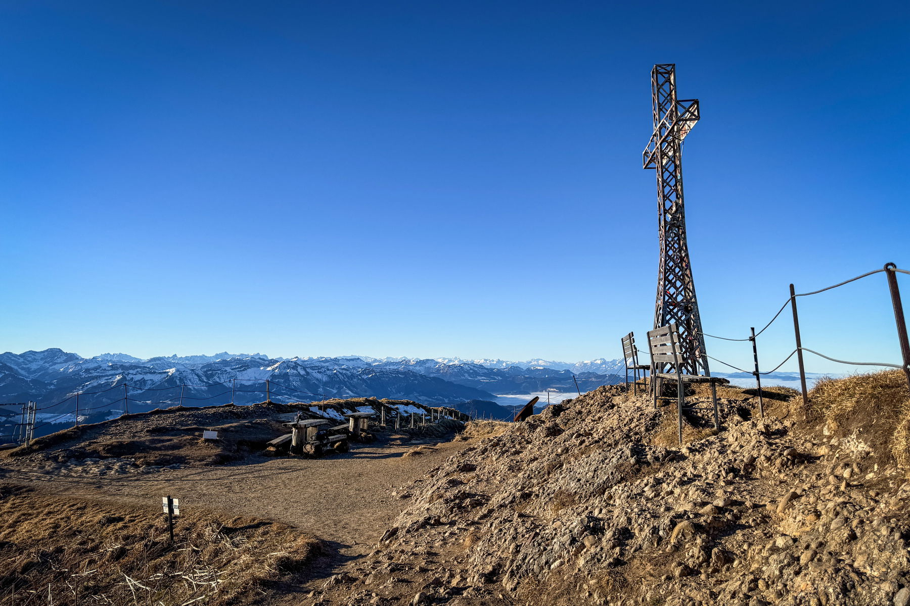Das Gipfelkreuz ist etwas anders als gewohnt, mir gefällt es. Man hat von hier einen wunderbaren Ausblick über die Allgäuer Alpen, bis zum Bodensee und Säntis rüber in den Westen. Vom vorgelagerten Allgäu sah man wegen des Hochnebels wenig. Man sieht aber beispielsweise auch rüber zum Immenstädter Horn (die Tour bin ich paar Monate davor gegangen).