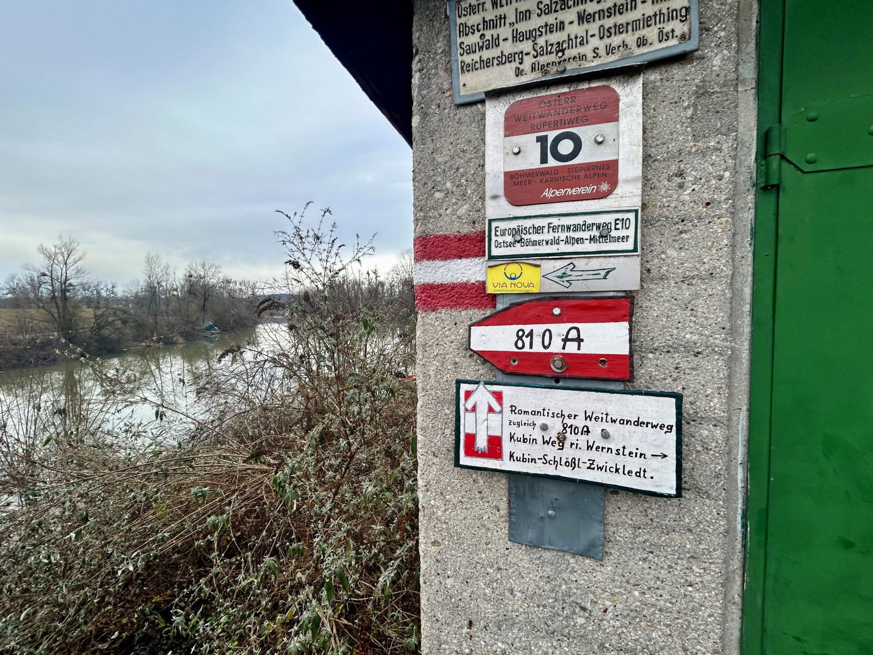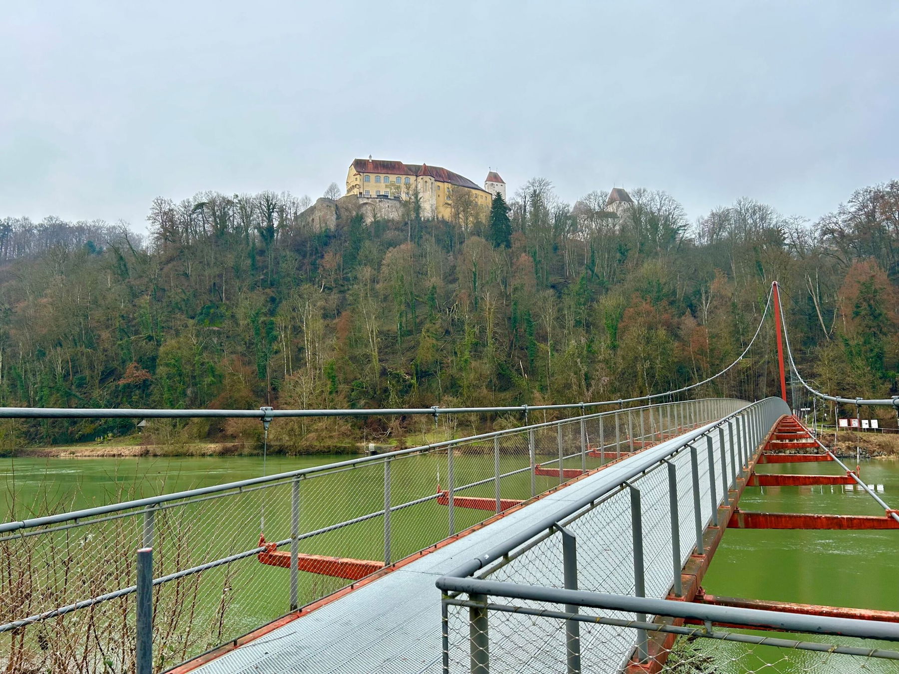Der Wernsteiner Bahnhof liegt nahe dem Innufer, der Mariensteg, über den ich ans andere Ufer gelange, liegt fünf Minuten vom Bahnhof entfernt. Hier befindet sich auch die Burg Wernstein.