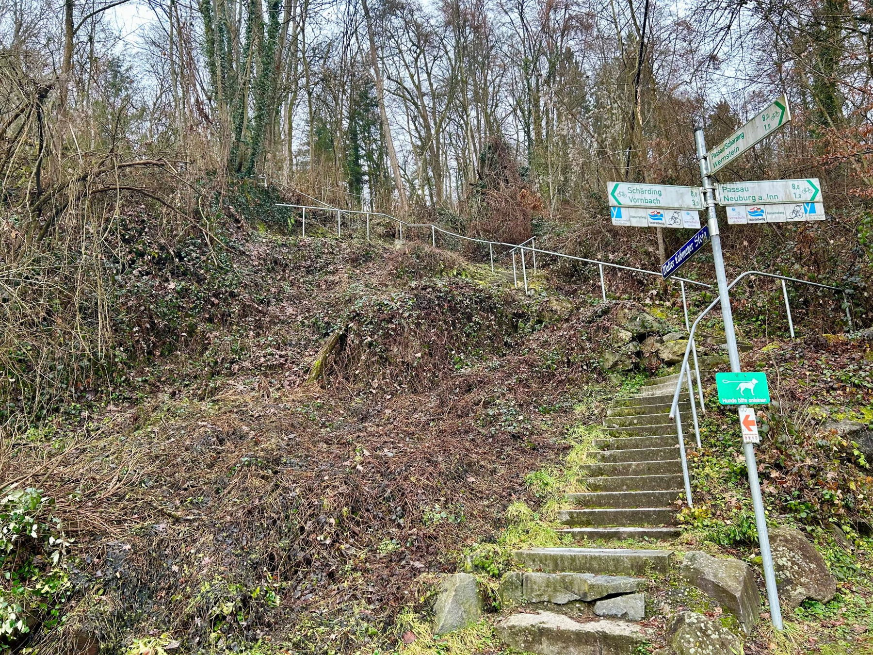 Am anderen Ufer angekommen, muss ich mich entscheiden – direkt entlang des Flusses auf einem breiten Wander- und Radweg nach Vornbach oder über eine historische Stiege zuerst hinauf nach Neuburg? Rückblickend habe ich gut gewählt und empfehle daher, unbedingt die etwas mehr als Hundert Höhenmeter zum Schloss hinaufzusteigen.