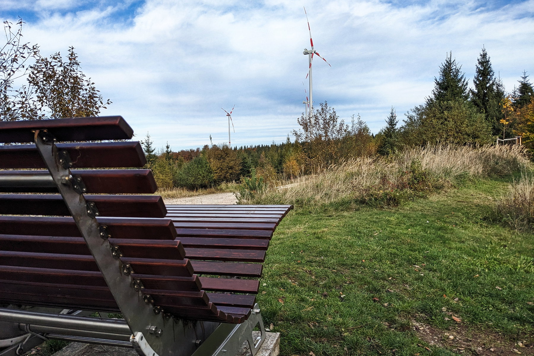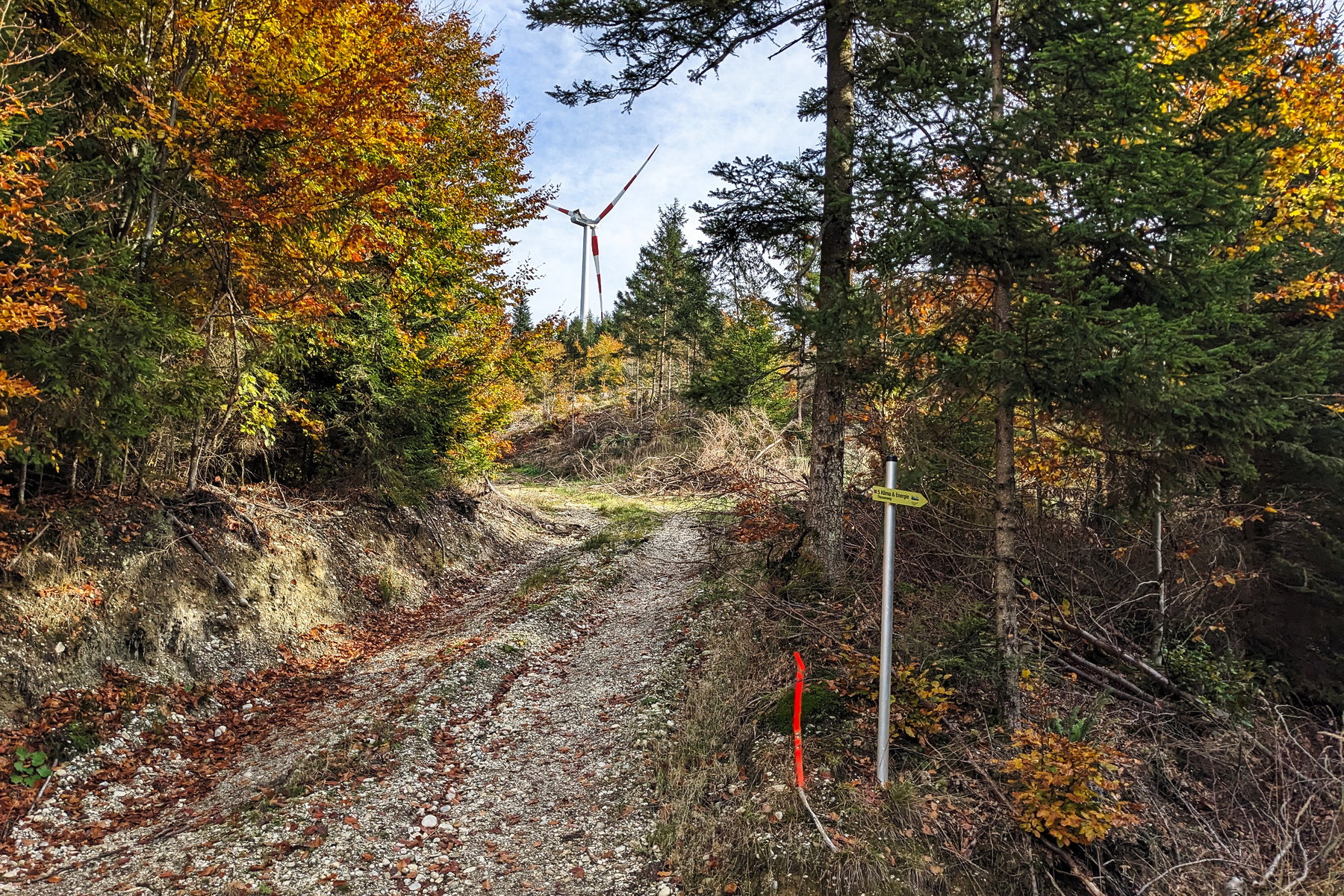 Auch unser Weg wird ein klein wenig steiler. Bald zweigen wir bei einer Bank nach links ab und es geht auf einem leicht gröberen Forstweg weiter, bald durch einen jüngeren Nadelwald. Ab und an ertönt schon das Rauschen des Windes an den Rotorblättern der Windturbine. Es ist nicht mehr weit und siehe da, es wird flach, ein oranges Band entlang des Weges kommt in Sicht. Wir sind beim Windpark angekommen.