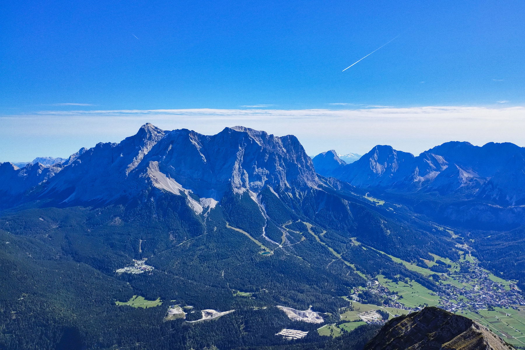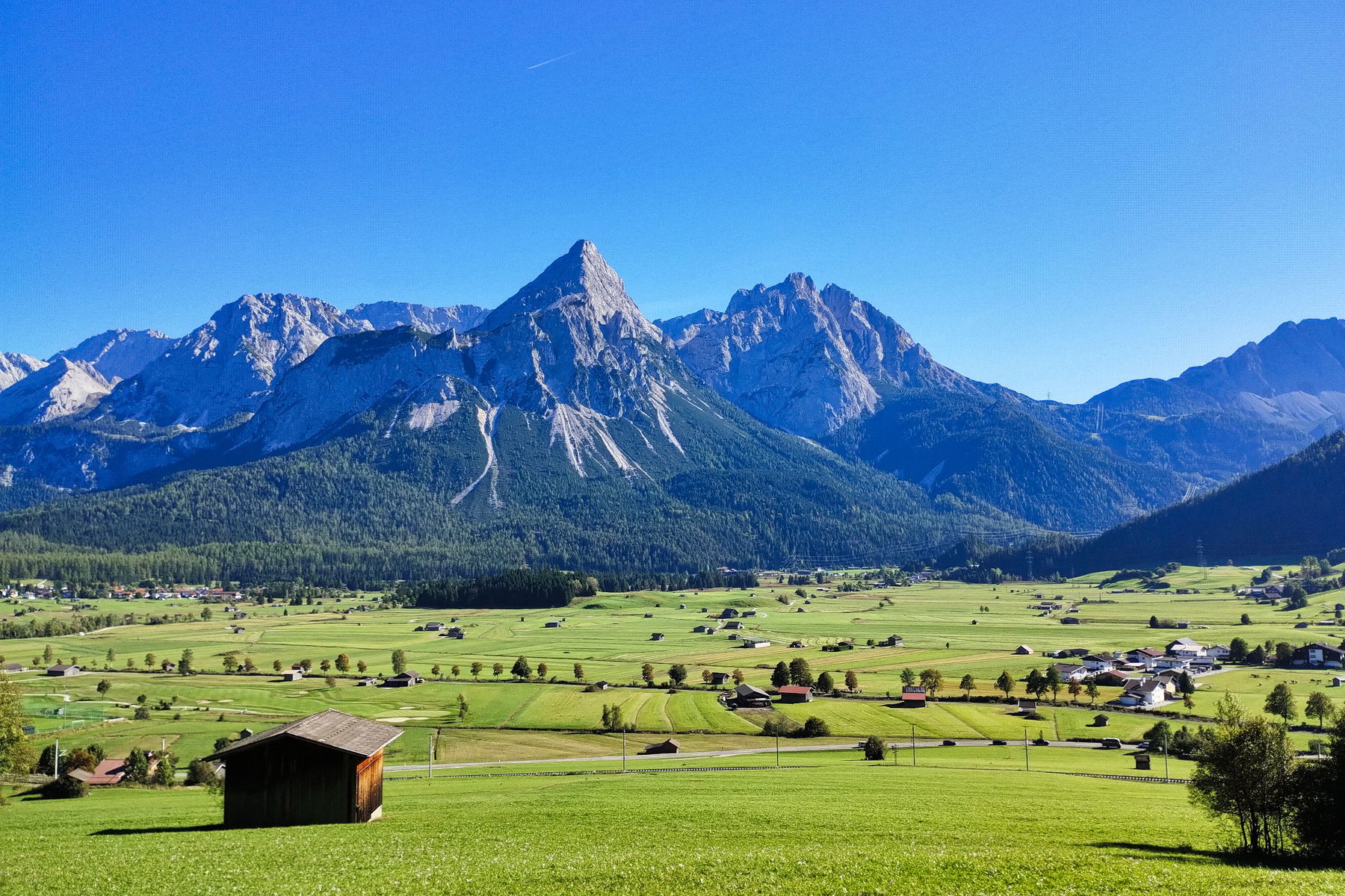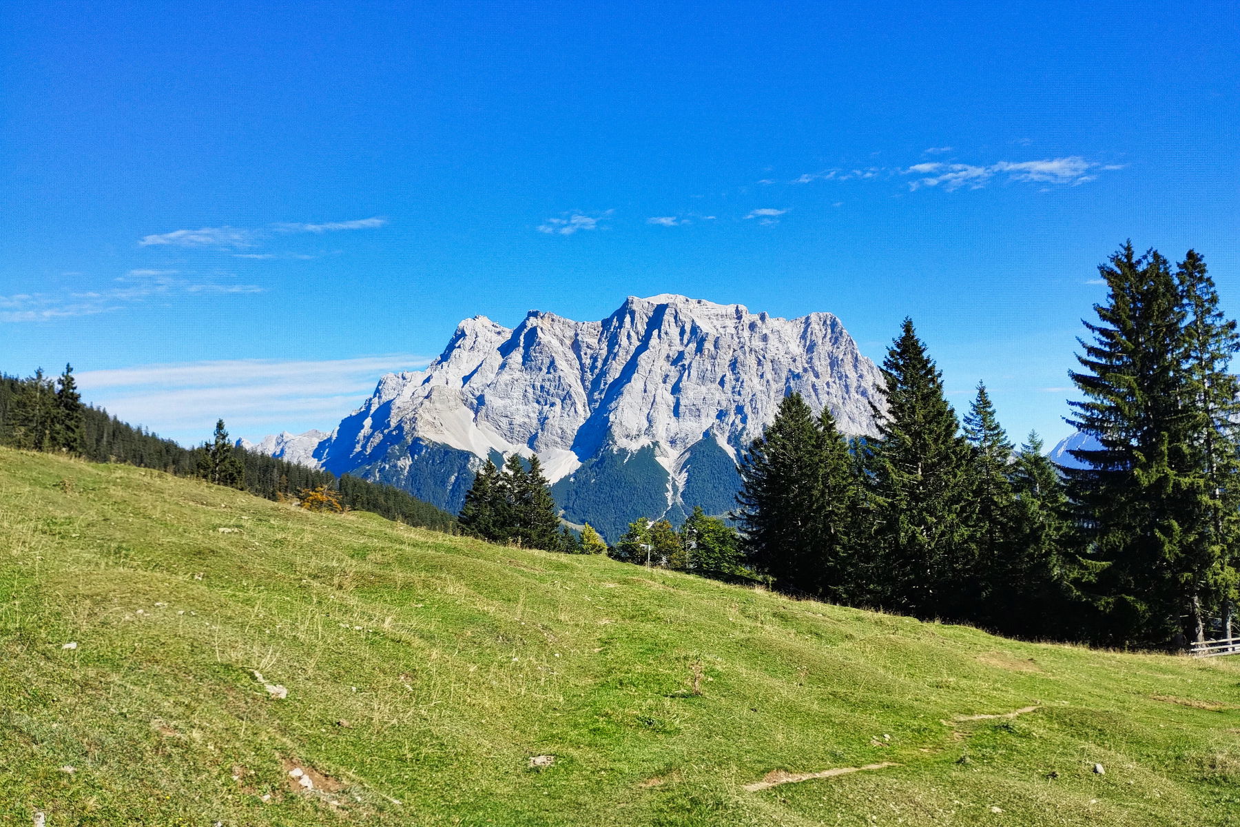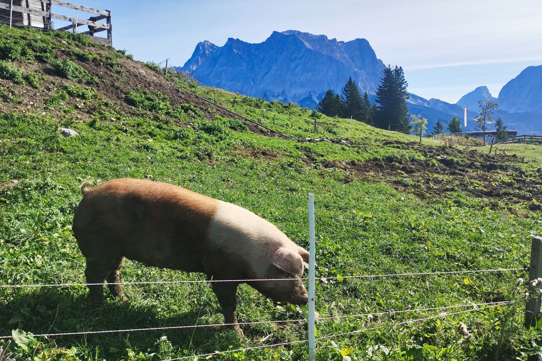 Der Wanderweg beginnt quasi am Ende des Bahnsteigs. Nach wenigen Metern passieren wir das Lermooser Panoramabad und der Steig führt in der Folge steil nach oben, quert immer wieder die Fahrstraße und nach etwa einer Stunde erreichen wir die Tuftlalm. Die Aussicht auf die benachbarte Zugspitze und die Mieminger Kette überwältigt schon hier. Die zahlreichen Almschweine welche hier leben, scheinen sich aber dafür eher weniger zu interessieren. Trotzdem ist es ein Vergnügen den friedlichen Tieren hier bei ihrem Treiben ein wenig zuzuschauen.