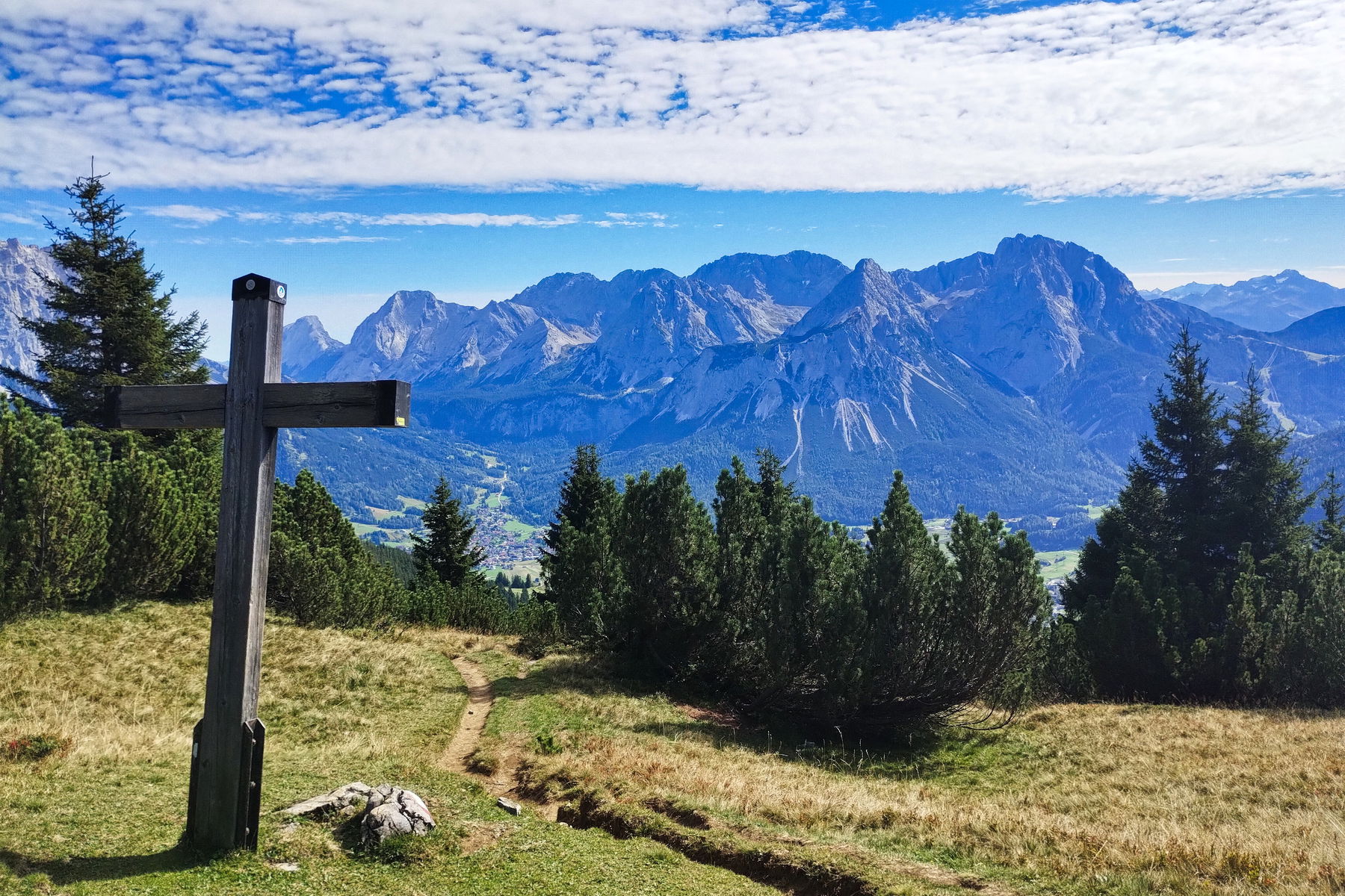 Wir verlassen die Alm nach oben und der Weg führt weiter durchgehend relativ stark ansteigend durch lichten Bergwald. Weiter oben passieren wir den Latschengürtel und erreichen schließlich Schrofengelände. Unser Ziel ist bereits sichtbar und schon überraschend nah. Letztlich fehlt nur noch eine Querung und die hervorragende Aussicht belohnt für den doch recht anstrengenden Anstieg. Weit reicht der Blick über den Wetterstein, die Lechtaler Alpen und natürlich die Mieminger Kette. Dazwischen blitzen die noch vorhandenen Gletscherflächen der Zentralalpen hervor. Im Norden zeigt sich der Starnberger See hinter den grünen Gipfeln der Ammergauer Alpen.