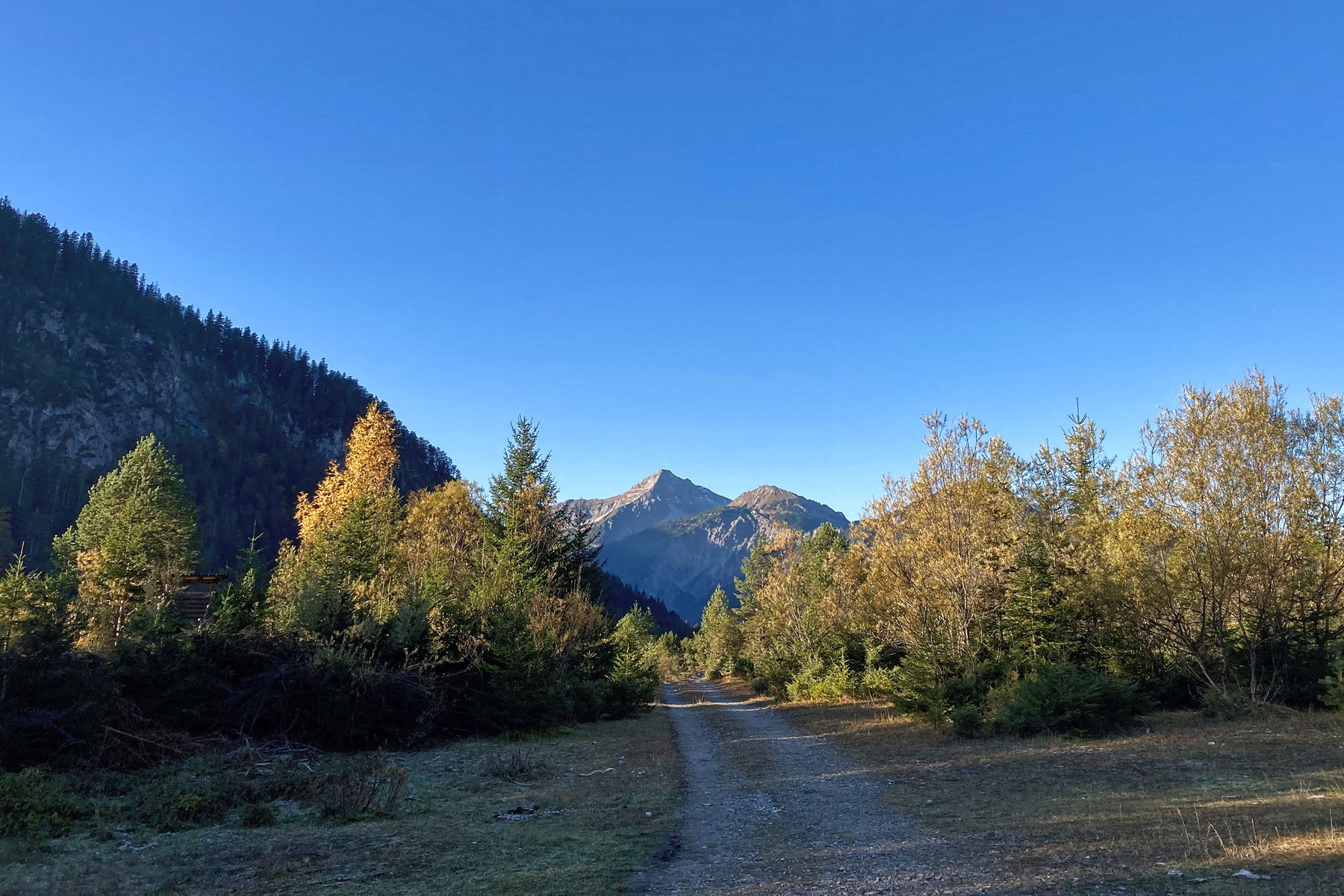 Dazu folgen wird gleich hinter der Schranke rechts dem kleinen Pfad, der uns ein wenig später auf den Forstweg führt. An der ersten Abzweigung halten wir uns links und folgen dem Wegweiser zum Friedergries und Plansee. Wir gehen den Forstweg am Schwarzenbach entlang, bis wir auf das Friedergries stoßen. Auf der großen Lichtung eröffnet sich uns der erste beeindruckende Blick auf den Daniel.