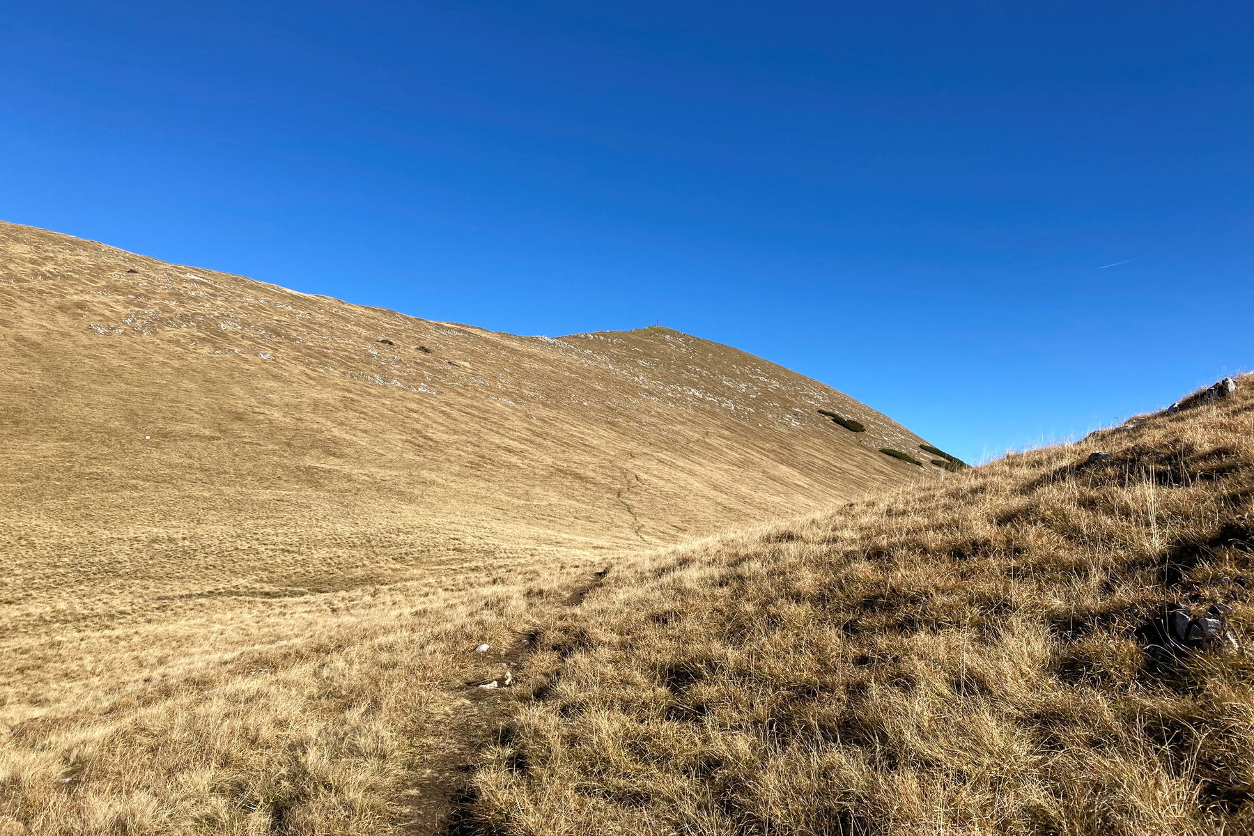 Nachdem wir die Aussicht am Gipfelkreuz auf 2.049 m genossen haben, kann ich meine Beine doch noch überreden, den Abstecher zum Frieder zu machen. Damit kommen etwa nochmal 200 Höhenmeter hinzu. Wir steigen also nordseitig hinunter in den Sattel zwischen Frieder und Friederspitz und erreichen nach etwa 20 Minuten das kleine Gipfelkreuz des Frieder (2.053 m).