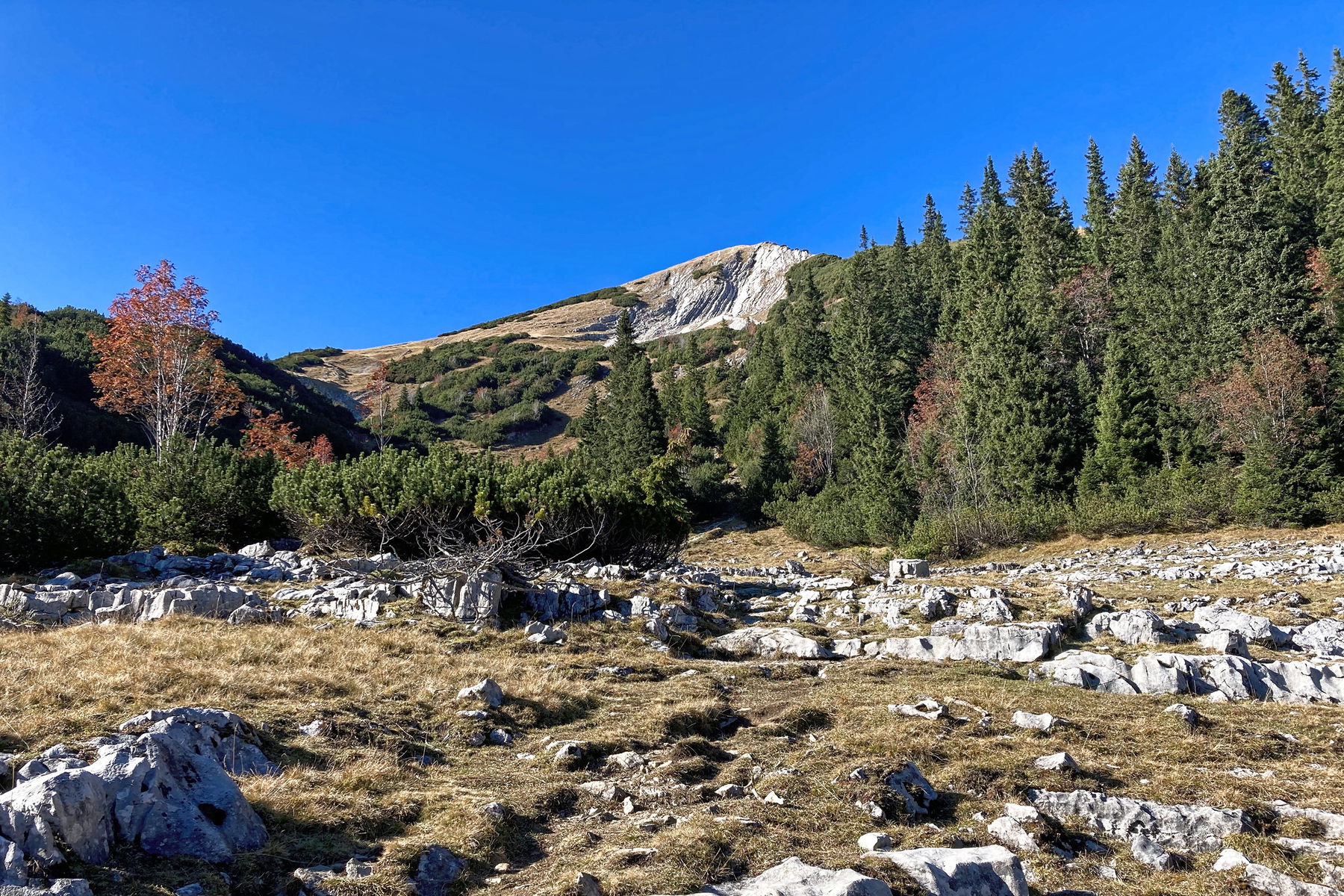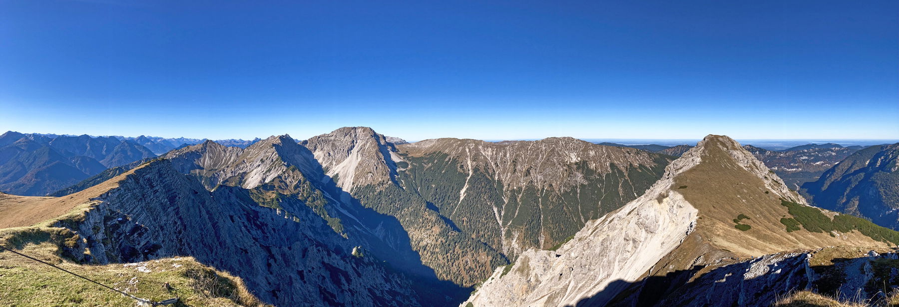 Für die nächsten zwei Stunden etwa geht es in unzähligen Serpentinen auf dem schmalen Pfad den Südhang hinauf. Während wir stetig an Höhe gewinnen, nehmen unsere Gespräche deutlich ab, bis wir in ein einvernehmliches Schweigen verfallen. Abwechselnd haben wir eine fantastische Aussicht auf die Schellschlicht im Westen und die Zugspitze im Süden.