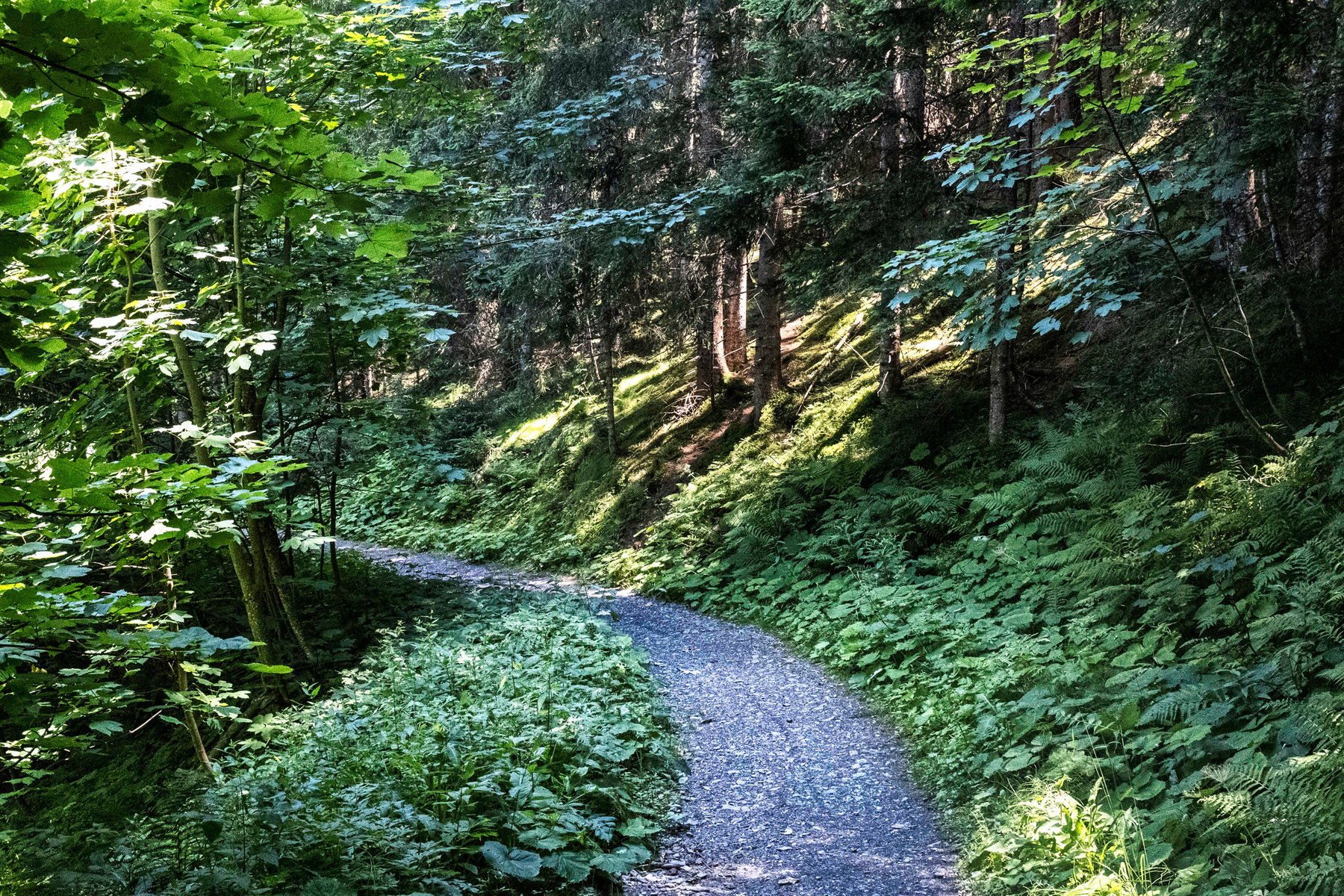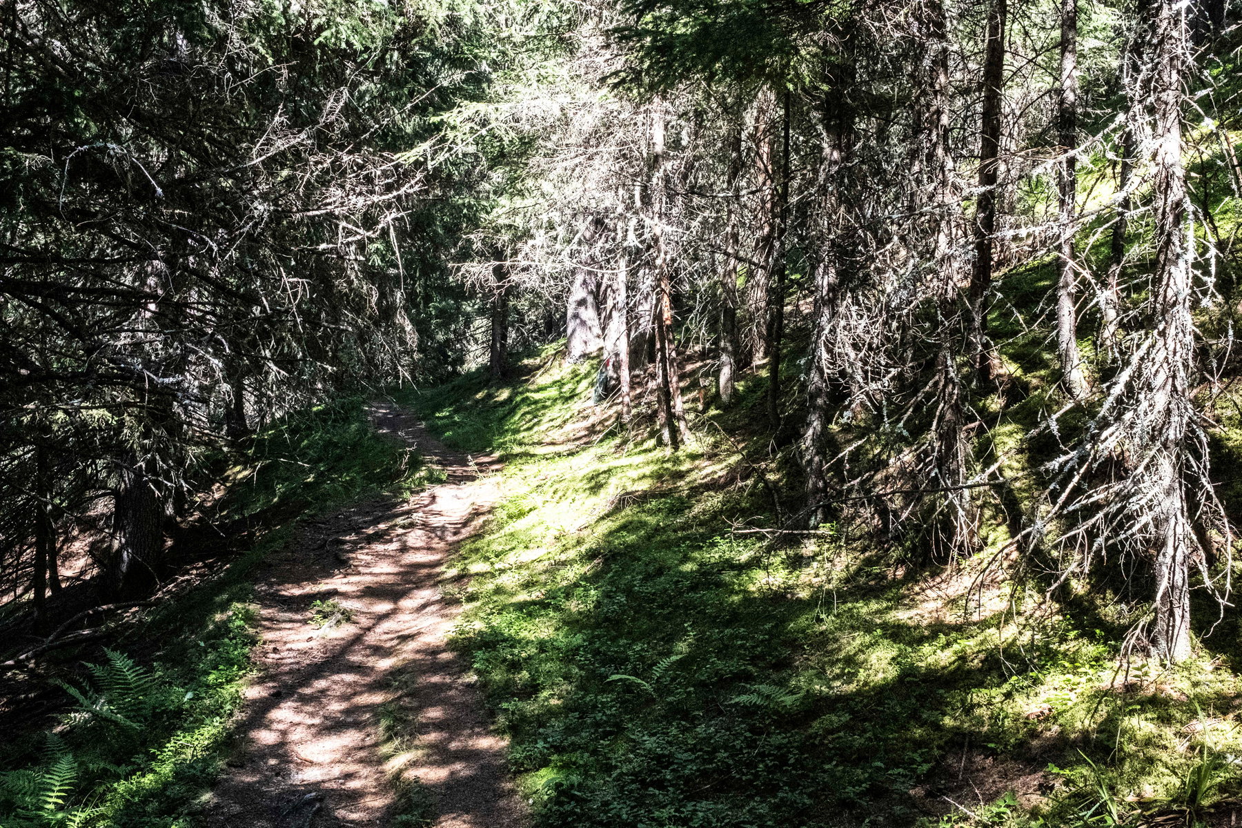 Nun führt der Weg ein längeres Stück durch wunderschönen schattenspendenden Nadelwald.
