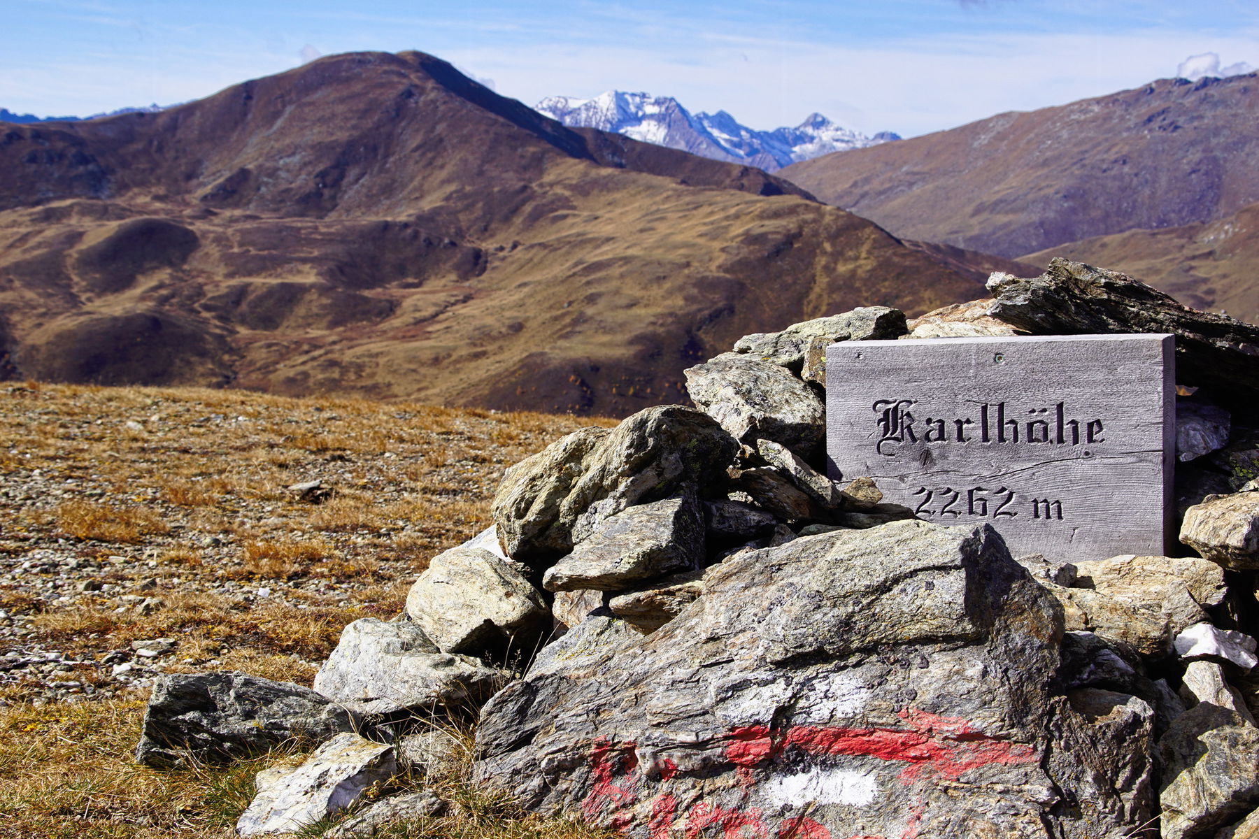 Für eine Besteigung der Karlhöhe wendet sich der Wanderer nach links und folgt dem im unteren Bereich etwas blockigen Rücken hinauf zum höchsten Punkt (Steinmann mit Tafel).