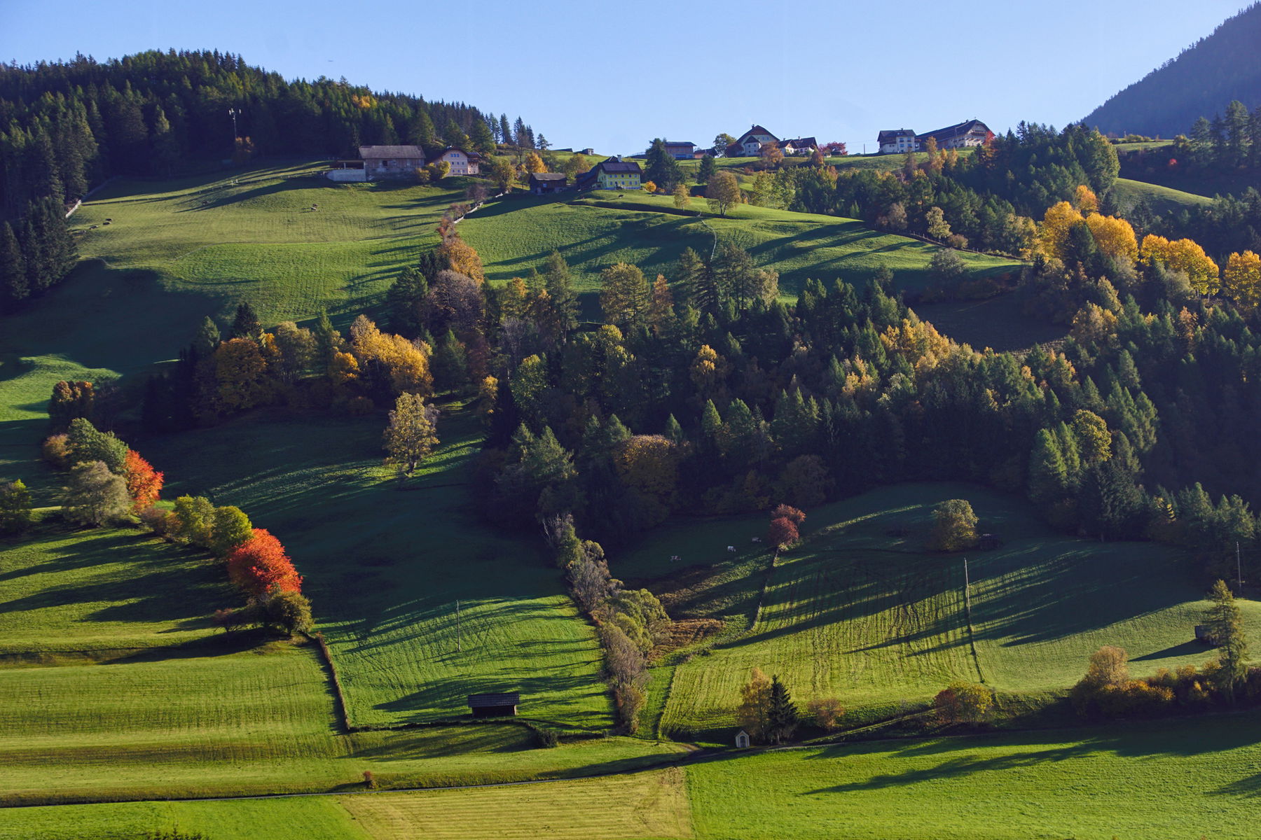 Bei einem Stallgebäude zweigt nach rechts (Westen) etwas unscheinbar (Wegweiser) der Wanderweg ab. Auf diesem geht es nun höher, bis in rund 1.300 Metern eine Asphaltstraße erreicht wird. Dieser folgt der Wanderer nach links (Südwesten) zunächst durch den Wald und dann über Wiesenflächen bis zu den ersten Höfen (Wirnsberg). Beim ersten Bauernhof zweigt nach rechts (Südwesten) eine asphaltierte Straße ab. Diese nimmt man und hält sich dann am Querweg gleich wieder links. Jetzt geht es auf einem Fahrweg gemütlich über die herrlichen Wiesen höher bis zum Waldrand (~1.550 Meter).
