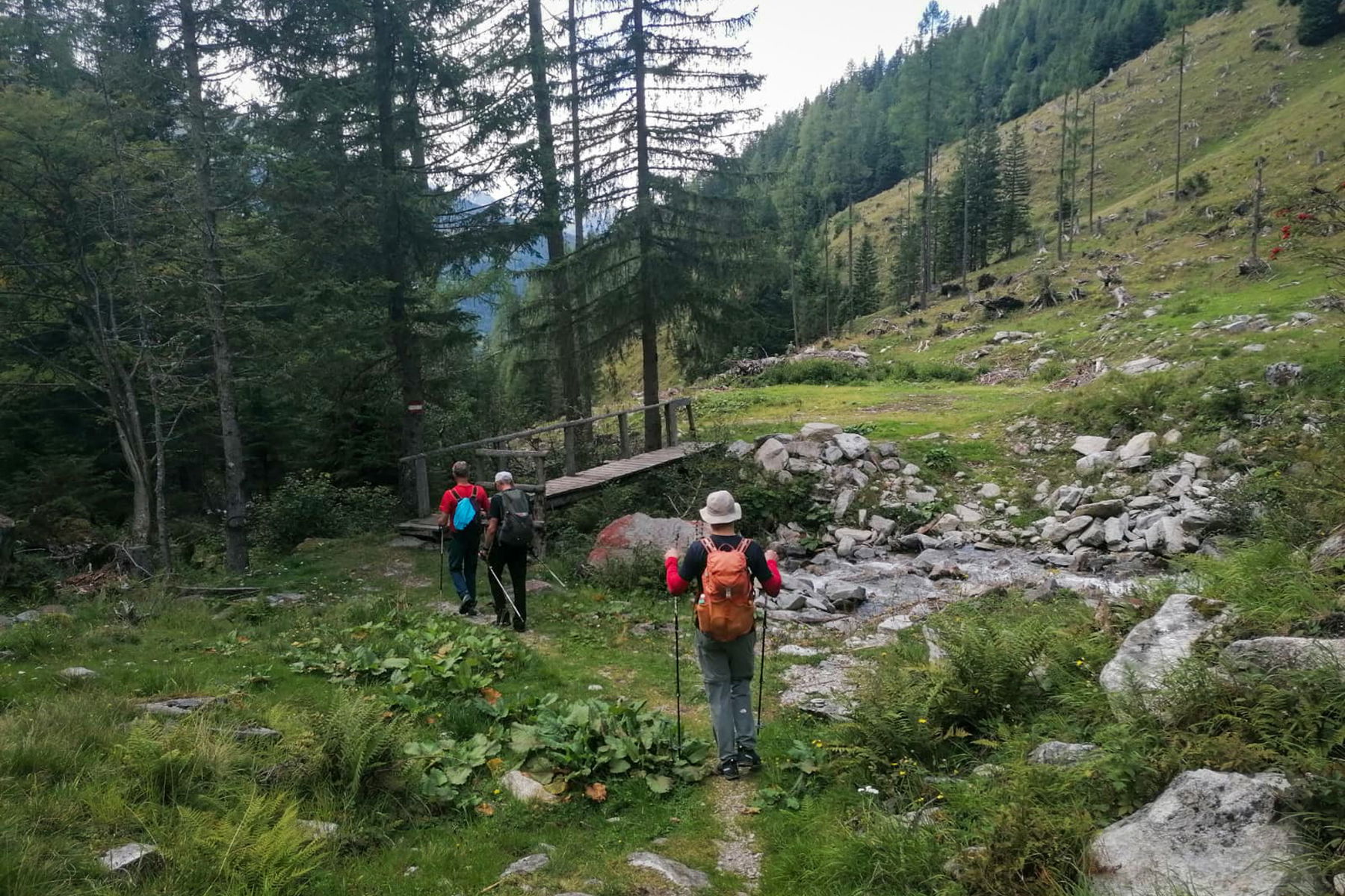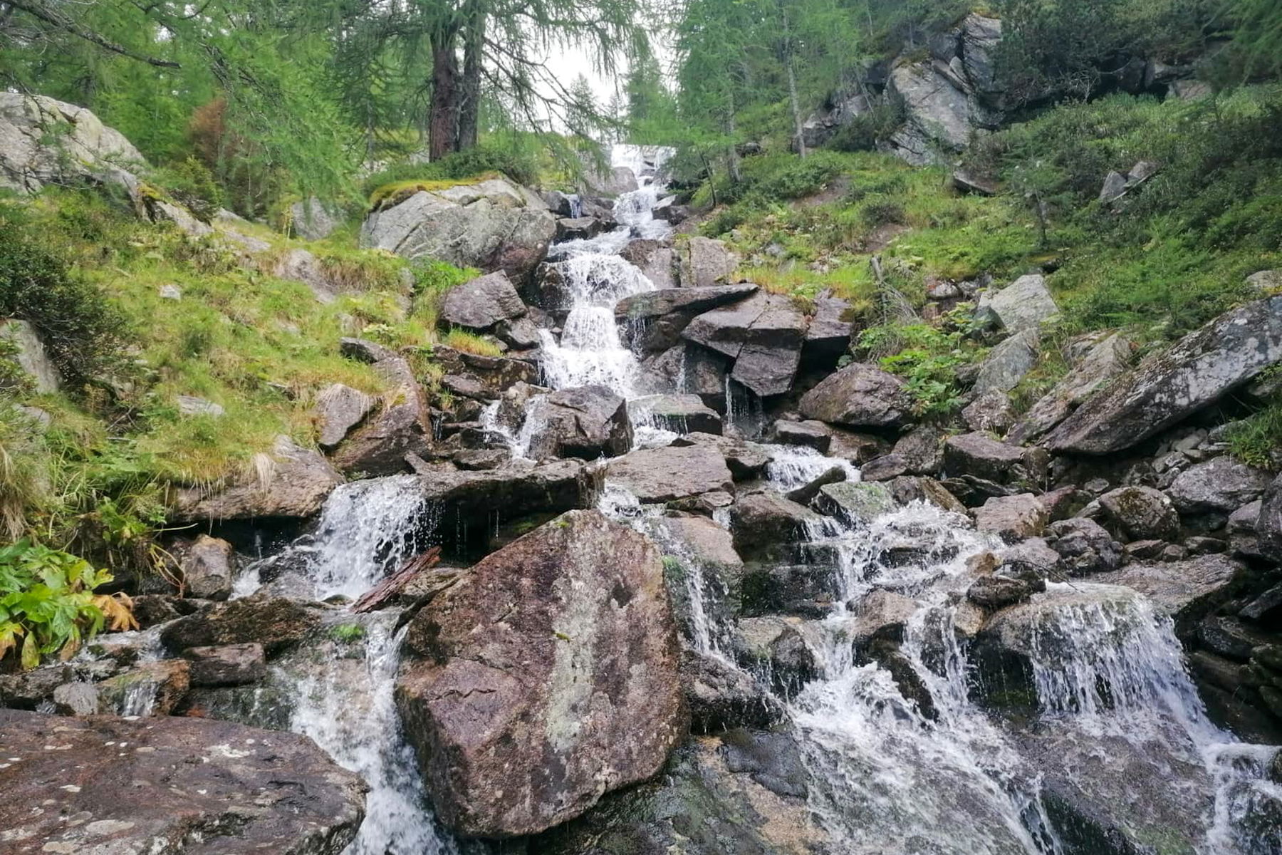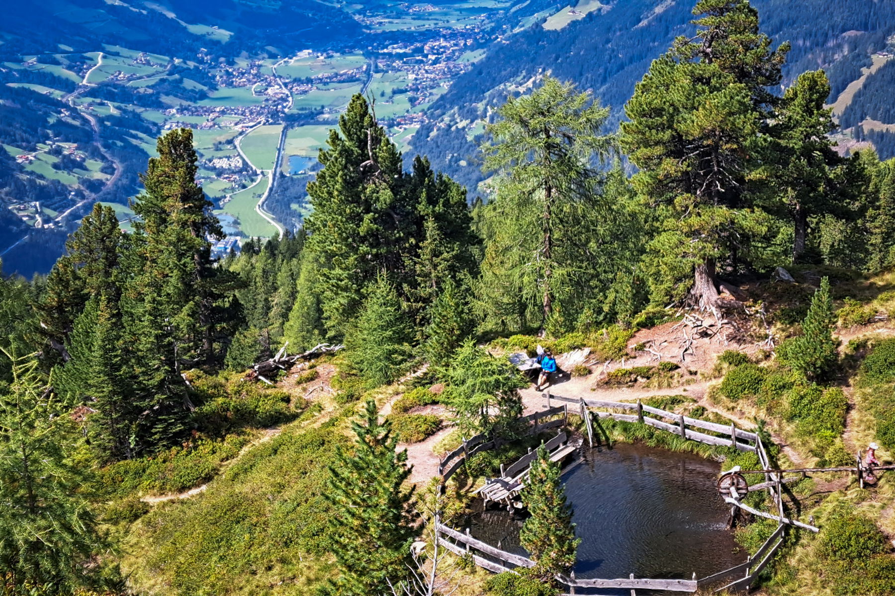 Während der Zirbenweg wieder bergab führt, bleiben wir in der Höhe und folgen dem wunderschönen Wanderweg – das tolle Panorama bleibt! Immer wieder kommt Wasser mal in kleinen Bächen, mal in Wasserfallform den Berg hinunter.