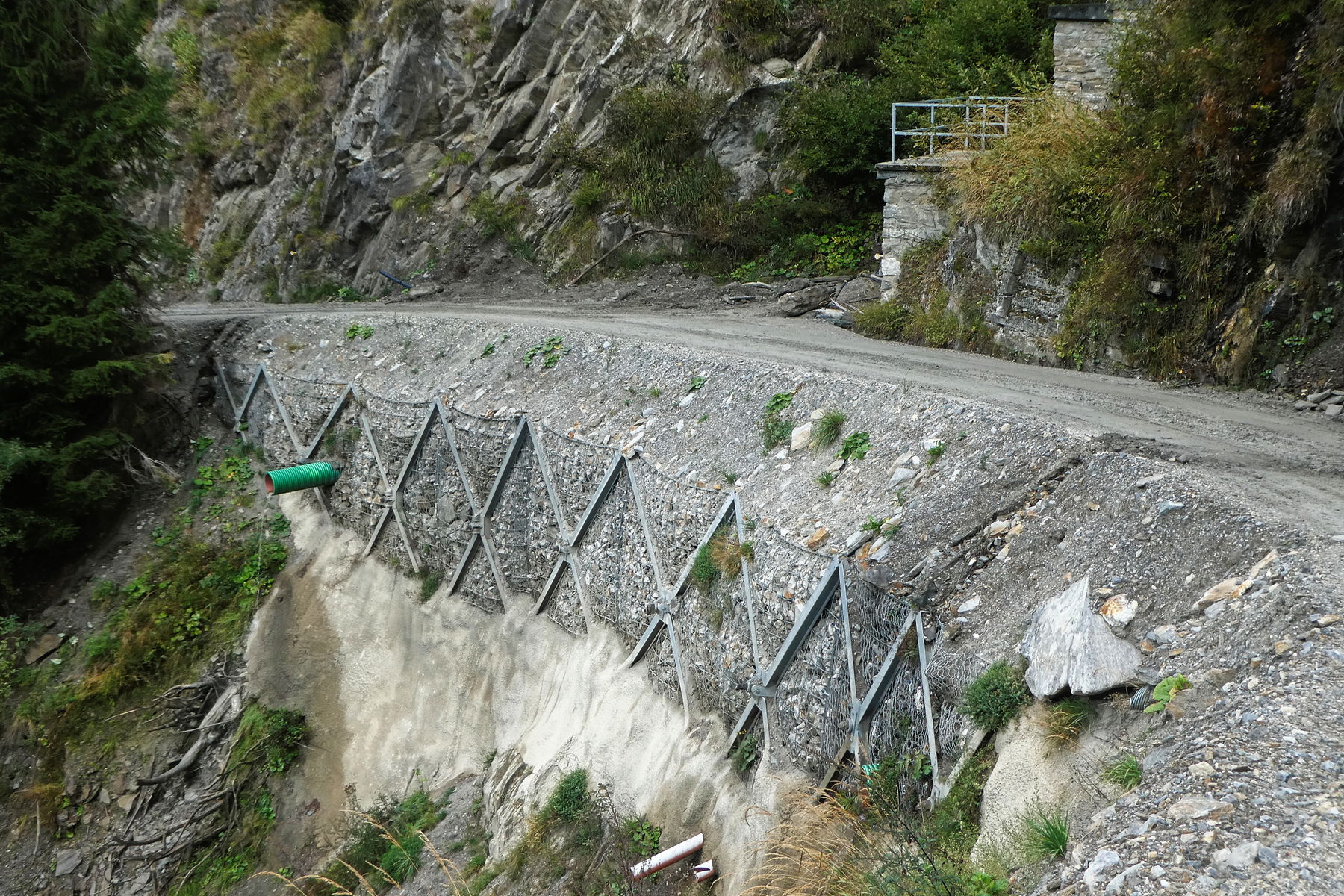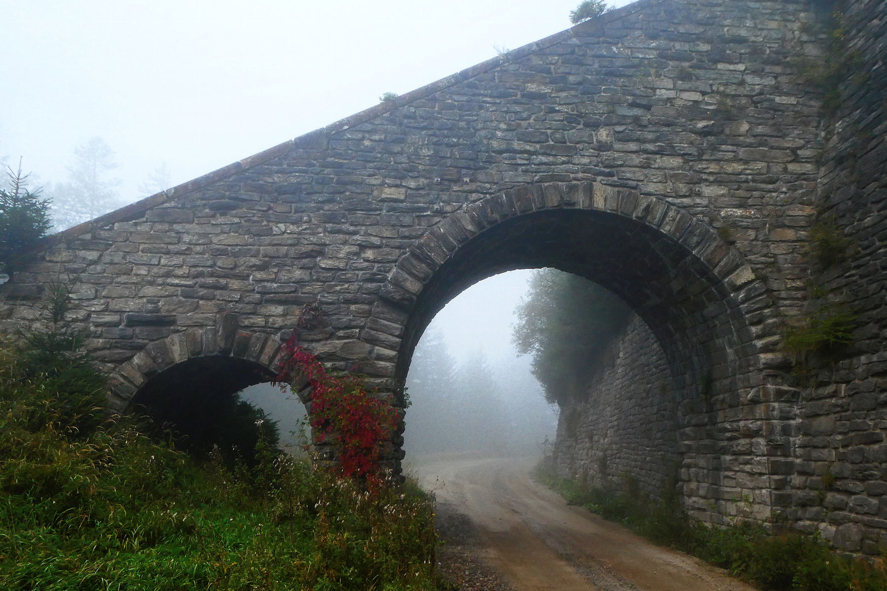 Die nächste Stunde ähnelt der Besichtigung einer Baustelle*: Die Fahrbahn ist von schweren LKW-Reifen plattgewalzt, im Nebel kommt mir der erste Vierachser entgegen. Irgendwie fühle ich mich wie jemand, der verbotenerweise hier unterwegs ist. Ich hebe, etwas unsicher und verstört, grüßend die Hand und drücke mich an den Straßenrand. Mein Gruß wird freundlich erwidert. Dass sich dieses Ritual wohl an die 20x wiederholen wird, wusste ich noch nicht – und ich hätte auch keine andere Wahl gehabt: „Da musst du jetzt durch, Karl!“ – sage ich zu mir. Der Nebel wird dichter; bei Sonne wäre die Aussicht auf das Tal wohl attraktiv. Da: Ein Tunneleingang? – nein: Ein Bauwerk, das ich erforschen will: Keine Skipiste, die quert, sondern ein „Aquädukt“ für große Niederschlagsmengen.