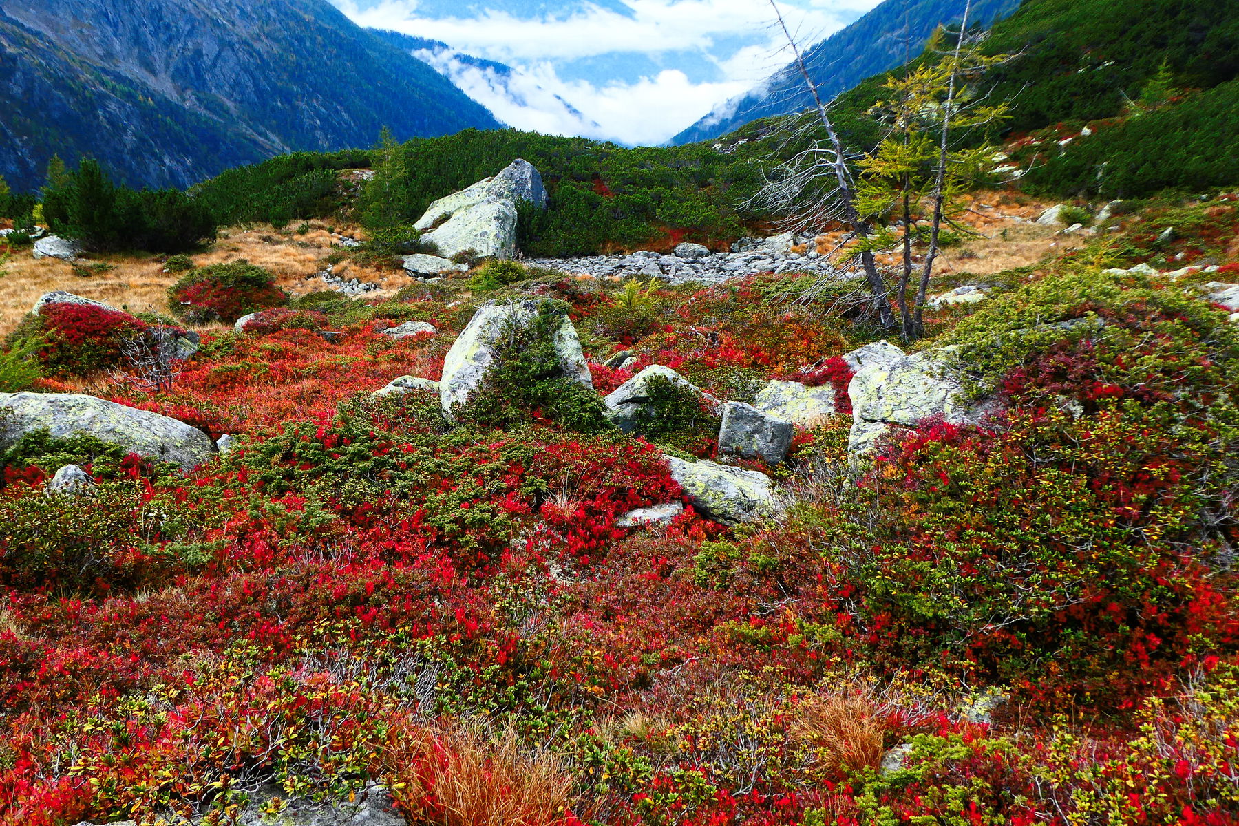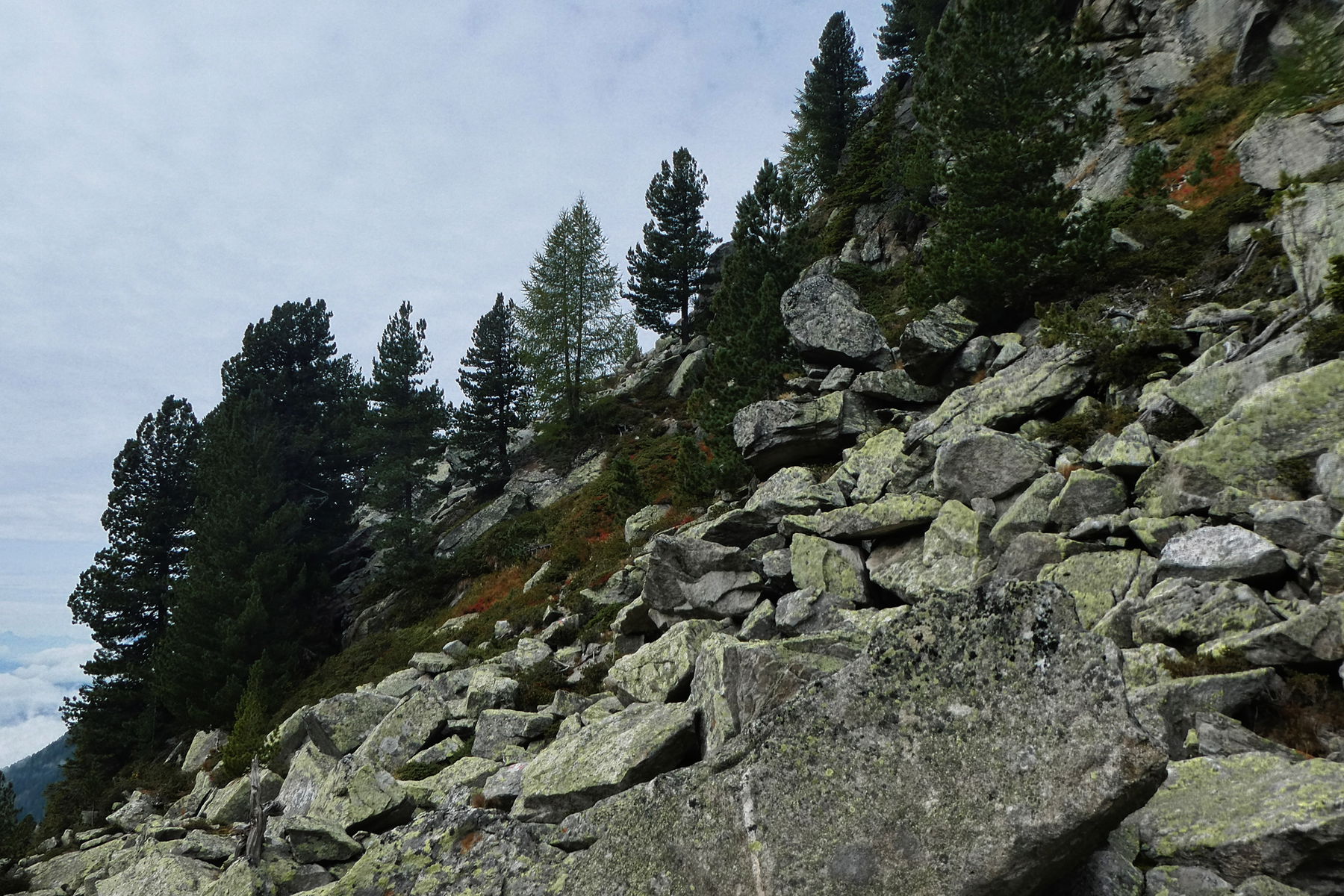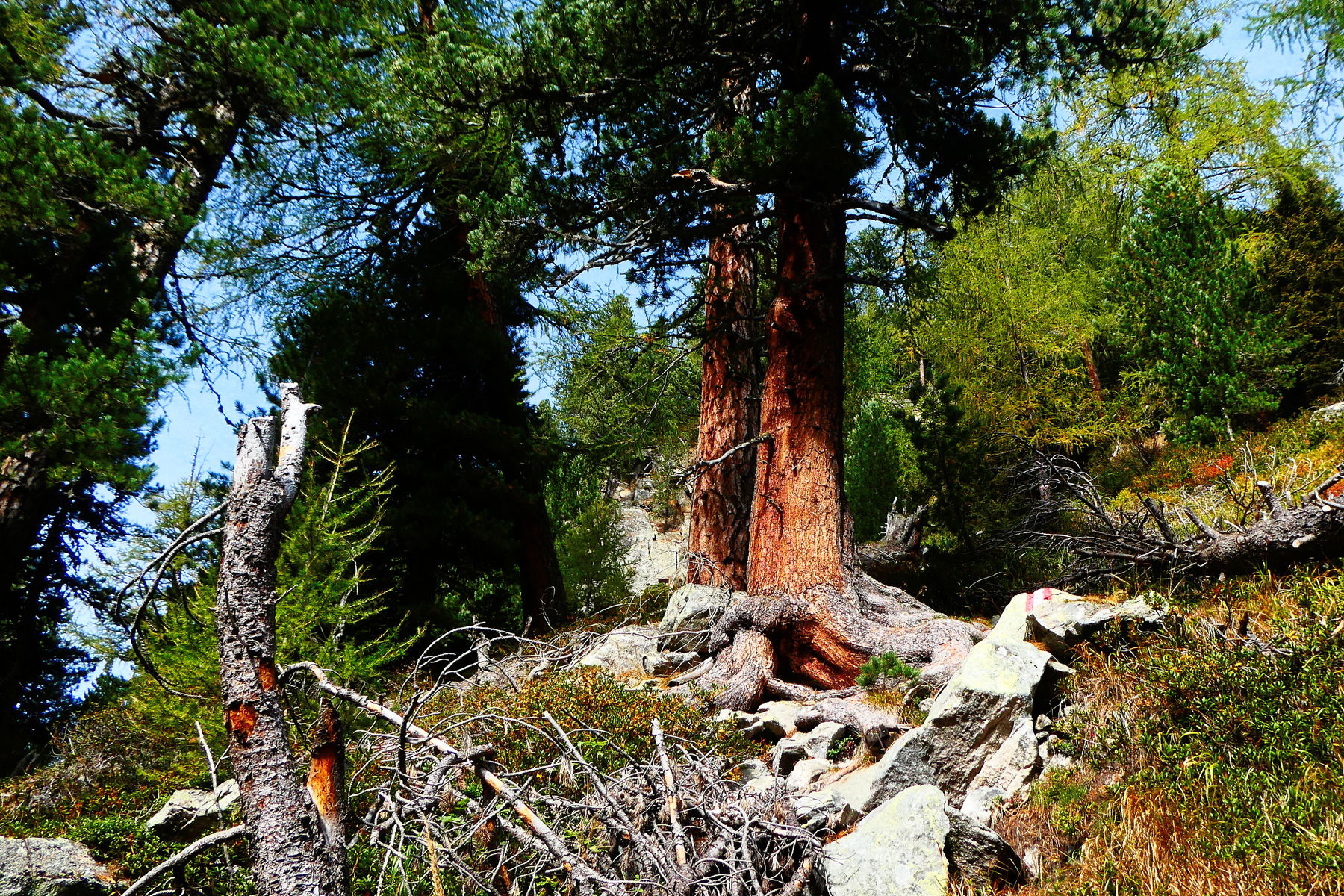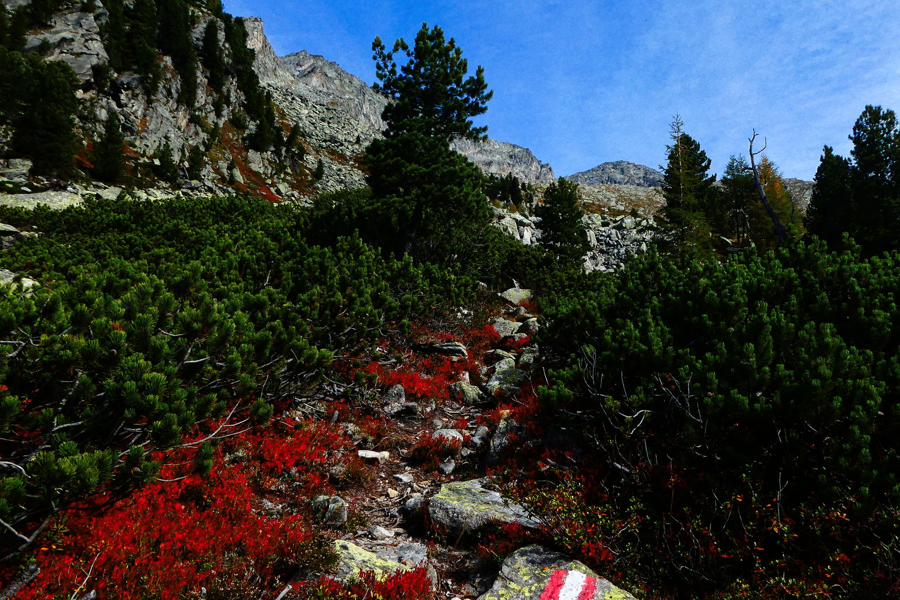 Die nächsten 400 Höhenmeter finden mich vollkommen euphorisch: die alten Zirben (sicher 200+), das Rot und Orange der Zwergsträucher, die Wärme der Sonne…