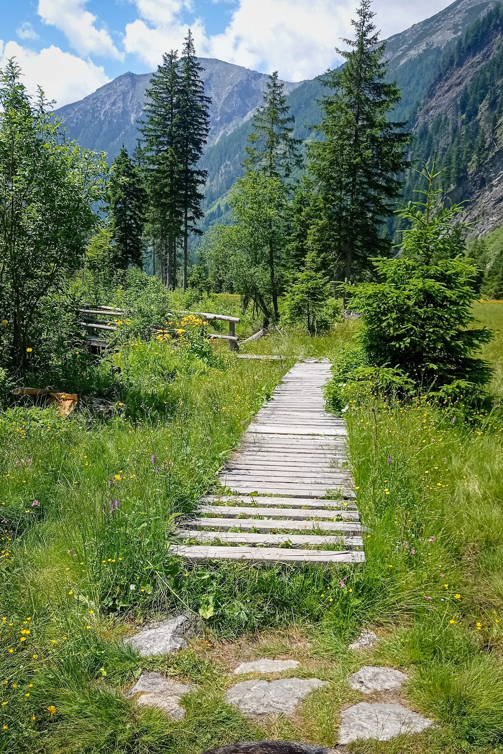 Vorbei an der Ankogelbahn wird der Seebach überquert. Entlang des Seebaches geht es auf einem breiten Kiesweg, vorbei am Stappizer See, immer weiter ins Tal hinein.