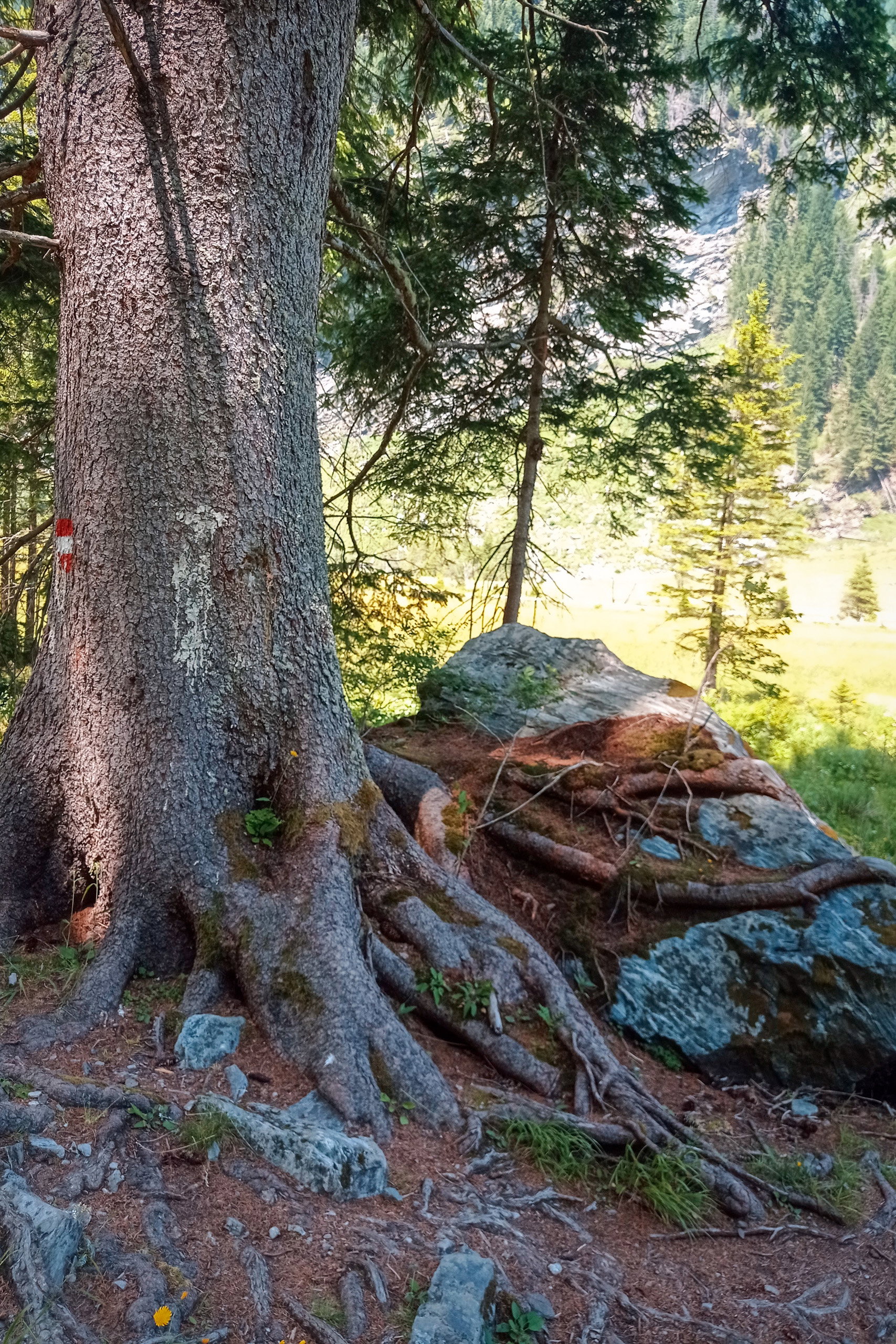 Wer möchte, kann bis zur Schwussnerhütte weitergehen, da gibt es einen Bericht von Veronika. Ich bin vor der Brücke dem Seebach gefolgt und auf dem Naturlehrweg retour gegangen. Der Naturlehrweg beginnt übrigens kurz vor der Schwussnerhütte und kann auf jeden Fall auch von dort in Angriff genommen werden. Danach weiß man, was ein Stelzwurzler ist und kennt einen Blockwald. Zurück beim Stappizer See erfährt man auch hier viele interessante Dinge über den See und die Veränderungen des Tales.