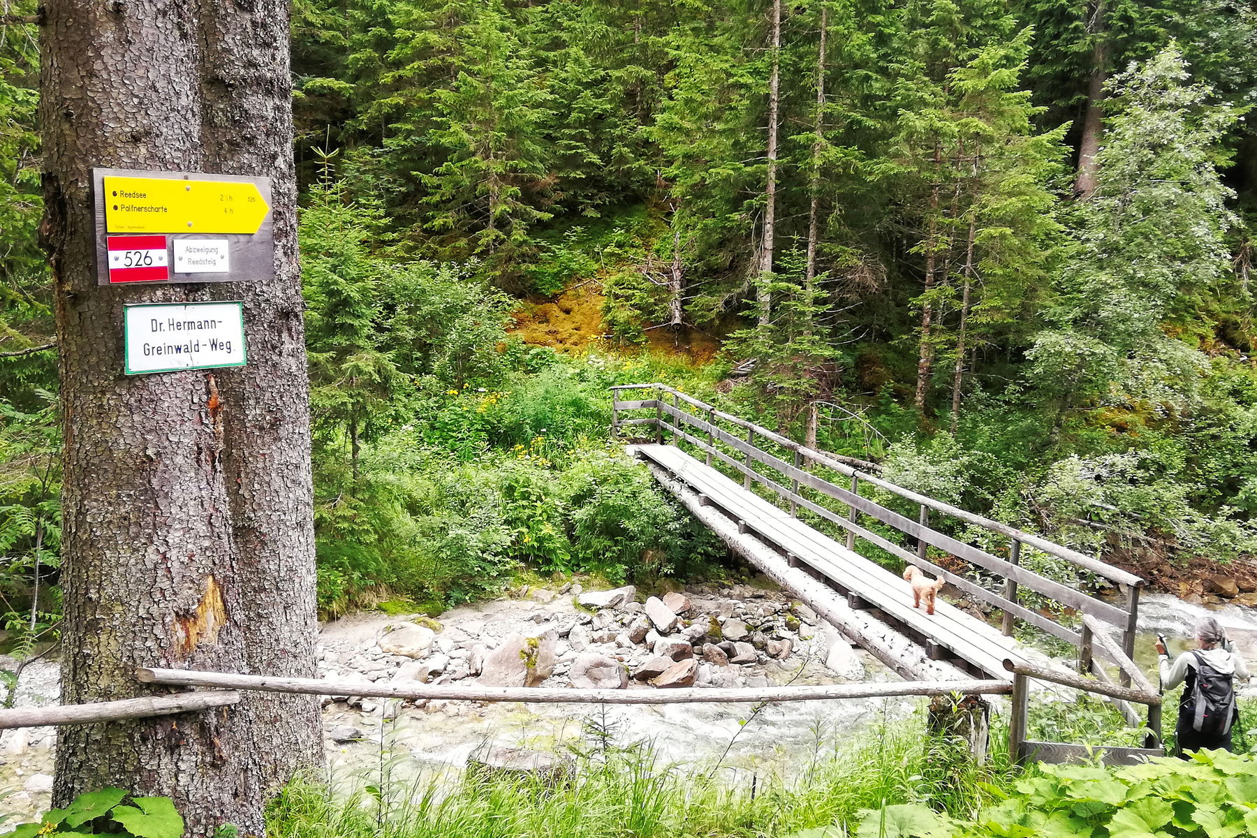 Der Pfad führt hinunter zum Fluss, den wir mithilfe einer Holzbrücke überqueren. Wir folgen einem idyllischen Waldpfad flussaufwärts, bis der Weg rechts abbiegt.