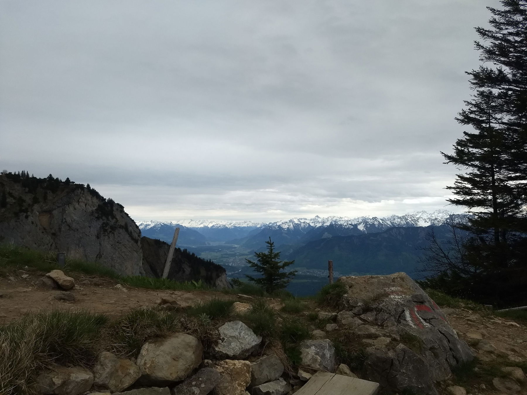 Im weiteren Verlauf traversiert der Weg die Nordwestflanke des Kastens und führt in zahlreichen Serpentinen hinauf zum Kastensattel. Hier öffnet sich erstmalig der Blick ins Rheintal und hinüber ins Rätikon. Der Gipfel ist nun nicht mehr weit und nach weiteren 15 Minuten auch erreicht. Die 360°-Sicht ist gelinde gesagt überwältigend. In der Tiefe zieht sich der Alpenrhein durch sein breites Tal, im Osten reicht der Blick über Allgäu und Bregenzer Wald über die (wenigen) Gipfel Liechtensteins, das Rätikon mit der Schesaplana und die Berge rund um Chur bis ins Unterengadin. Im Westen beherrscht der markante Gebirgsstock des Säntis die Szenerie, im Norden geht der Blick über das gesamte Appenzeller Land bis über den Bodensee. Vier Länder auf einen Blick – wo gibt es sowas schon…?! Das ist Europa!