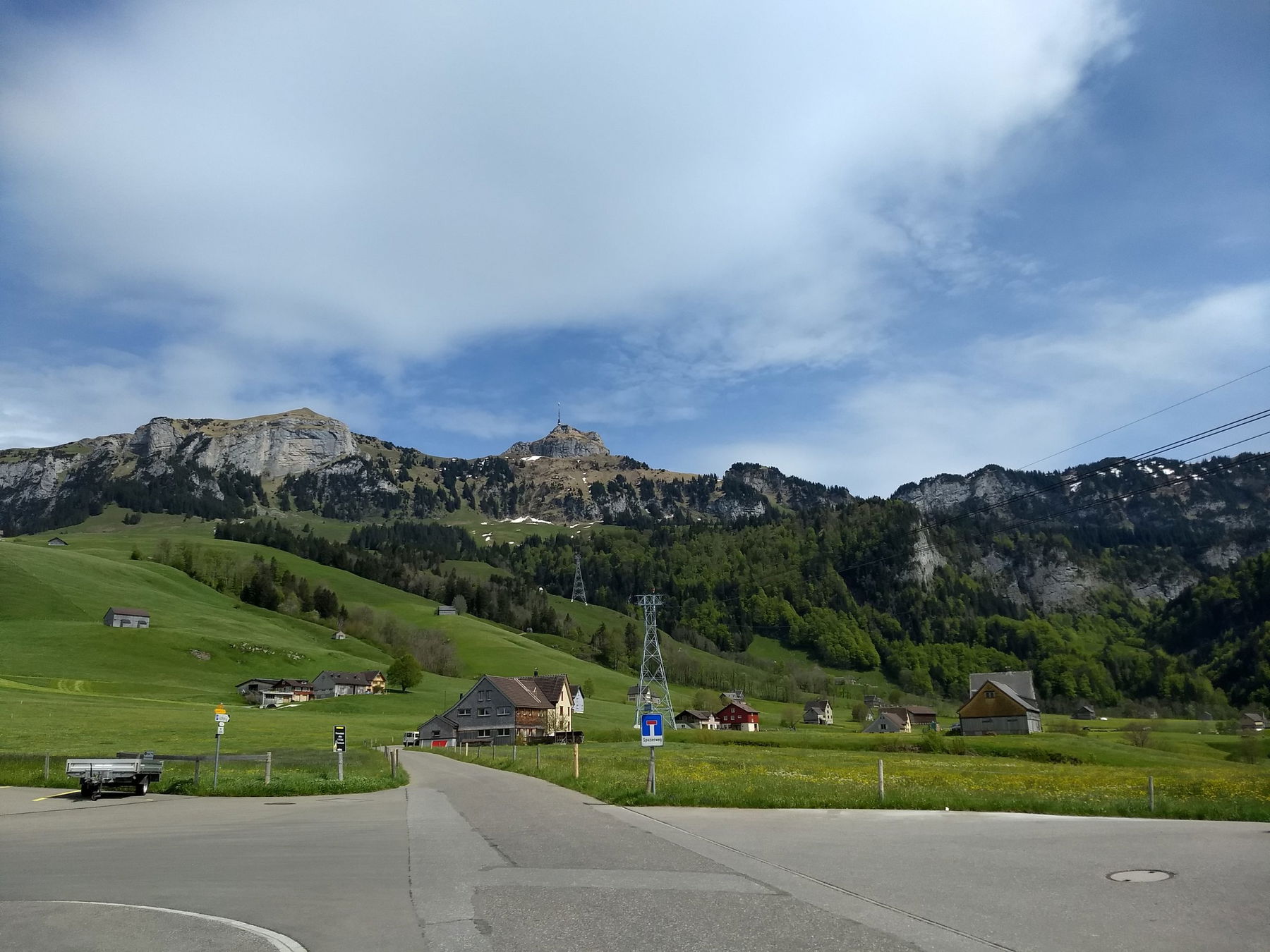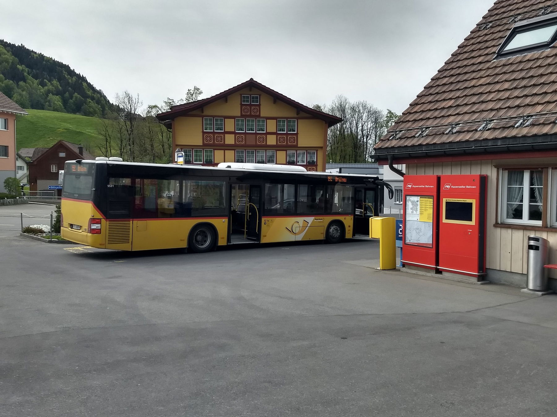 Dort muss nochmals der Zug gewechselt werden (Richtung Wasserauen) und nach weiteren fünf Minuten Fahrt durch eine fast schon klischeehafte schweizer Bilderbuchlandschaft erreicht man die Station Weissbad. Neben dem Zug steht bereits der Postbus bereit, der auch gleich startet und auf der kurzen Fahrt in den Weiler Brülisau auch noch einige Höhenmeter überwindet. Die Endstation befindet sich direkt an der Talstation der Seilbahn zum Hohen Kasten, hier beginnt auch neben der Kirche der Wanderweg zum Gipfel.