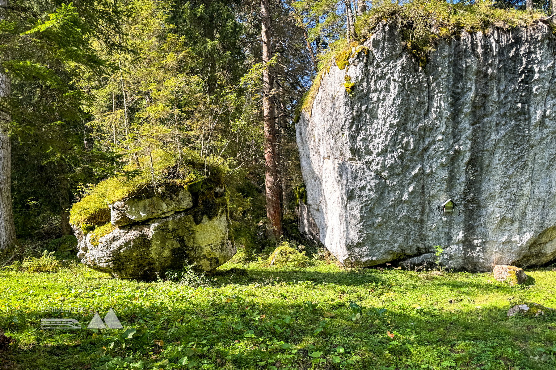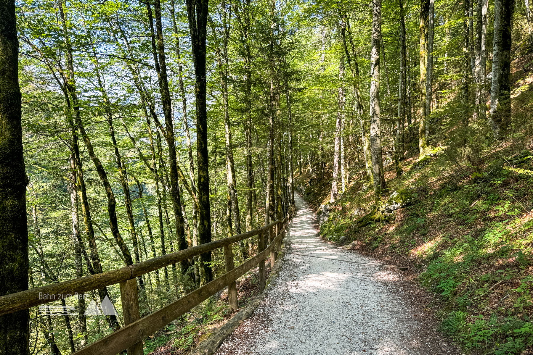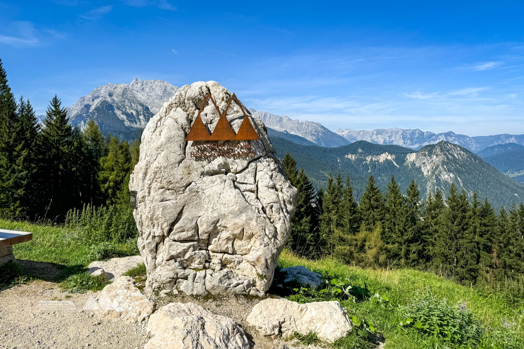 Egal wie man sich entscheidet, von der Mittelstation geht man leicht links, unterhalb des Dr.-Hugo-Beck-Hauses den Forstweg entlang und passiert bald den Eingang zum Nationalpark Berchtesgaden.