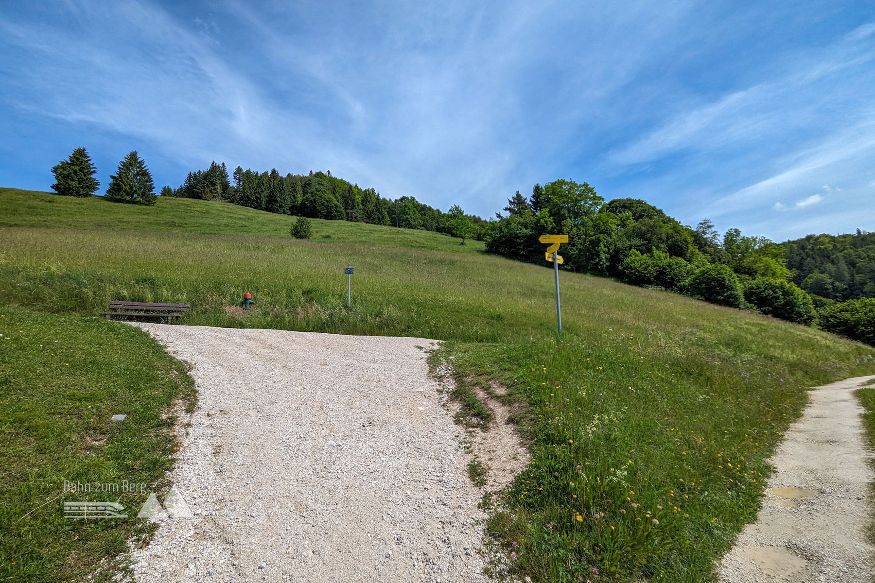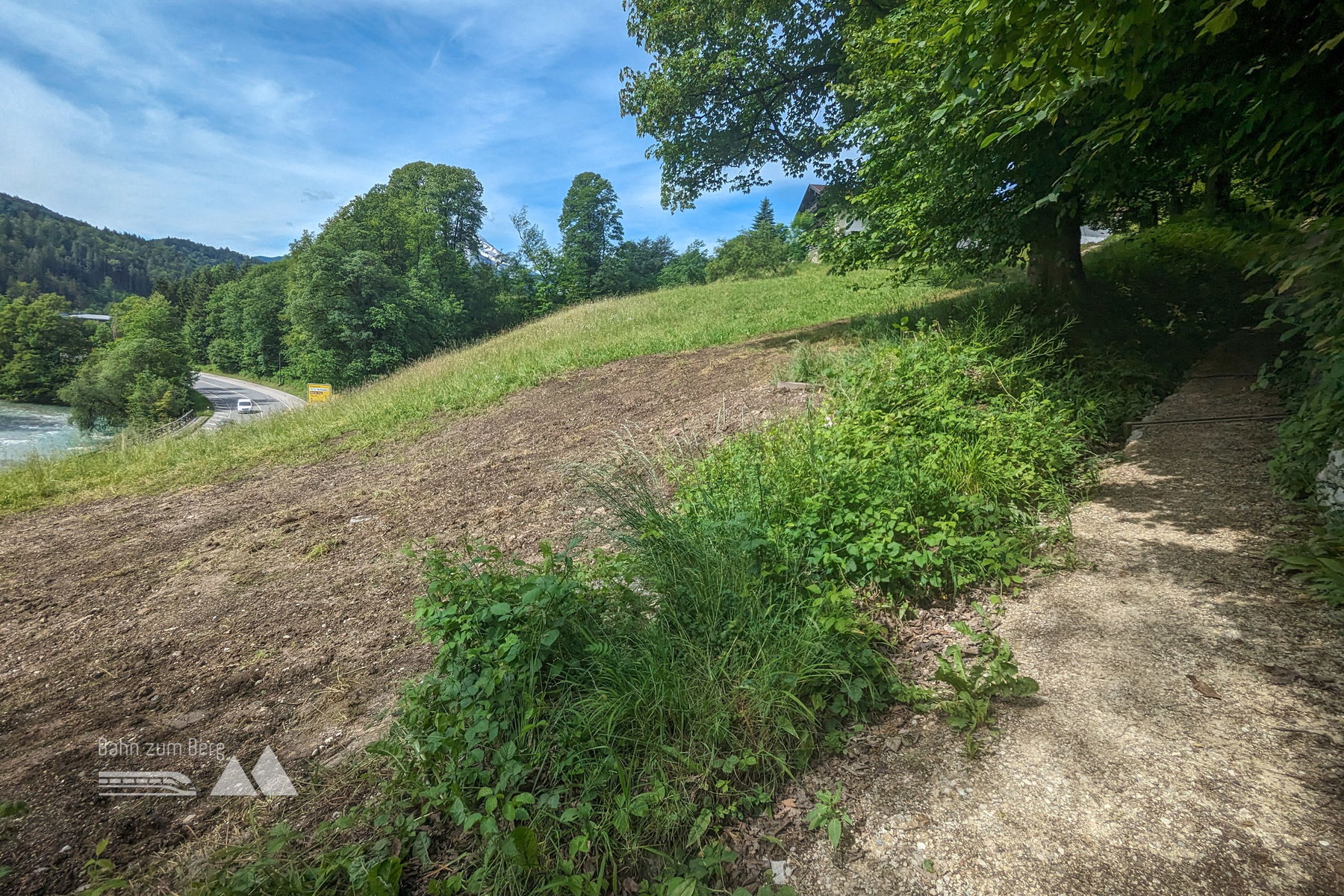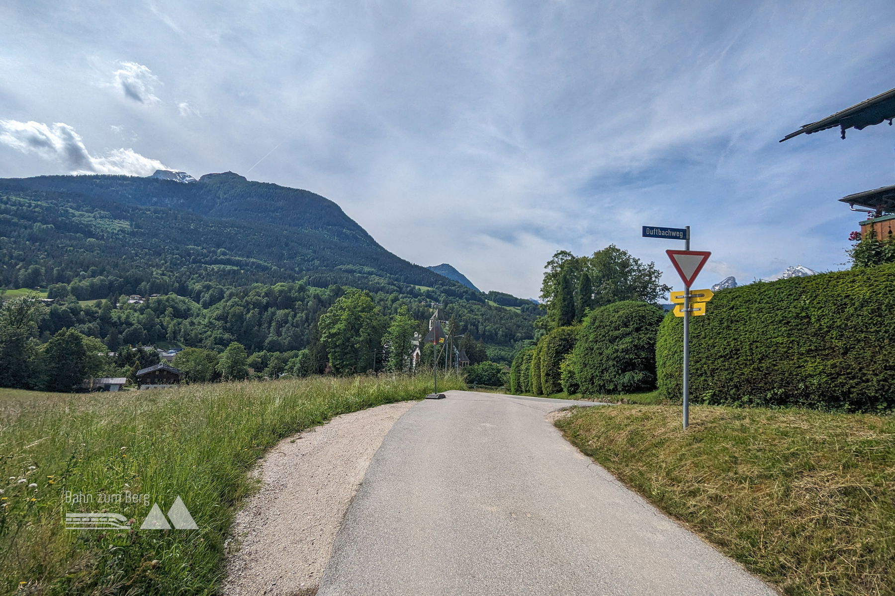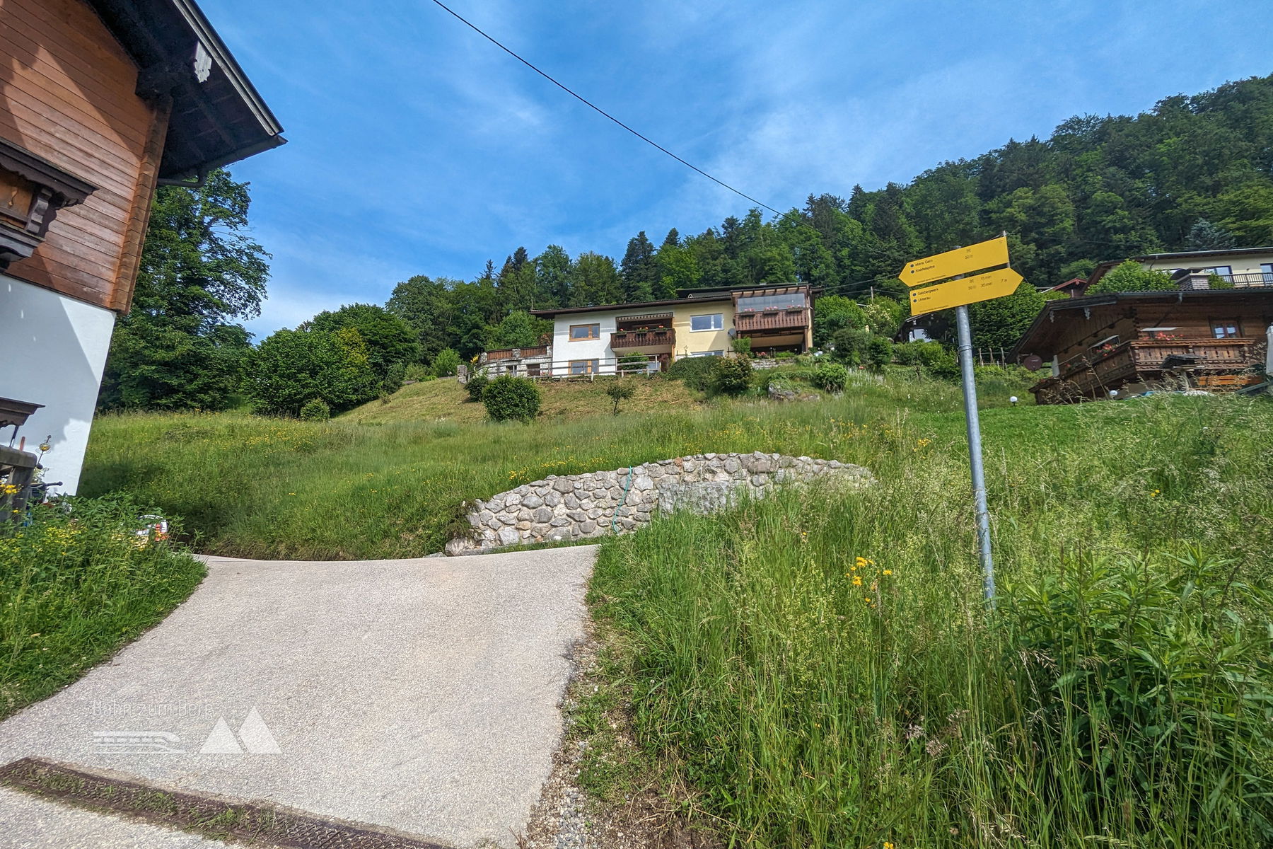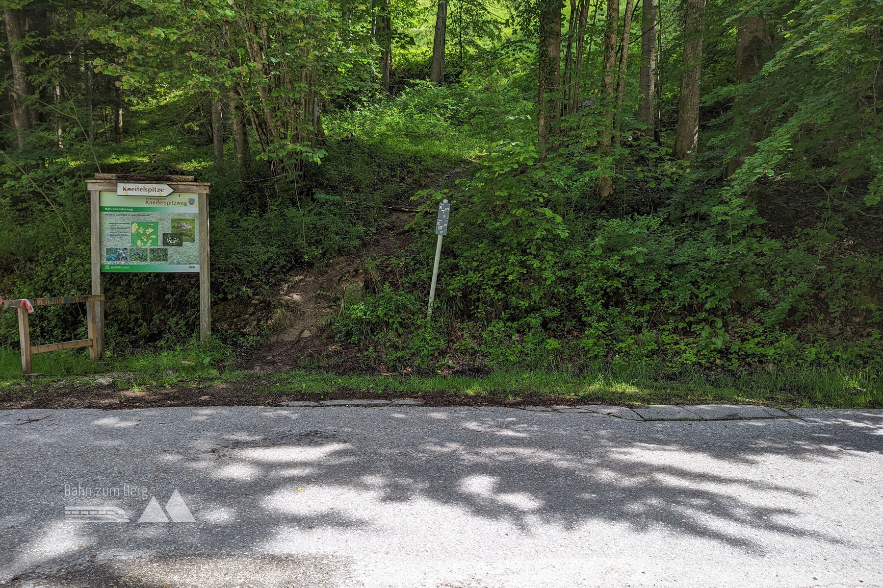 Mit der Buslinie 840 in Richtung Königssee fahren wir nur 5 Minuten bis zum Ausgangspunkt, der Bushaltestelle “Salzbergwerk”. Vom Hauptbahnhof Salzburg ist man eine gute halbe Stunde unterwegs. Wir gehen etwa 150 Meter entgegen der Richtung, aus der ich gekommen bin, um nach links in eine kleine Seitenstraße abzubiegen. Nach 10 Höhenmetern sieht man ein Schild, auf dem unser heutiges Ziel, die Kneifelspitze, bereits angeschrieben ist. Der Weg führt über ein kleines, pittoreskes Wiesenstück, bis man wieder auf die Straße kommt.