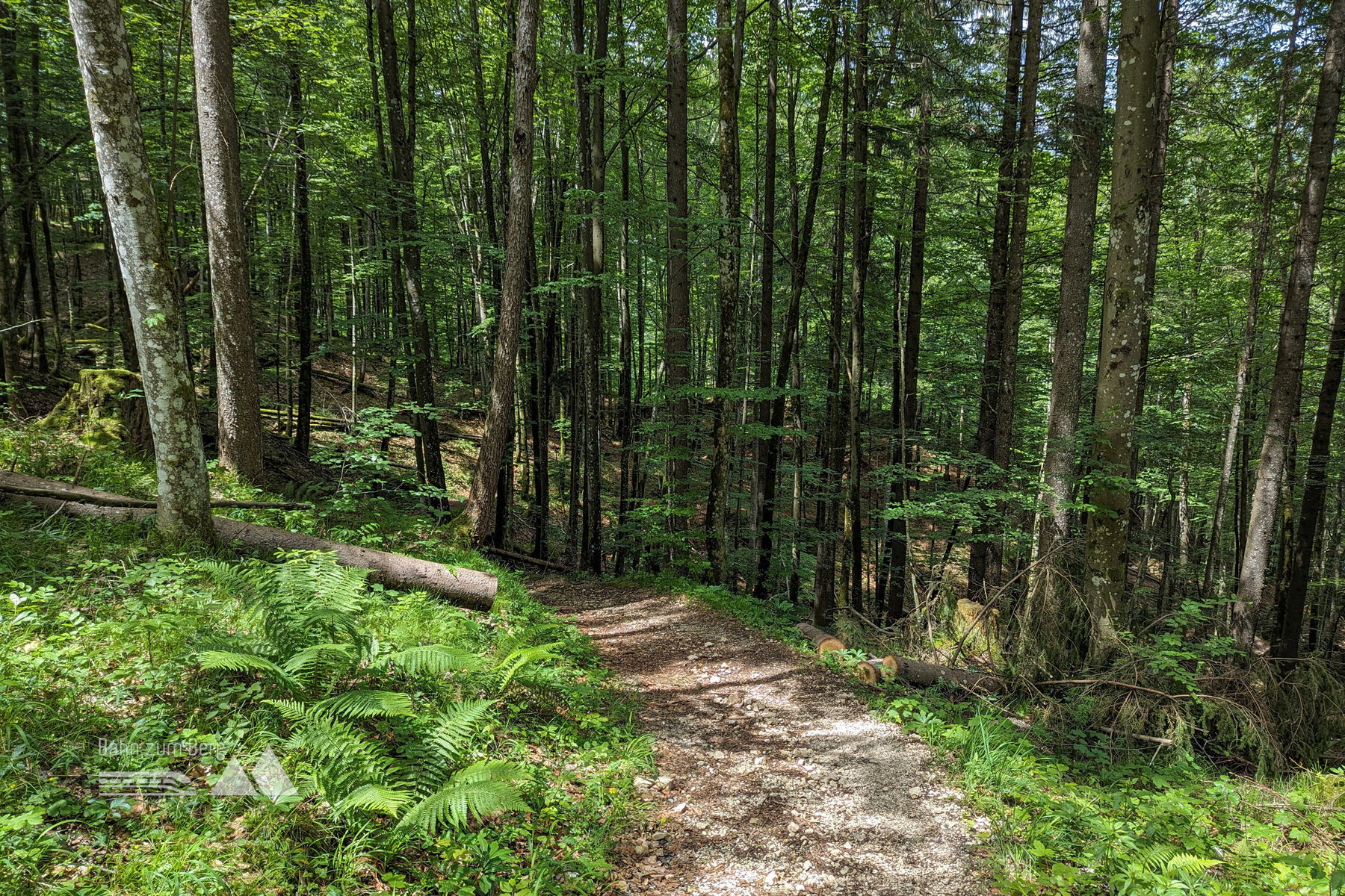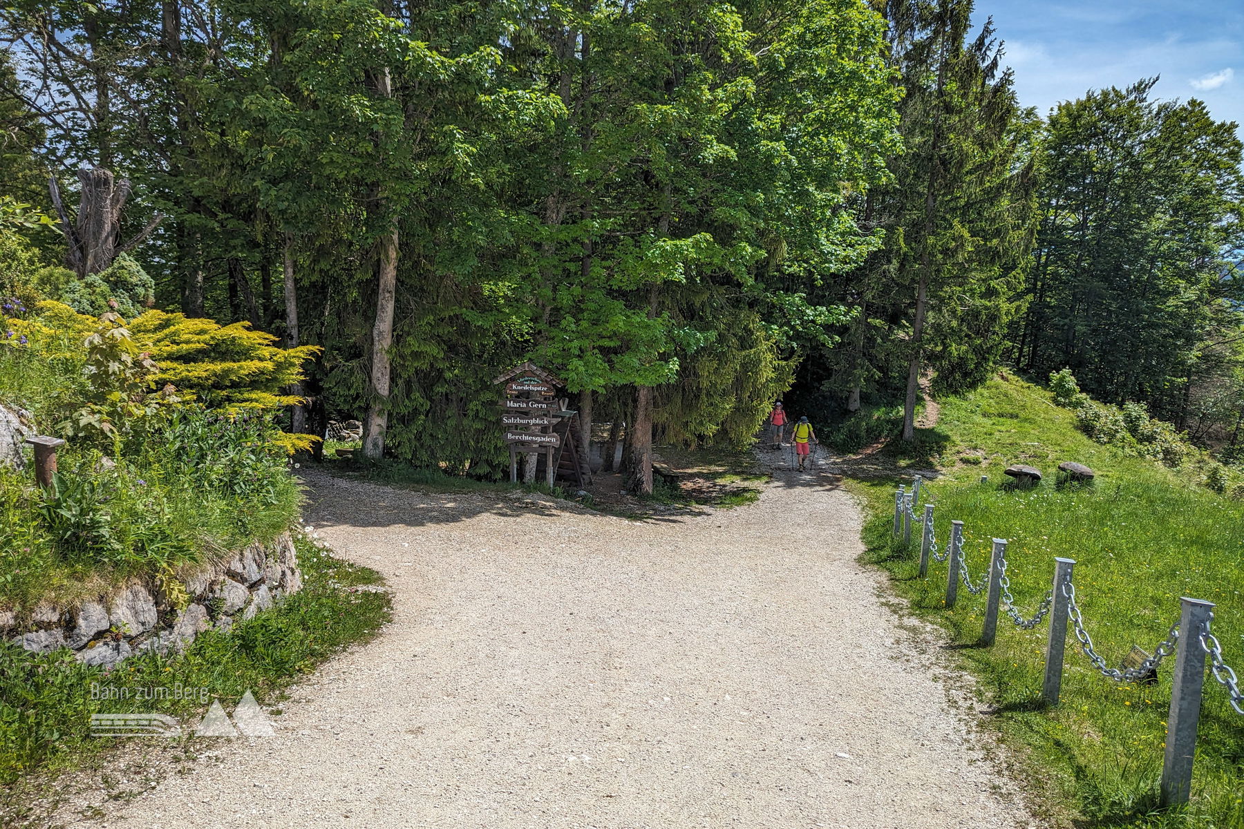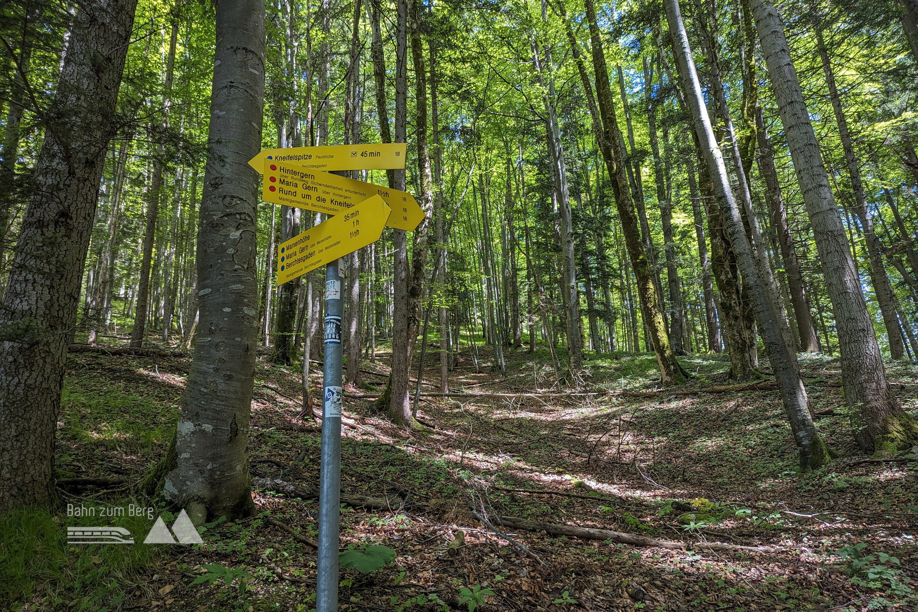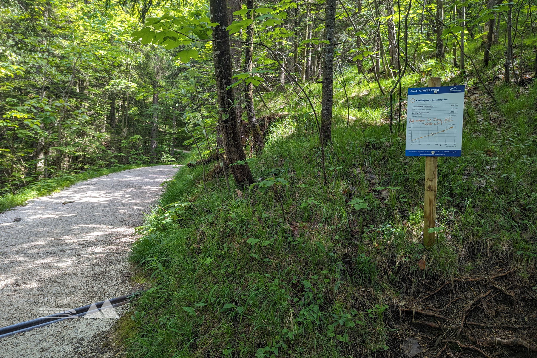 Wir kommen nun auf die meistbegangene Wegsstrecke zur Kneifelspitze, da der Wanderweg von Maria Gern dazustößt. Der Weg ist nun wieder ein breiter Forstweg. Da der Weg hoch zur Kneifelspitze eine sogenannte “Puls-Fitness.Tour” vom Bergerlebnis Berchtesgaden ist, sind im Abstand von 100 Höhenmetern Infotafeln zur Wegstrecke mit kleinen Tipps angebracht.