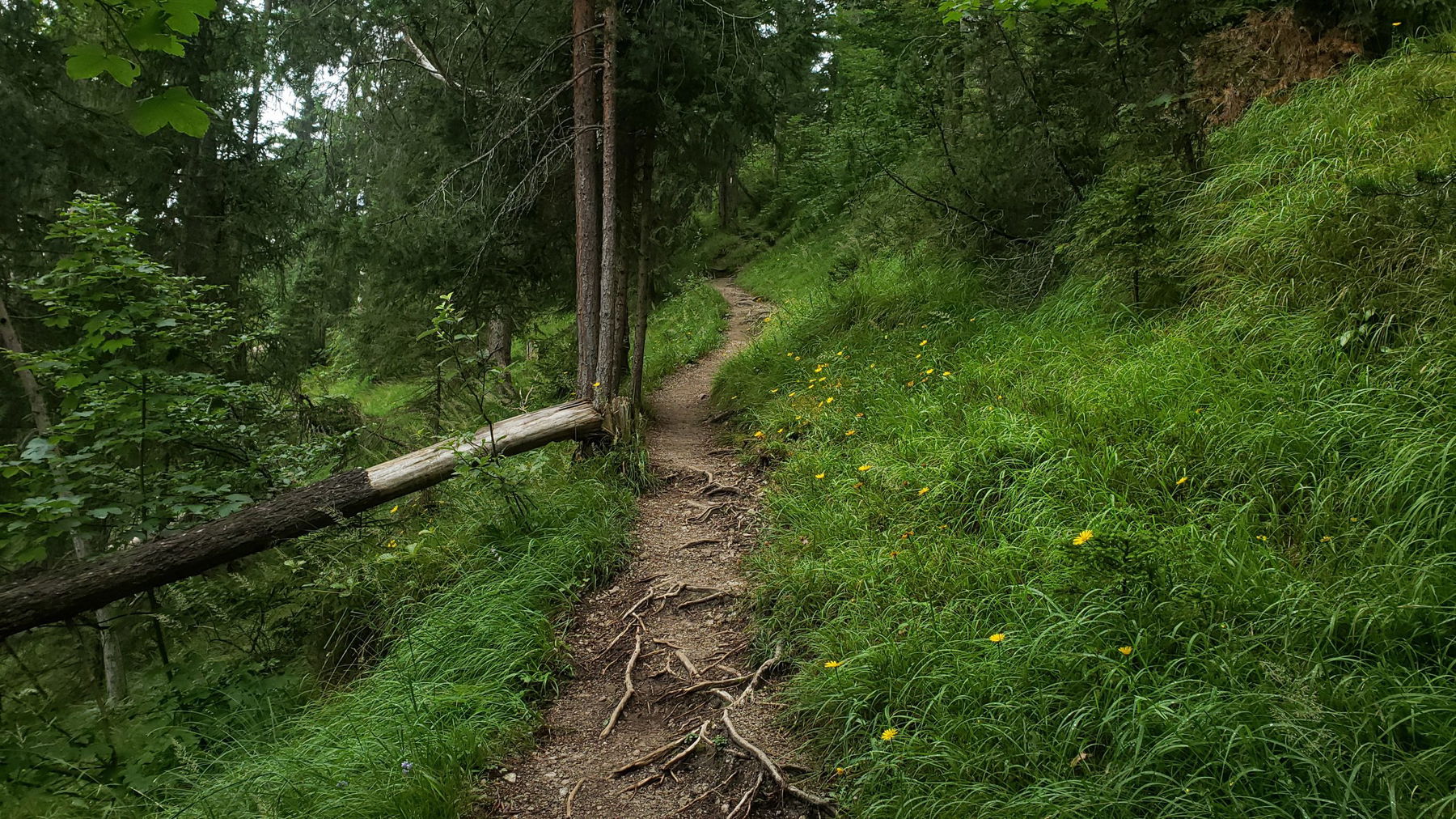 Der Normalweg führt ab hier stetig steil bergauf, durch dichten Wald der immer wieder Blicke ins Tal freigibt. Zum Verschnaufen laden einige schön gelegene bzw. schattige Bänke ein.
