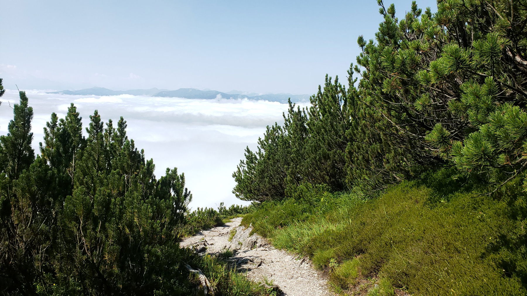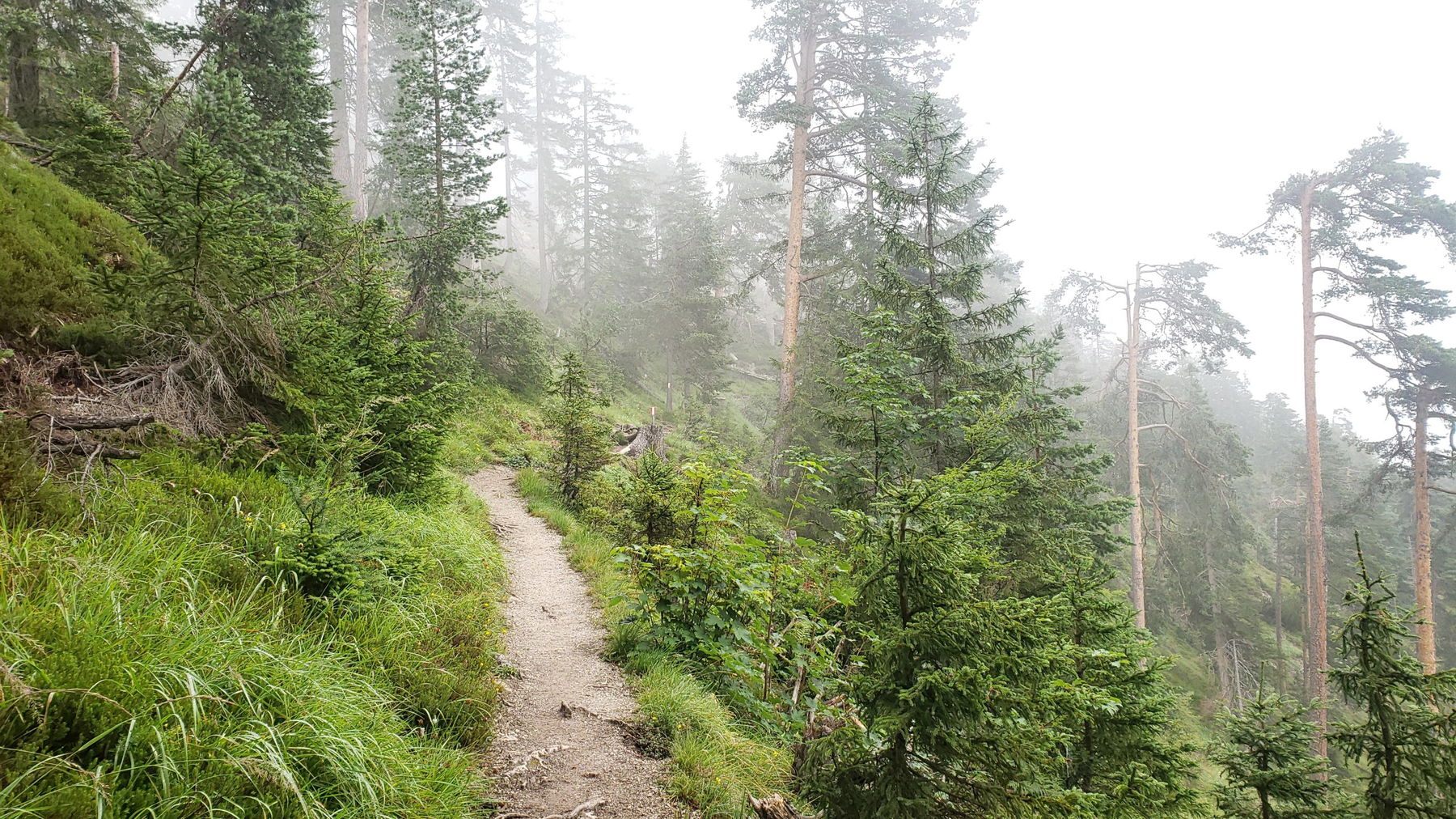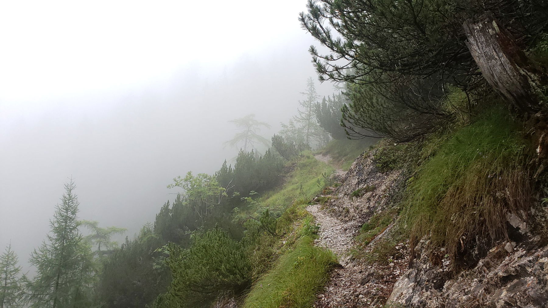 Kurz vor dem Kreuzweg und Beginn des Jagasteiges wird der Hochnebel heute dichter und Hoffnung kommt in mir auf, dass die Peter Wiechenthaler Hütte bereits in der Sonne liegt.