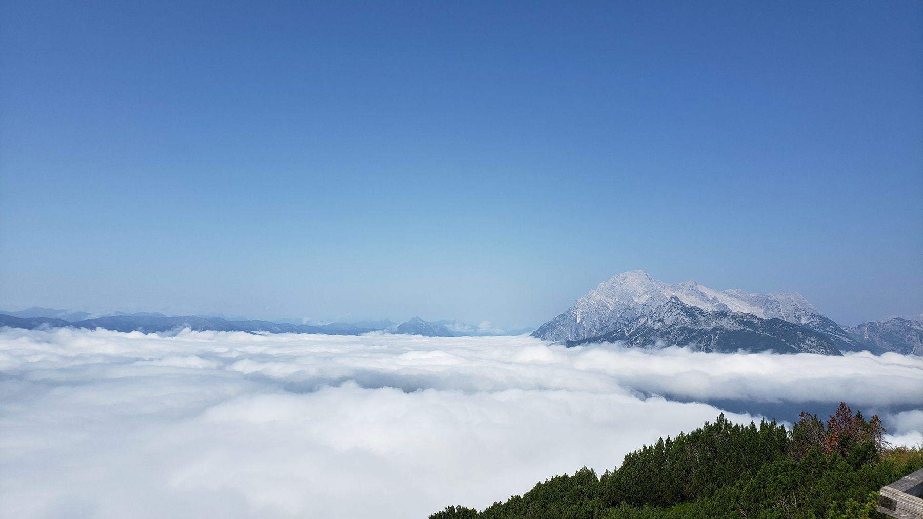 Oben angekommen strahlt nun die Sonne und ich blicke auf das Saalfeldener Becken im Hochnebelmeer sowie die darüber thronende Peter Wiechenthaler Hütte.