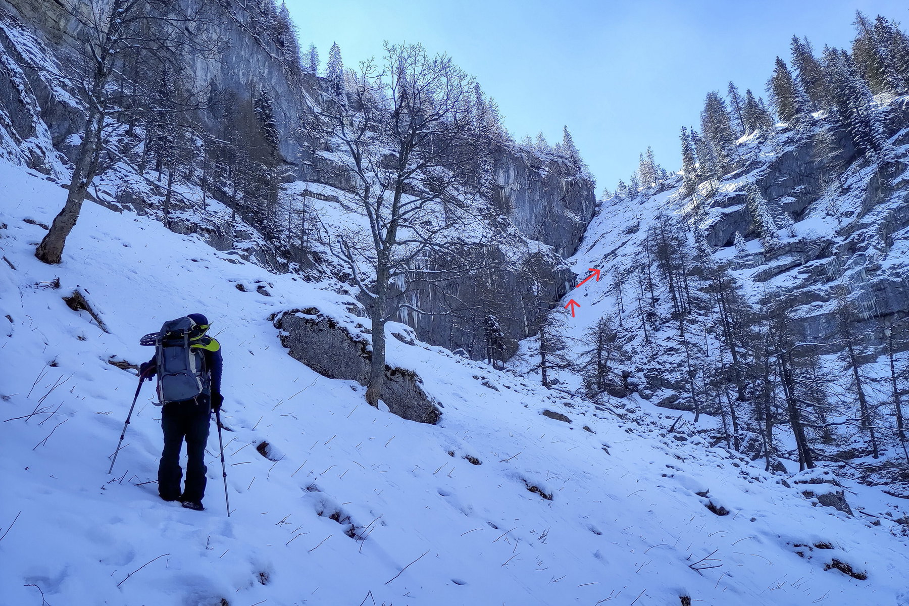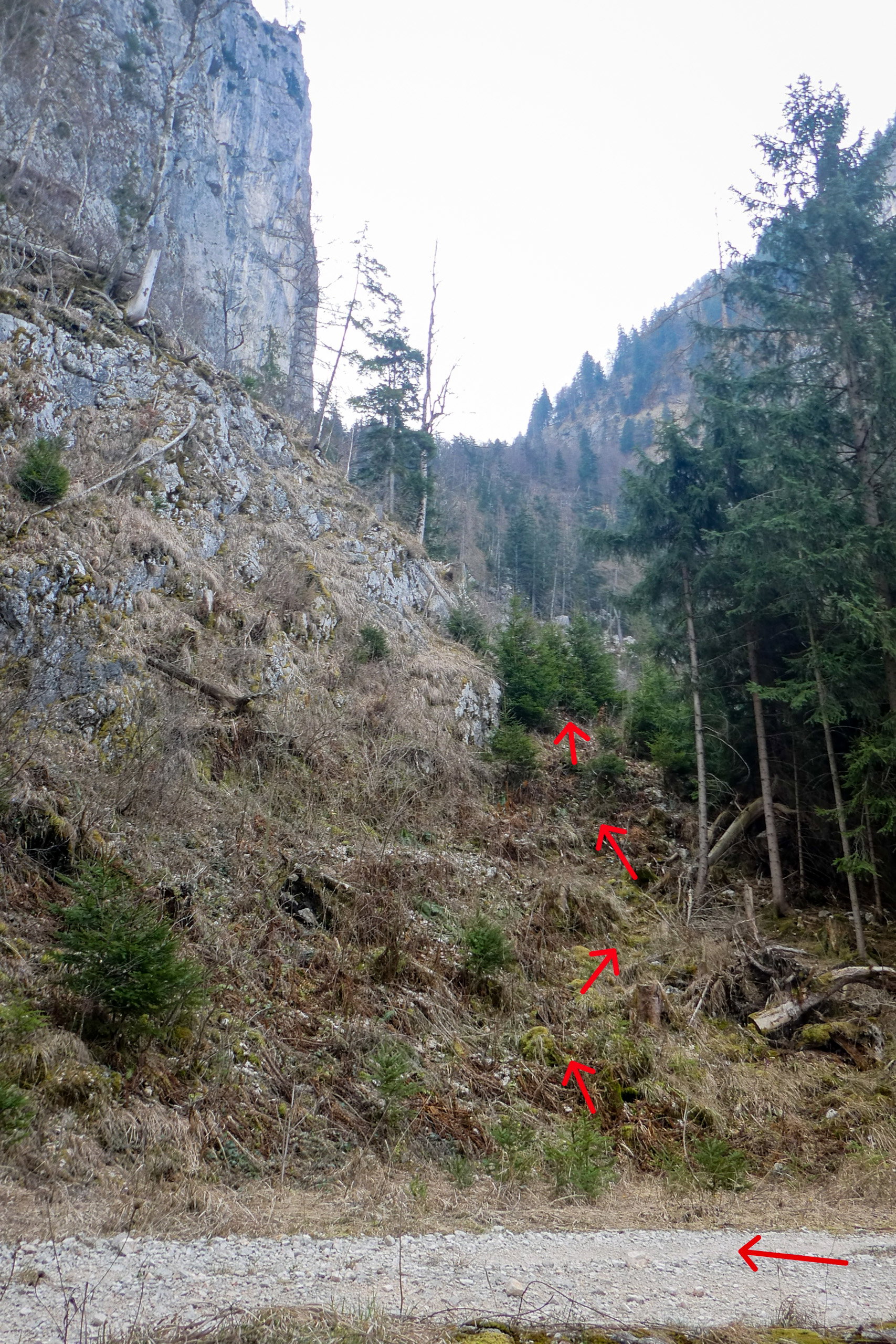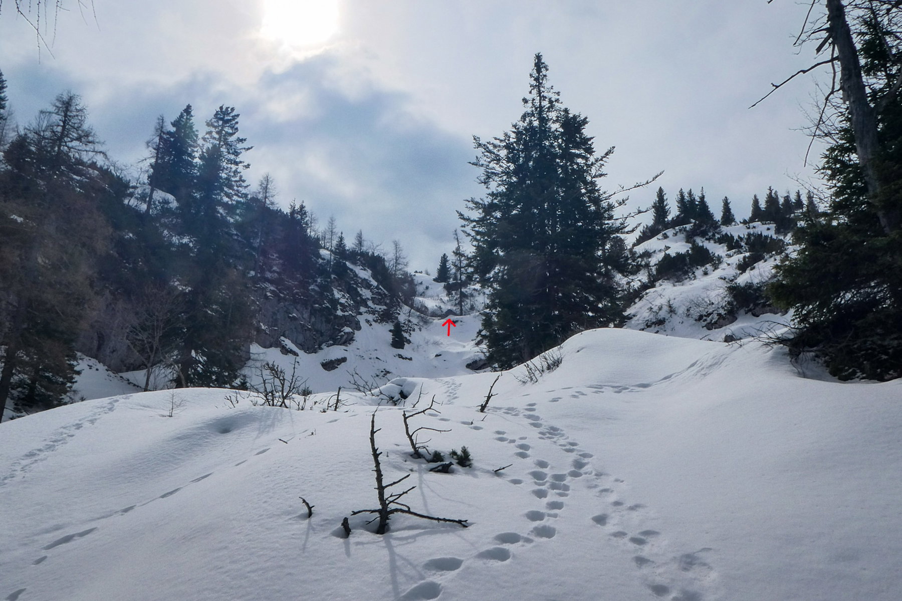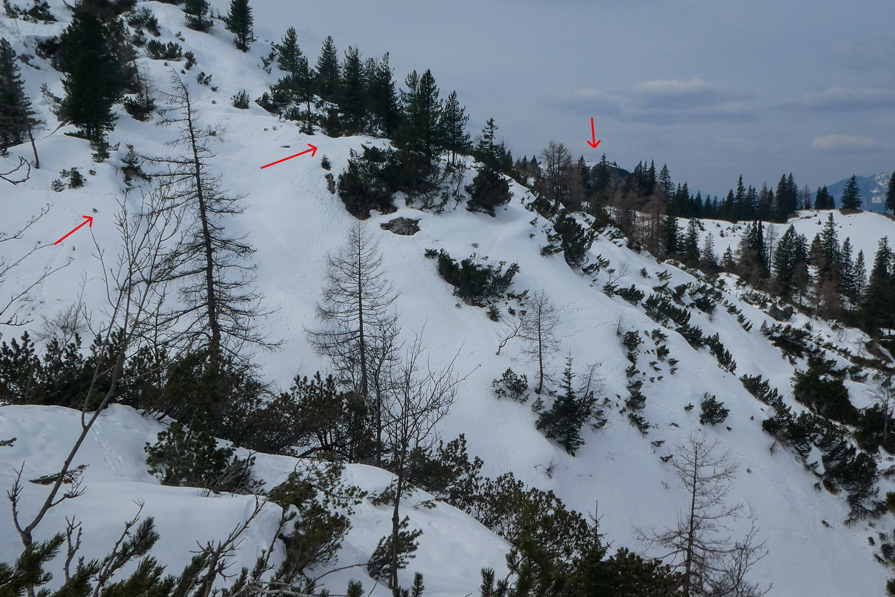 Von dieser Nische empfehle ich, weiter anzusteigen, bis etwa 1.250 Meter, und erst dann nach rechts zu queren, wobei man mit etwas Glück Steigspuren/Wildfährten nutzen kann. Man hält sich immer oberhalb der letzten Bäume, die vielfach von Lawinen und Steinschlag gezeichnet sind.