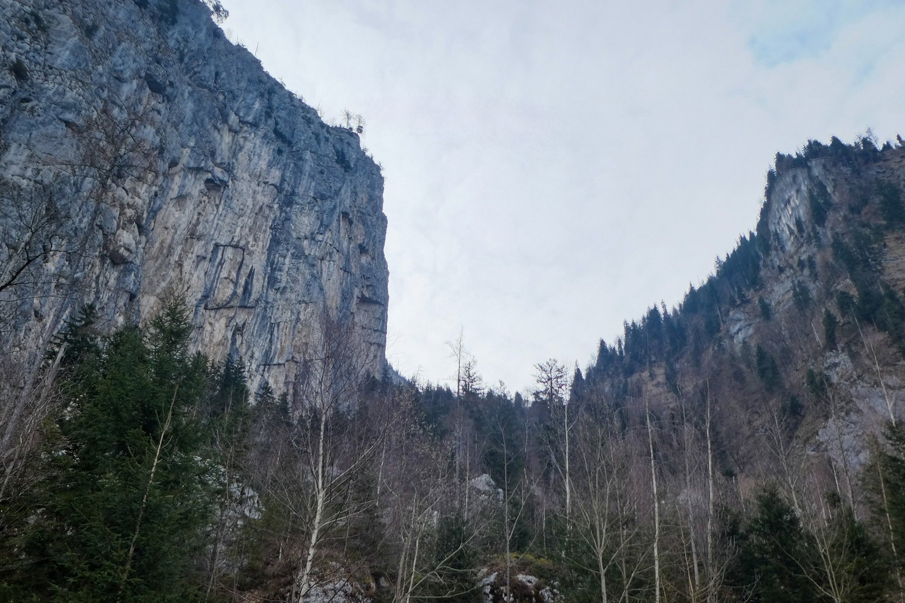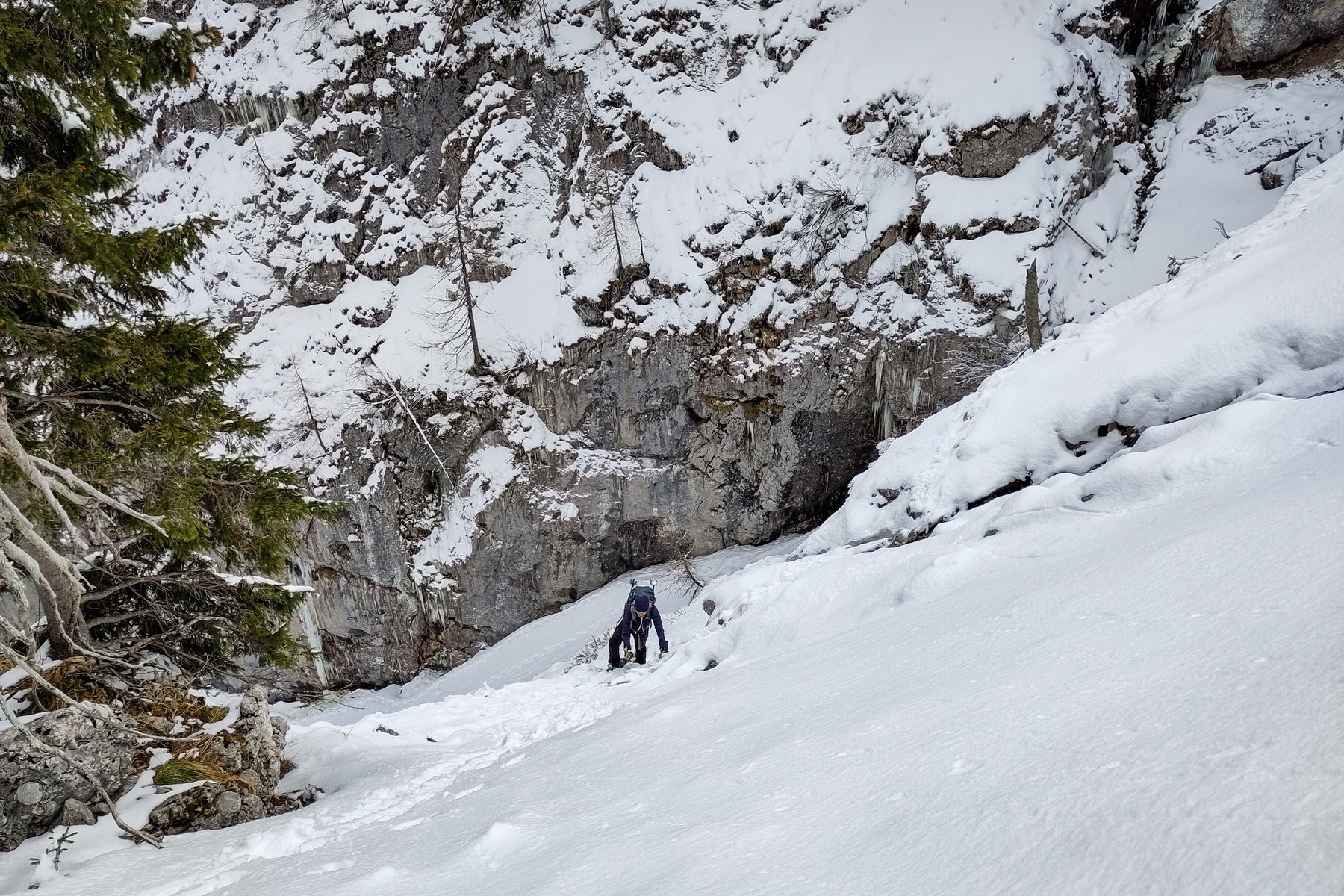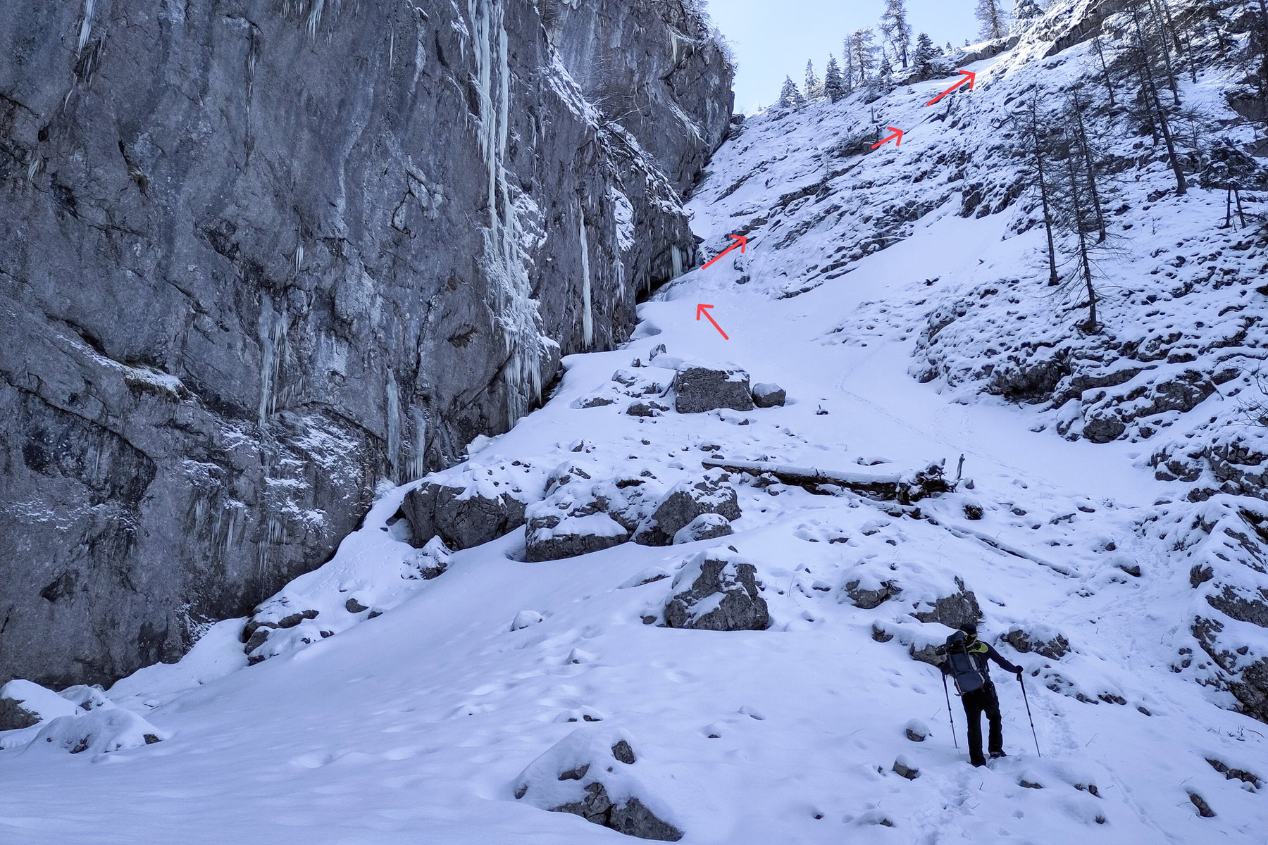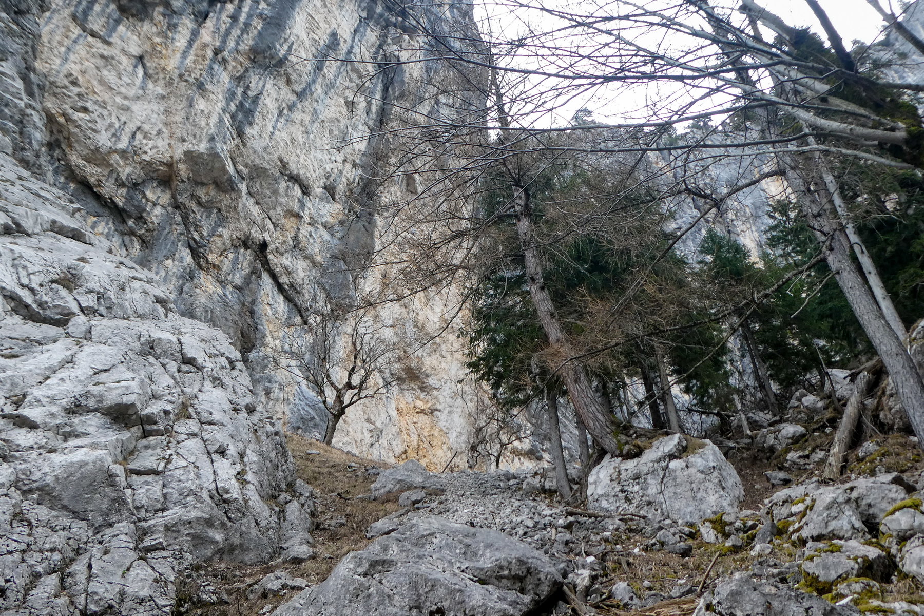 Von dieser Nische empfehle ich, weiter anzusteigen, bis etwa 1.250 Meter, und erst dann nach rechts zu queren, wobei man mit etwas Glück Steigspuren/Wildfährten nutzen kann. Man hält sich immer oberhalb der letzten Bäume, die vielfach von Lawinen und Steinschlag gezeichnet sind.