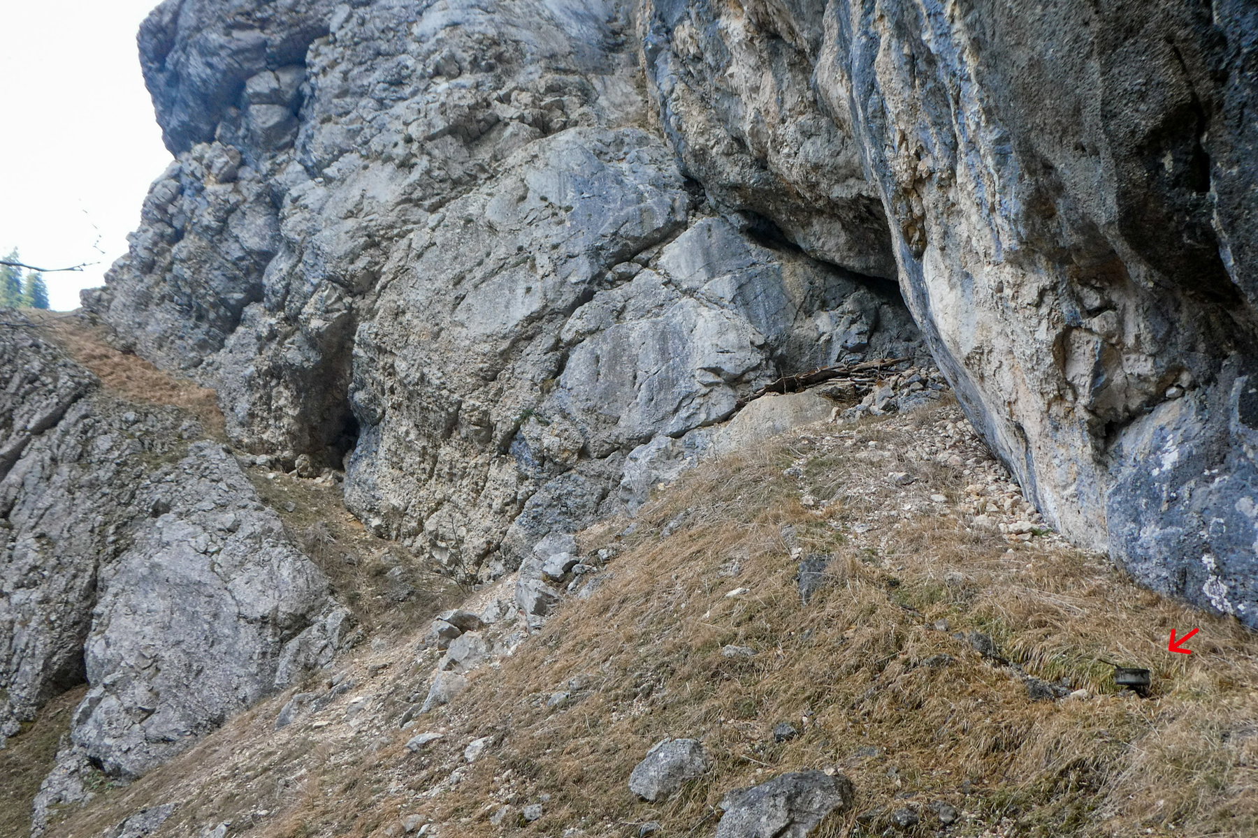 Dann: Im noch steileren Gelände (40-45°; je nach Vegetation mal nahe der Felswand, mal mehr im Wald – man muss sich den Weg nach eigenem Gutdünken und eigenen Vorlieben suchen) aufwärts zu einer – offenbar von Untersberg-Vagabunden immer wieder genutzten – Nische.