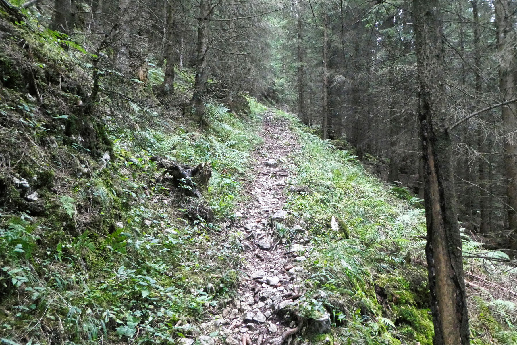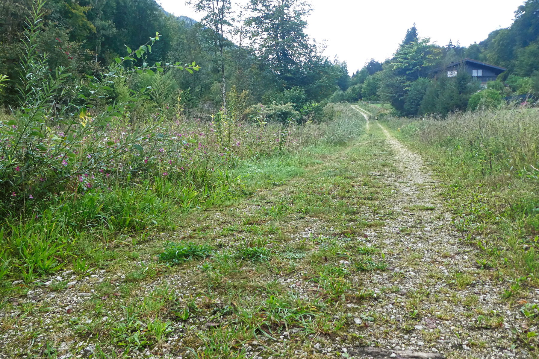 und bald erreicht man leicht ansteigend die Skipiste, der man nun folgen muss; der alte Steig ist durch die breite Abfahrt zerstört worden – bis auf ein kleines Stückchen knapp unterhalb der Schweigmühlalm, das man problemlos auch ohne archäologische Kenntnisse finden und nutzen kann (GPX-Track).