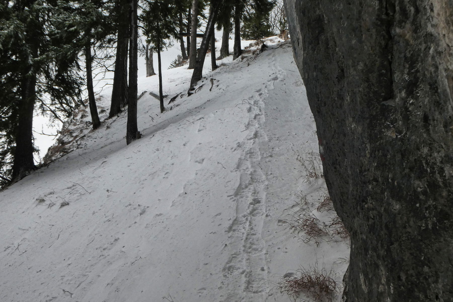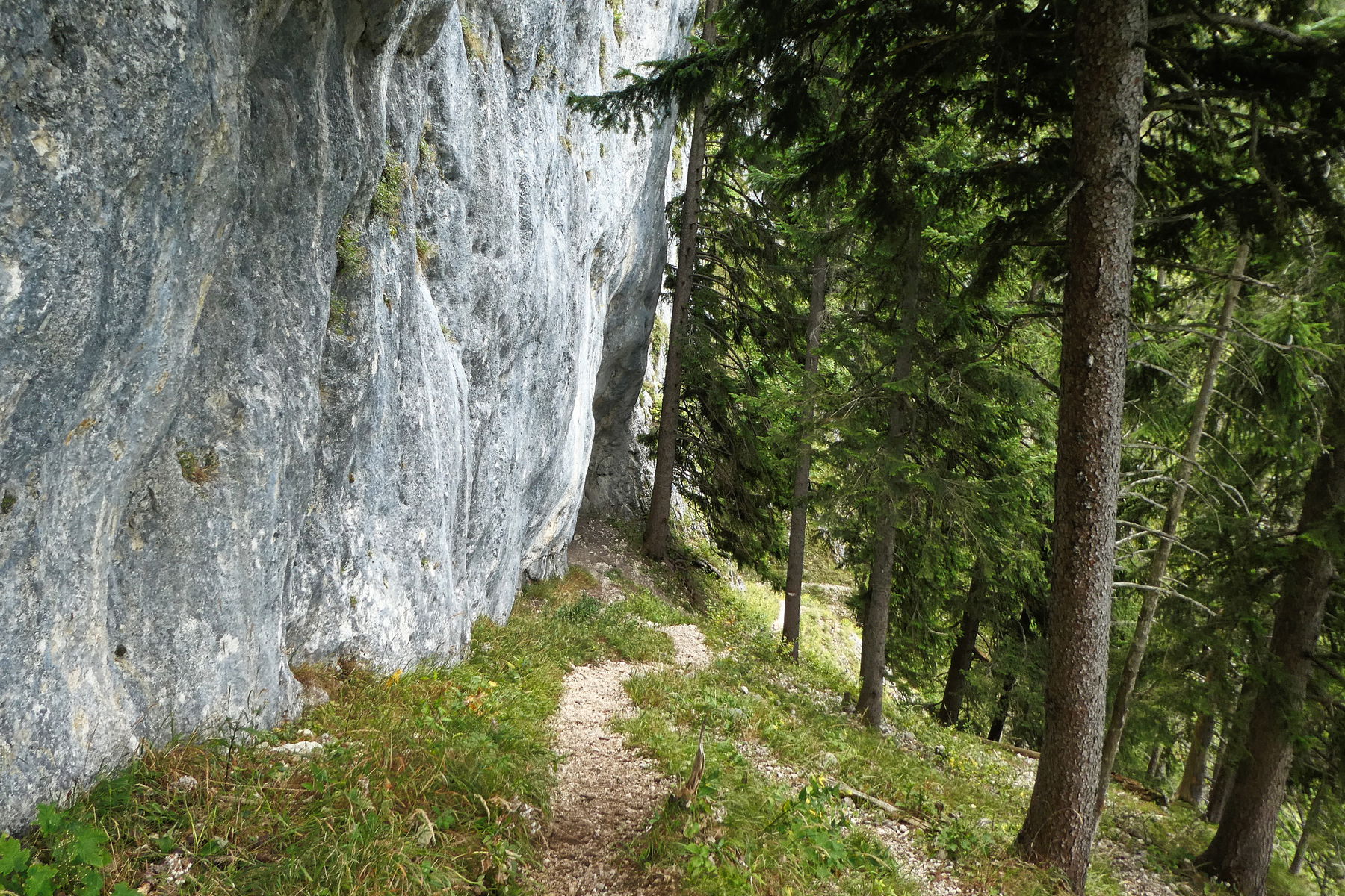 Nun folgt ein kurzer Abstieg auf schmalem, felswand-geschütztem Pfad