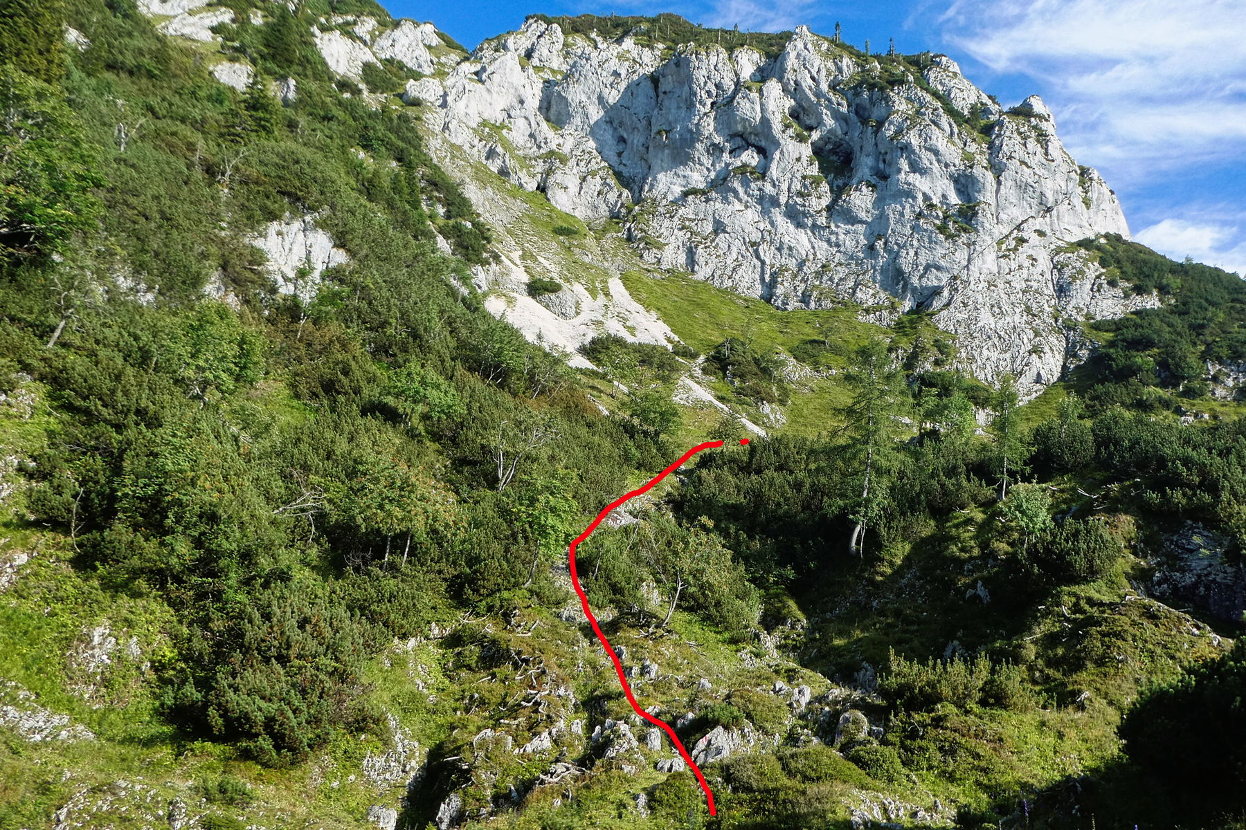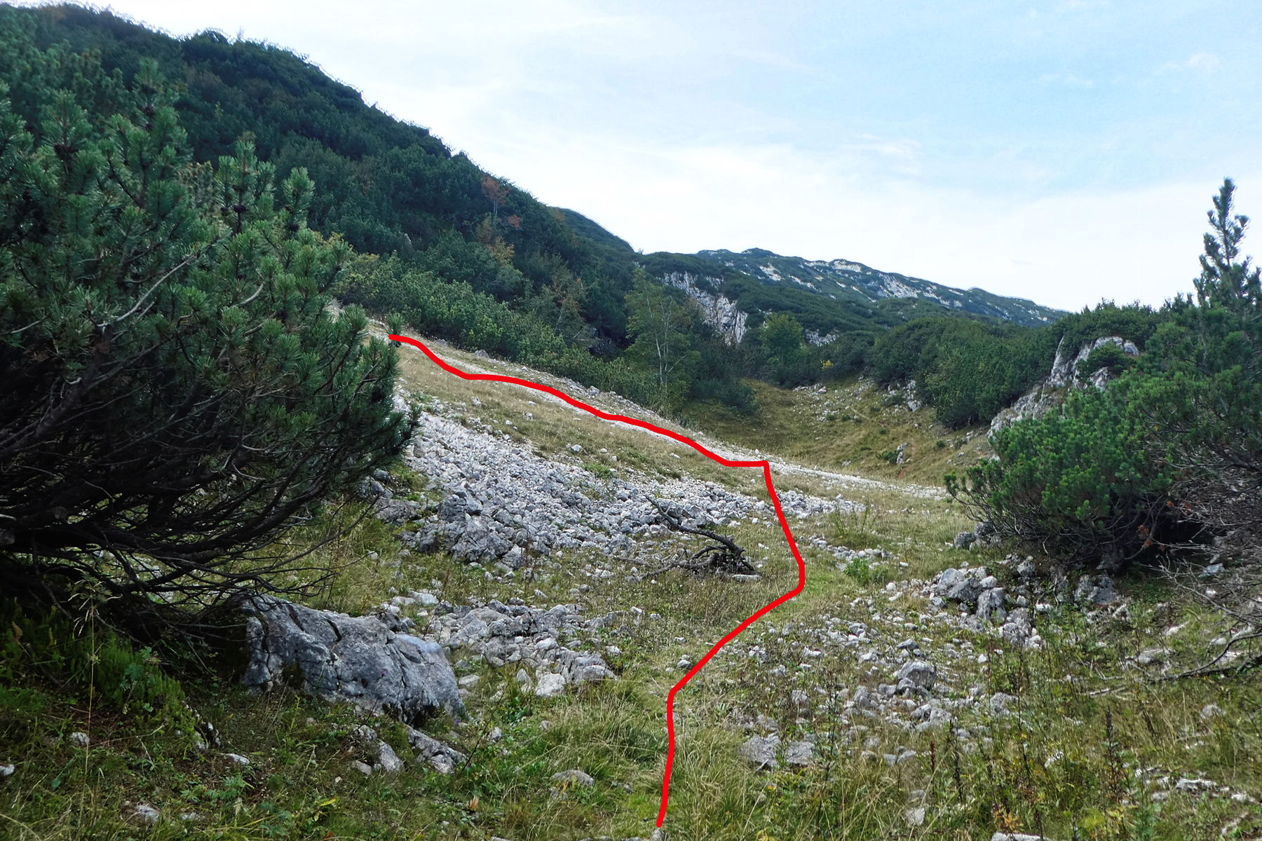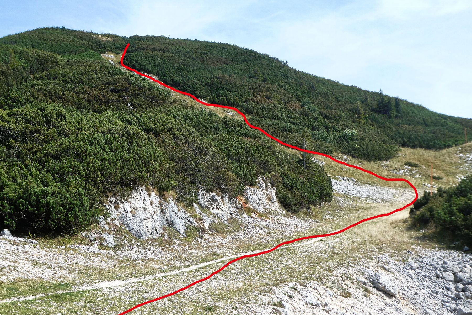 Unseren Weinsteig aber (geradeaus; die verblassenden Markierungen wurden mit grau-schwarzer Farbe unkenntlich gemacht, die Wegweiser wurden entfernt; daher, bei Bedarf GPX-Track) haben die Altvorderen durch Latschengassen und kleine Täler so angelegt, dass wir am „Mückenbründl“ vorbei kommen.