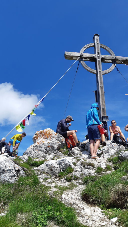 Die Hochiss ist mit 2.299 Metern der höchste Gipfel im Rofan und eigentlich immer gut besucht. Beim Abstieg von der Hochiss wieder ein kurzes Stück den Aufstieg zurück. Es gibt zwar auch einen anderen Weg, dies ist jedoch der Klettersteig auf die Hochiss.