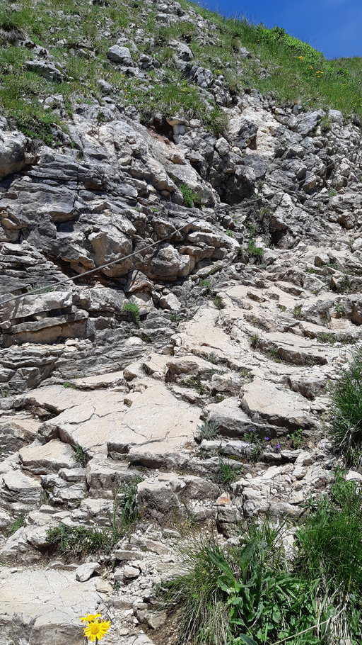 Es gibt hier nochmals einen Abschnitt, wo wir über sehr steiles, felsiges Gelände rauf müssen. Doch auch dieses Teilstück hat eine Seilversicherung. Es ist allerdings eine Engstelle, an welcher sich gerne die Wanderer stauen. Zeit lassen und nicht die Nerven verlieren.