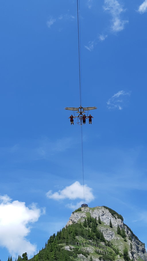 Ein kurzes, aber flaches Stück unterhalb des Gschöllkopfs ist nochmals seilversichert. Es führt über abgenutzte Steinplatten. Unweit der Bergbahn hören wir ober uns kreischen. Es sind die Passagiere des AirRofan, welche zuerst rückwärts dem Seil entlang auf den Gschöllkopf raufgezogen werden und dann mit einem Ruck gegen Tal sausen.