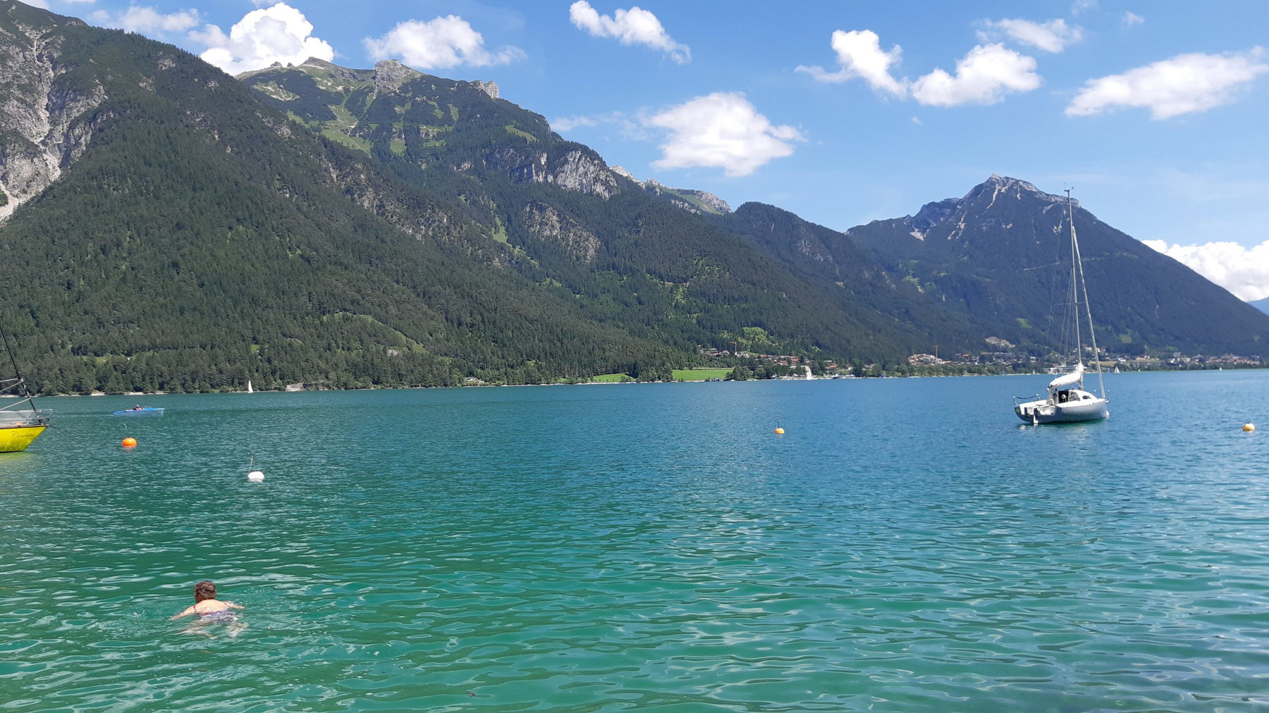 Und dann heißt es nur mehr kurz überwinden, denn der Achensee gehört zu den kühleren Badeseen in Tirol. Einmal drin, ist es aber traumhaft schön. Noch etwas Zeit für Pertisau und dann mit dem nächsten Bus wieder nach Jenbach und ab nach Hause.