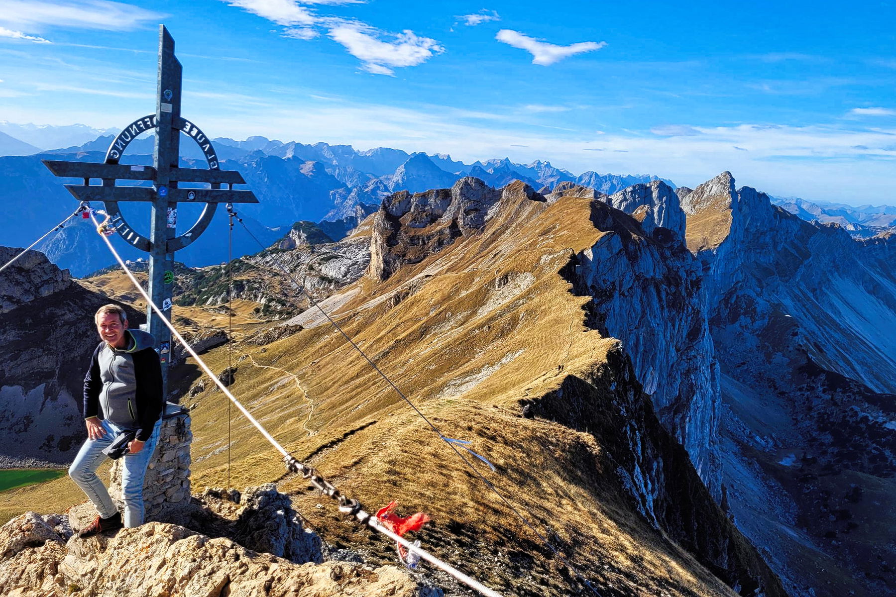 Rechts neben der Rofanspitze sieht man den Sagzahn und das Vordere Sonnwendjoch (2.224 Meter), wo auch ein schöner Höhenweg hinüberführt (Verlängerungsoption!). Mehrere Pfade führen auf die frei stehende Rofanspitze (2.259 Meter) mit ihrem herrlichen Rundumblick. Ich empfehle, erst den Gipfel auf dem Hauptweg zu unterqueren, dann von Osten hinaufzusteigen, um dann nach Westen über den Gratweg zurück zur Grubascharte zu wandern.