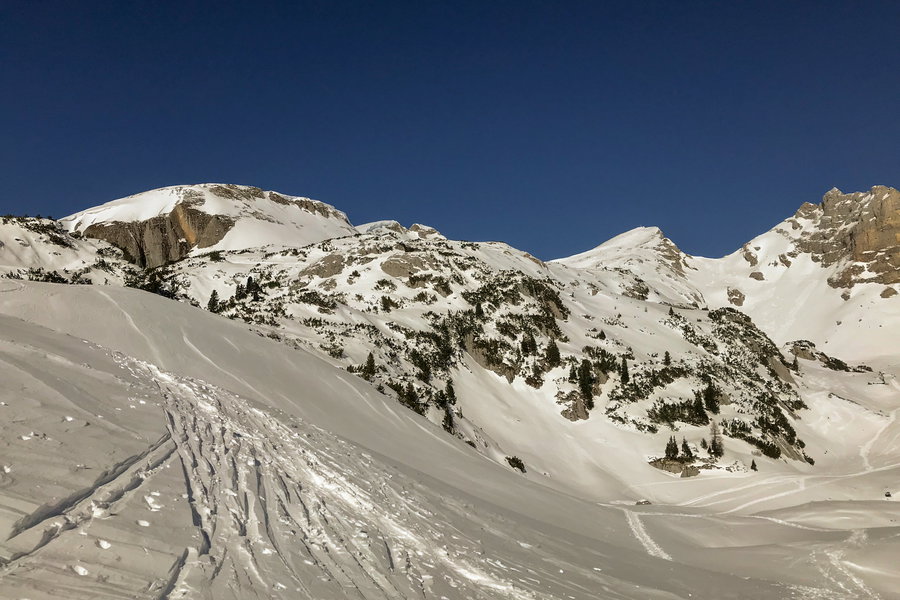 Danach geht es westlich der Haidachstellwand wieder ein Stück bergauf. Über einen weiten Westhang fährt man schließlich bergab, bis man in lichtem Wald auf die Piste des Skigebietes Maurach am Achensee trifft und dieser bis zur Talstation, dem Ausgangspunkt, folgt.