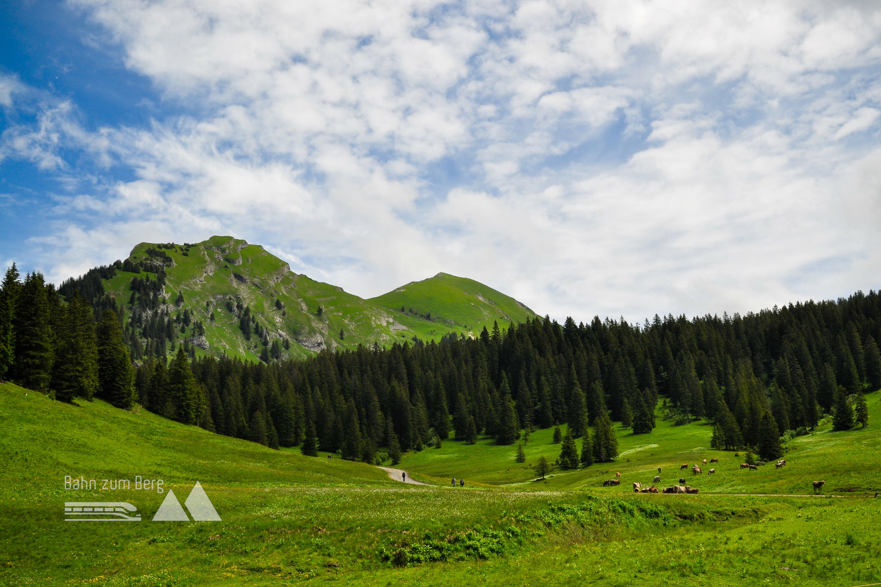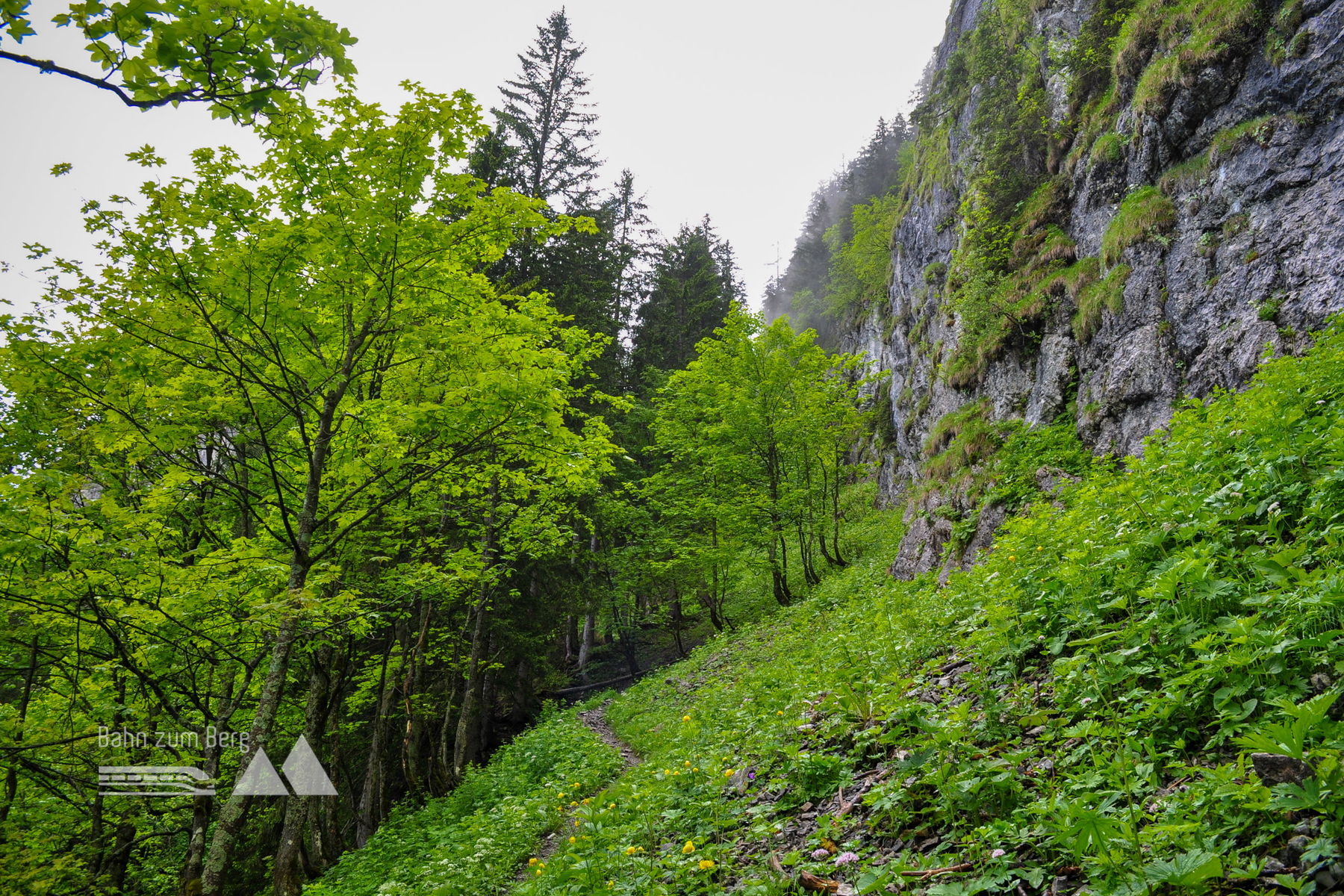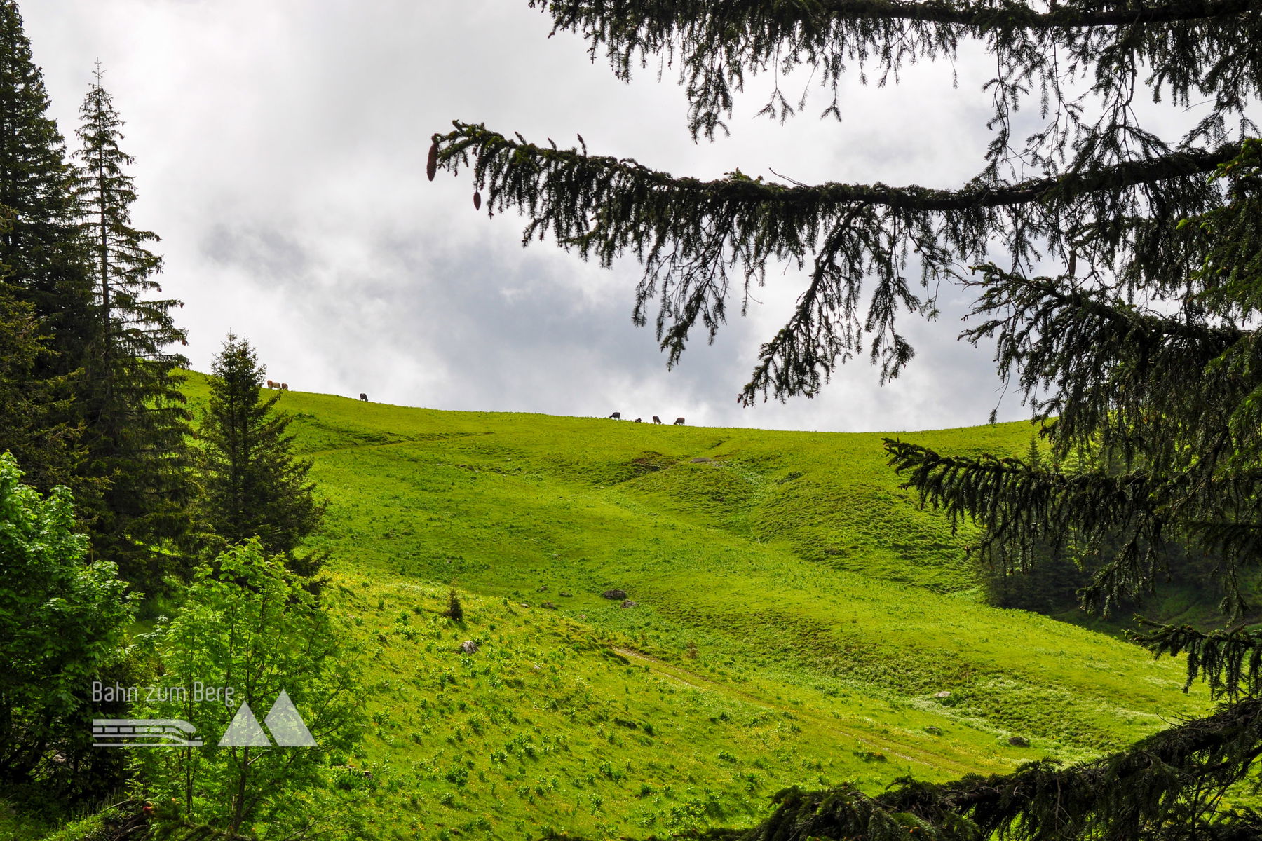 Bald schon sind die ersten Felswände zu sehen, zwischen denen der Wanderpfad hinaufführt. Nach einer guten weiteren Stunde treffen wir auf dem Bergrücken der Kanisfluh ein und sehen schon von weiterem die Kühe auf der Wurzachalpe.