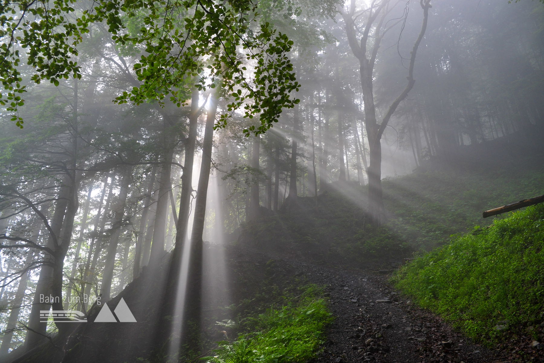 Zuerst gehen wir einige Meter einen Forstweg, anschließend einen steilen Wanderpfad entlang, der in Serpentinen den Berg hinaufführt. Der Regen der letzten Nacht treibt die Salamander heraus und bei jedem Tritt achten wir darauf, auf keinen zu treten. Nach gut einer Stunde erreichen wir die Hofstätter Alpe, bei der wir dann über eine schmale Brücke über den Alpbach queren.