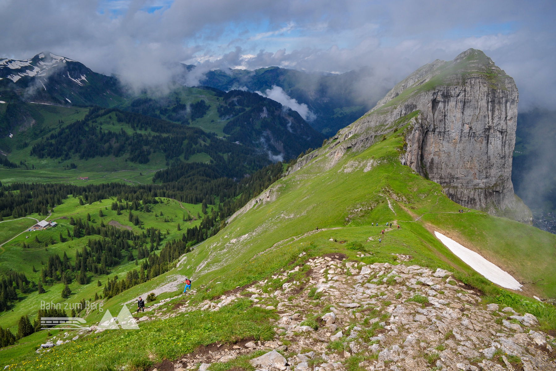 Blick auf das Kanisfluhmassiv, auf die Holenke (der grüne Grashügel rechts) geht’s jetzt rauf. Foto: Norman und Lisa