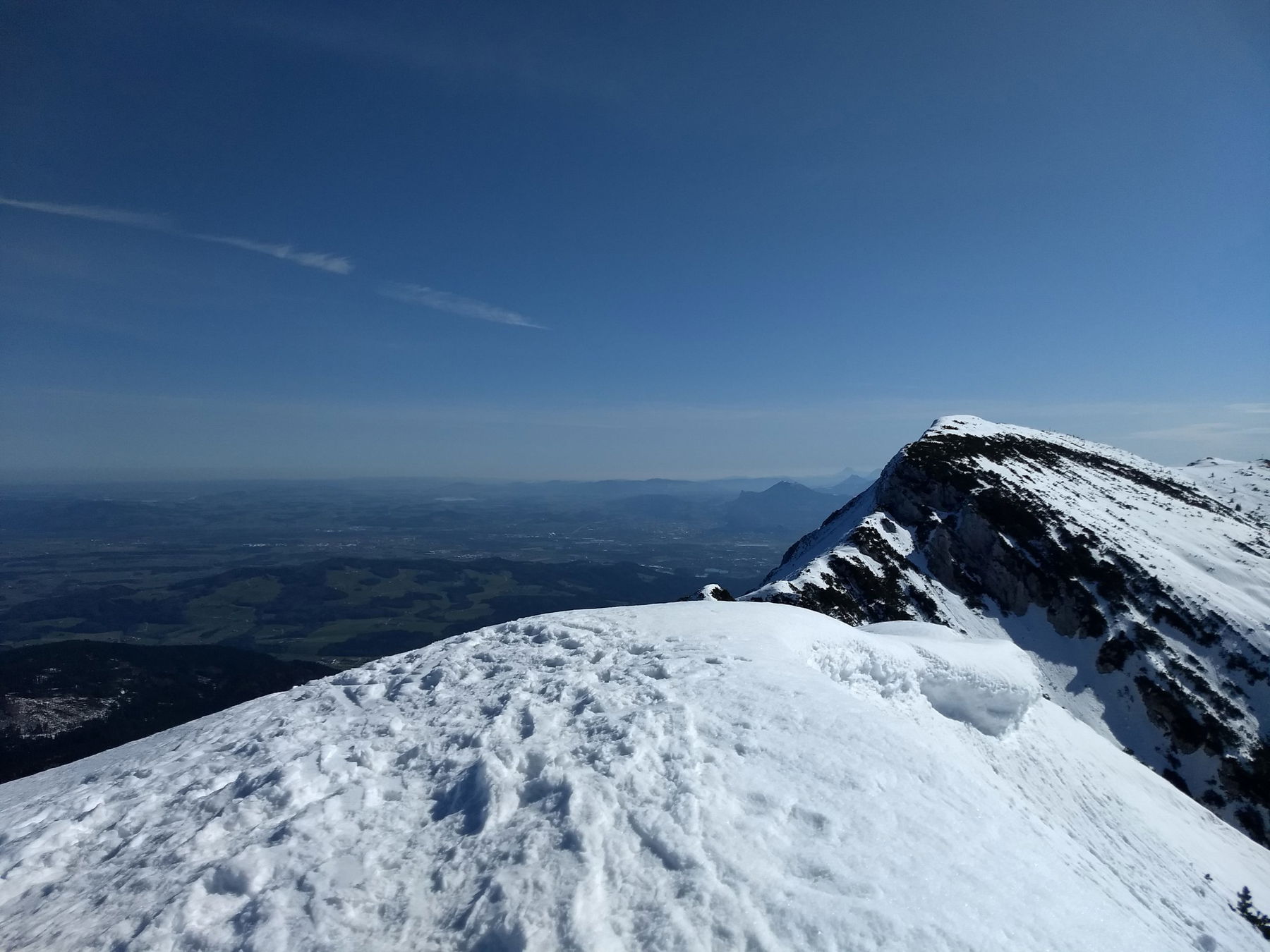 Nun ist es nicht mehr sehr weit zum ersten bereits sichtbaren Gipfel des Gamsknogel, dessen latschenbewachsene Westflanke noch überwunden werden muss. Vom Gipfel bietet sich eine hervorragende Rundumsicht. Besonders beeindruckend ist der Blick auf die nahen Berchtesgadener Alpen mit Watzmann, Hochkalter und dem Steinernen Meer. Nicht minder bewundernswert ist die Sicht hinaus ins flachere Land mit den vielen Seen und Flüssen des Alpenvorlands.