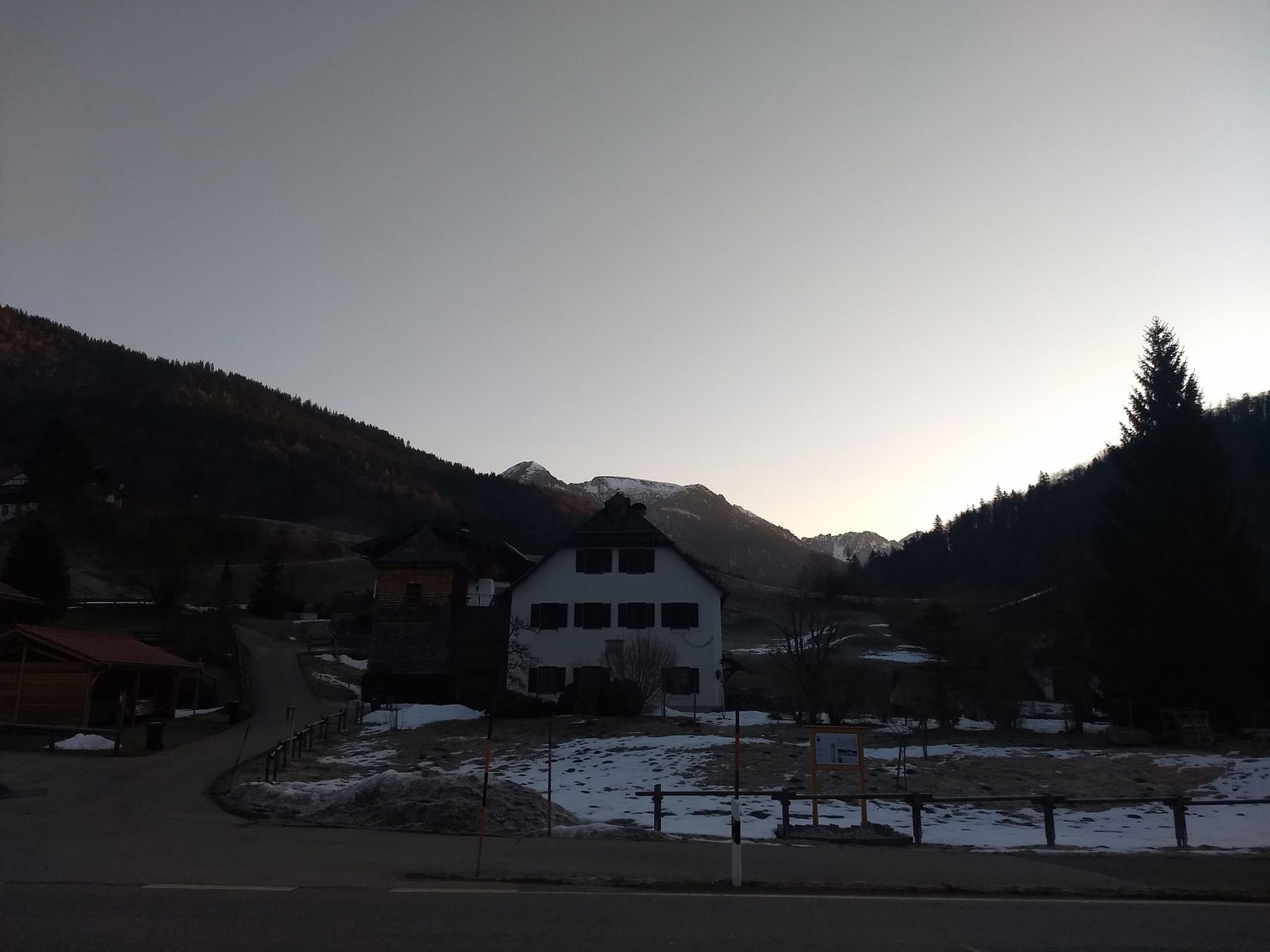 In unmittelbarer Nähe der Bushaltestelle kann bereits die Bundesstraße verlassen werden. Schon bald lässt man die Häuser von Weißbach hinter sich und erreicht schnell einen links von der Straße abzweigenden Forstweg. Dieser zieht sich ansteigend am Hang entlang und schon bald wird ein Aussichtspunkt mit überdachter Bank erreicht.