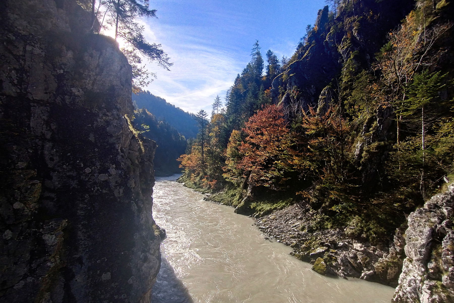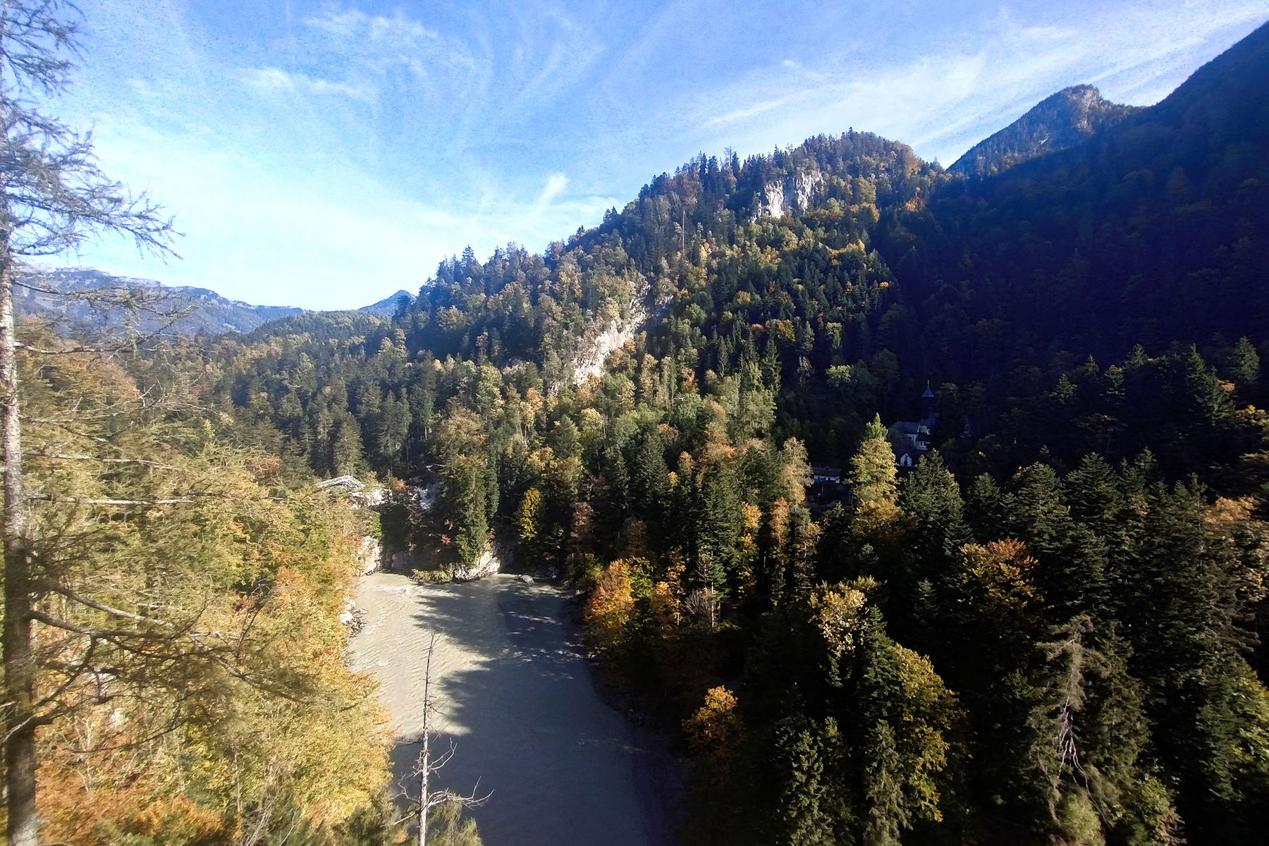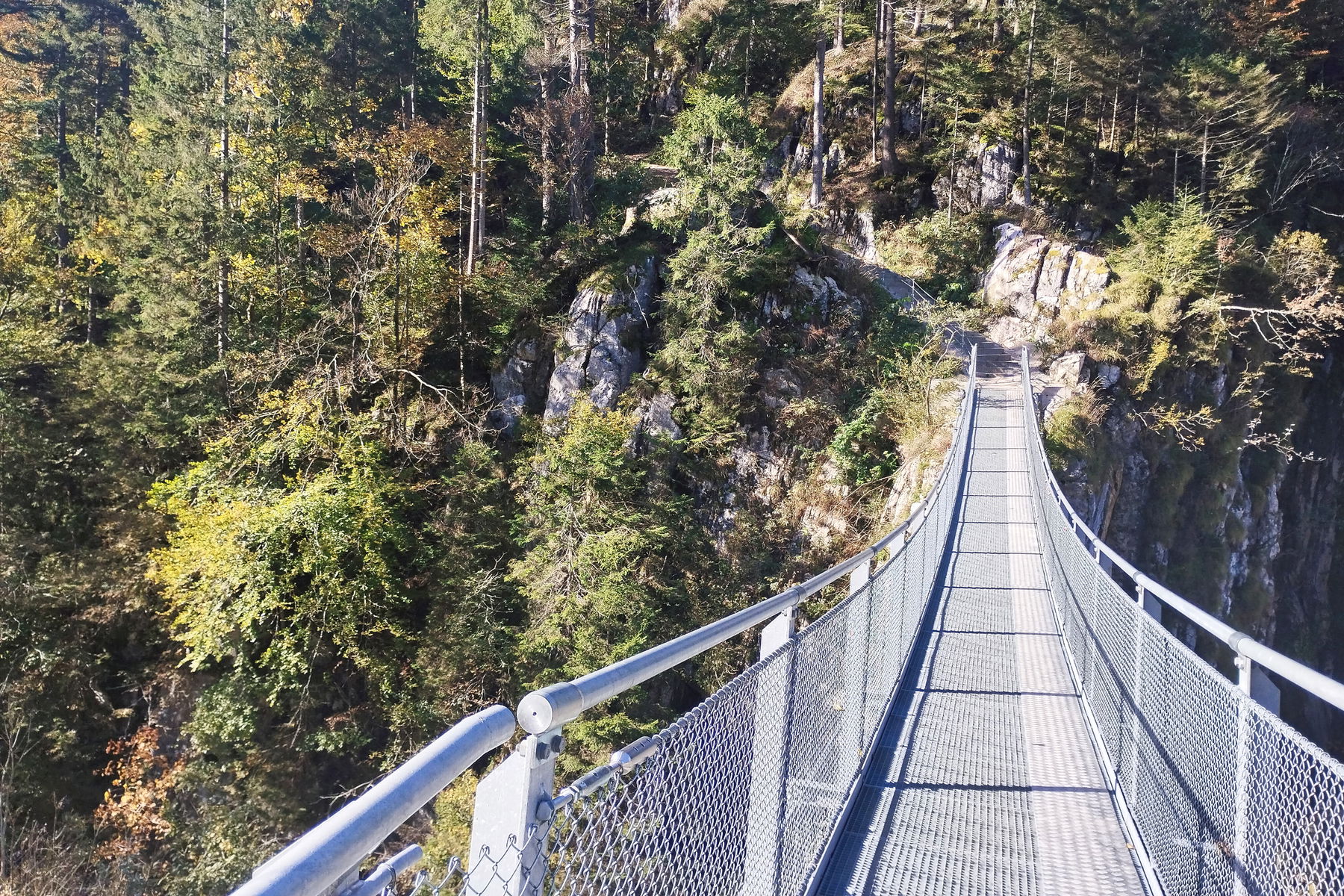 Nach einiger Zeit erreichen wir eine Abzweigung und wenige Meter unterhalb befindet sich ein Aussichtspunkt, der interessante Tiefblicke zur circa 100 Meter tiefer liegenden Ache gewährt. Wir folgen dem Weg weiter bergab und überqueren schließlich auf einer recht wackeligen Hängebrücke den wilden Fluss. Auf der anderen Seite spitzt schon das Wallfahrtskirchlein und die direkt unterhalb gelegene Wirtschaft durch die Bäume.