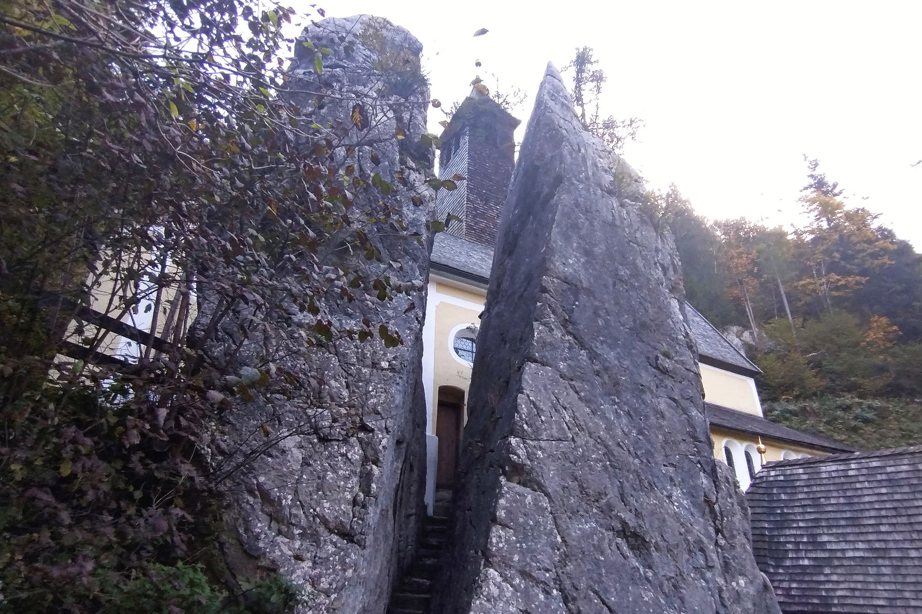Etwa 50 Meter oberhalb der Ache versteckt sich im Wald ein kleines Kirchlein. Direkt davor liegt der bereits erwähnte gespaltene Fels („Klobenstein“). Der Weg durch den Spalt zur Kirche ist obligatorisch. Die oben genannte Sage, die sich um diesen Ort rankt, findet sich hier. In den Wintermonaten erreichen diese Stelle im tiefen Einschnitt der Ache nur wenige Sonnenstrahlen, dafür ist es hier im Sommer angenehm kühl.